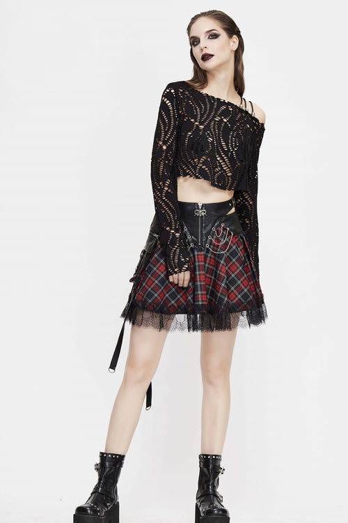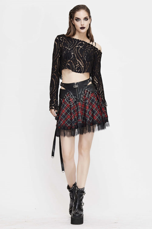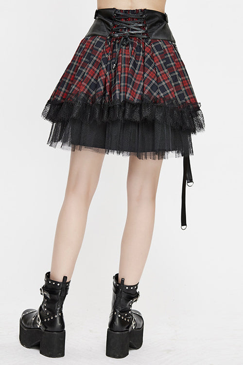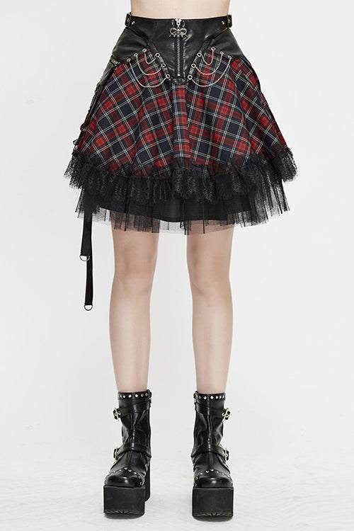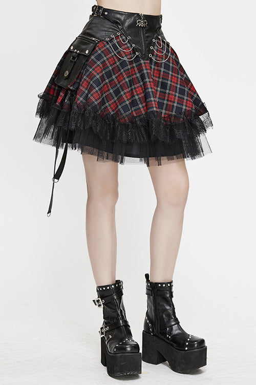 The main material is made of Scottish plaid, the waist is used leather as the ingredients, the left and right asymmetrical design, the right bag can be removed, the middle waist is smocked, pleated on both sides.Self-hung pendant in center front, chain decoration on both sides, rubber band smocked stitched in center back waist, adjustable rope.