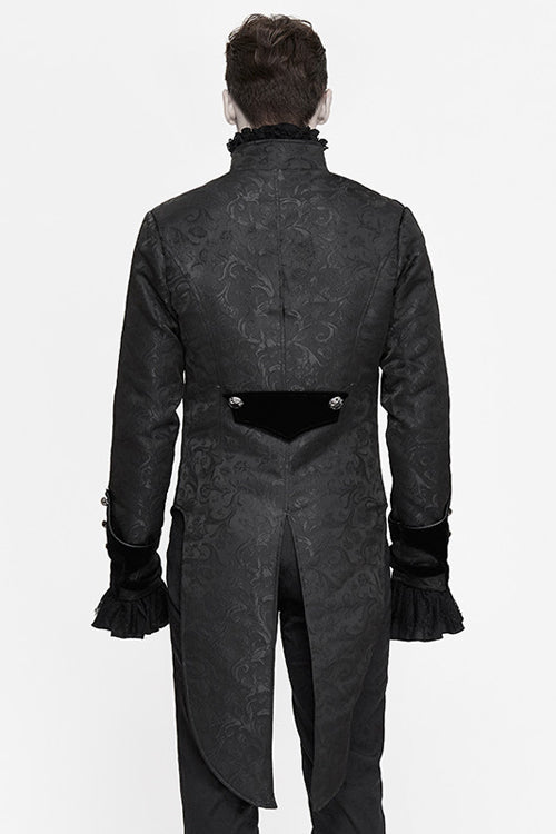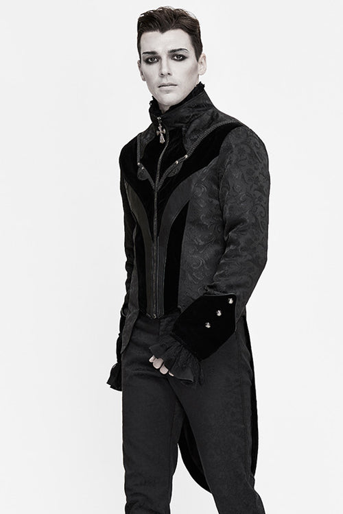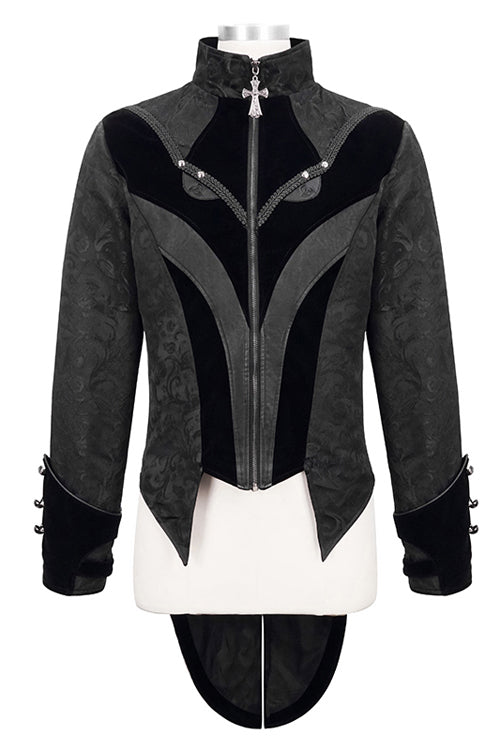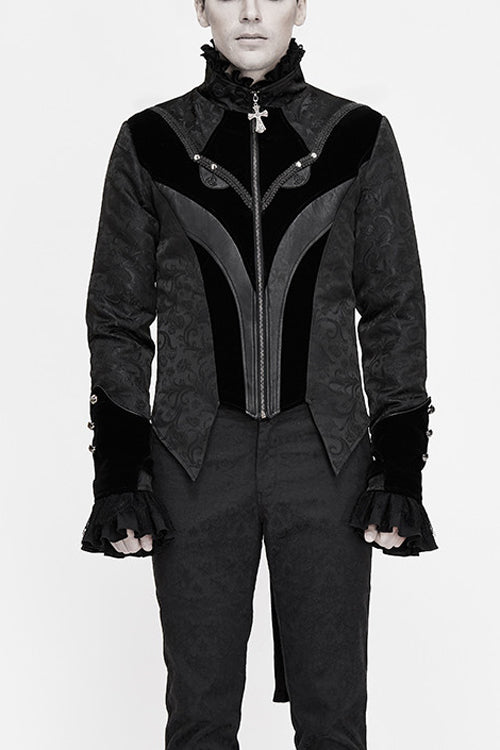 The main material is Gothic jacquard material, the center front crow head design is separated by leather, showing the shape of crow's beak, the eyes are embroidered with leather, and the eyes are decorated with braid and nails.