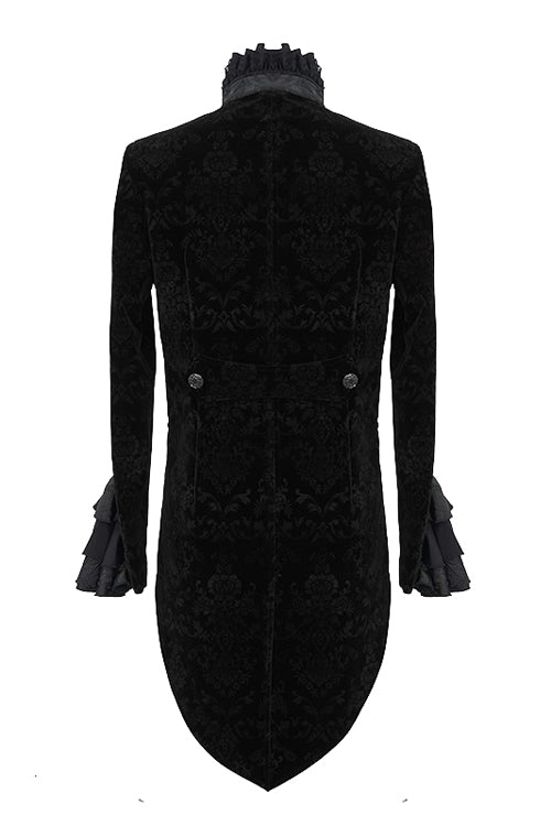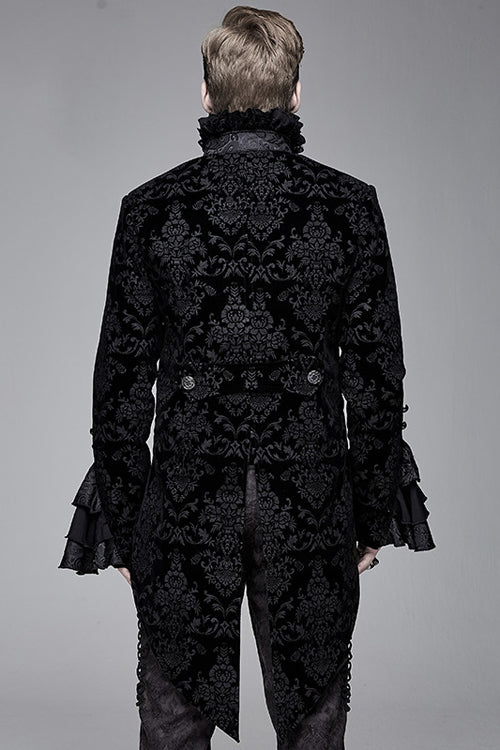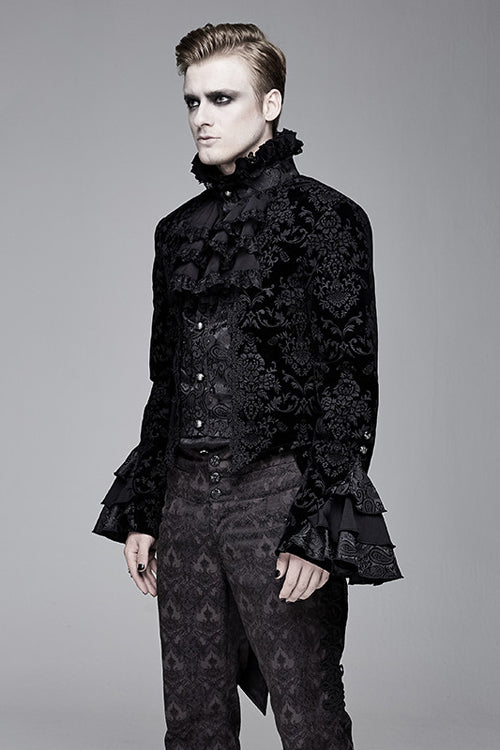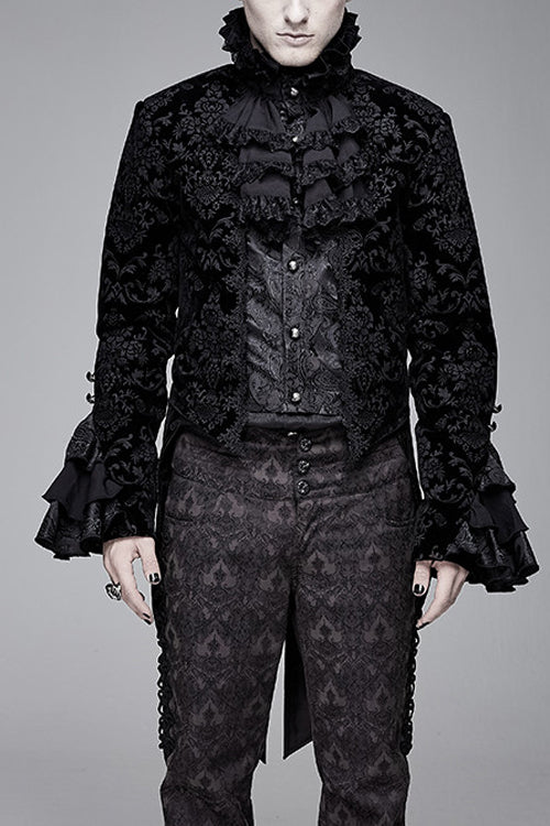 The court pattern flocking printing weft velvet fabric is used to make the coat part, The Paisley jacquard fabric is used to make the shirt part.