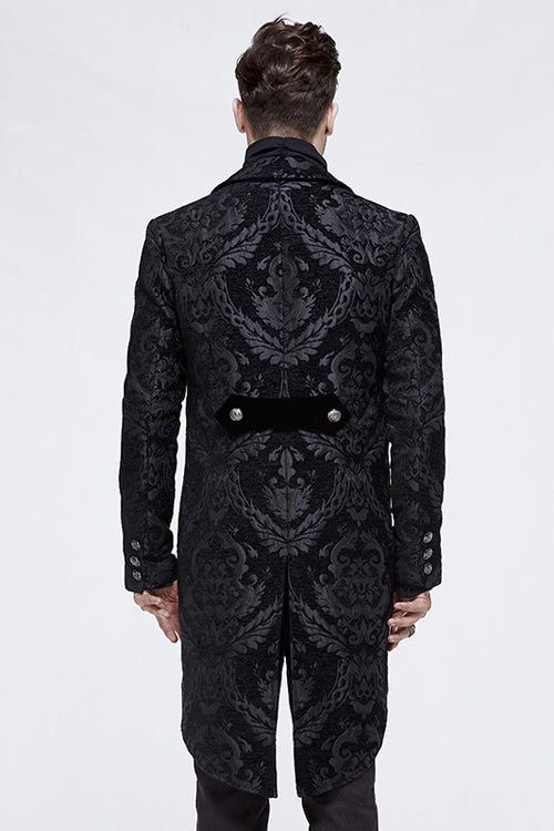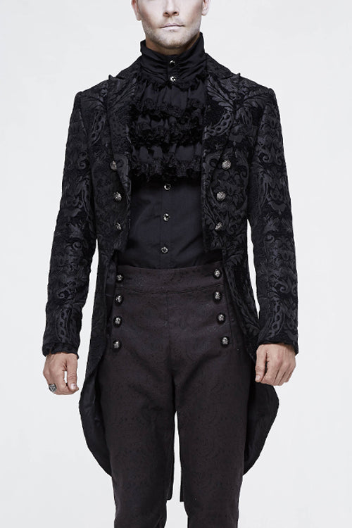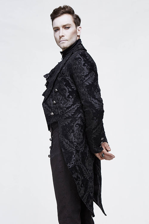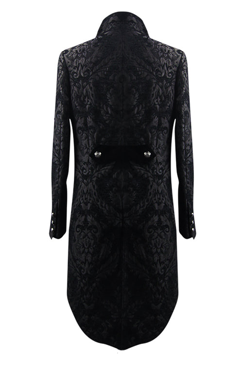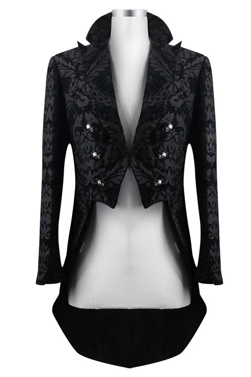 The whole piece is made of thick black jacquard fabric, short in front and long in back, slit in center back.