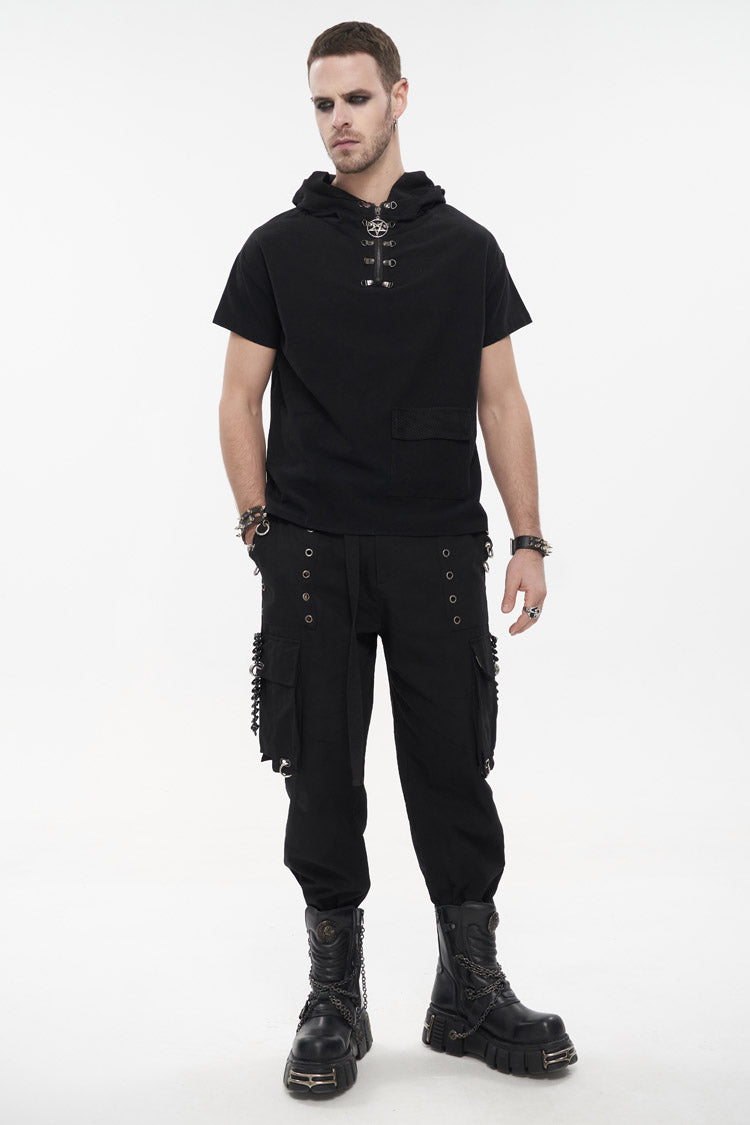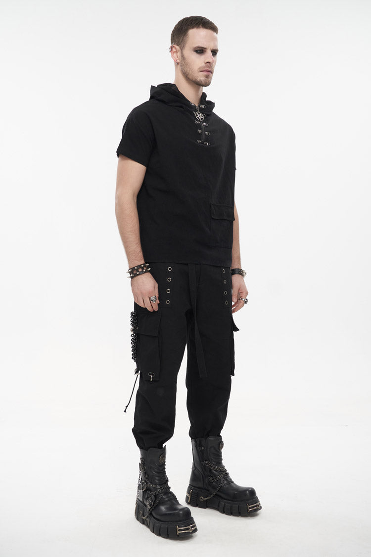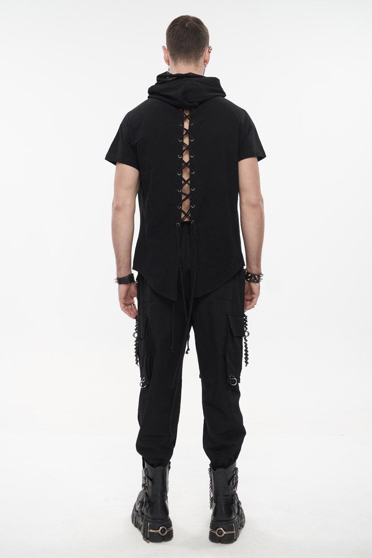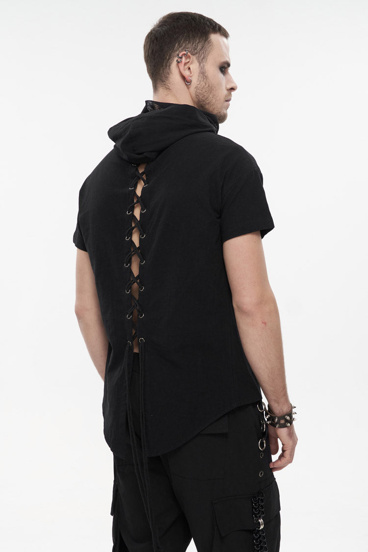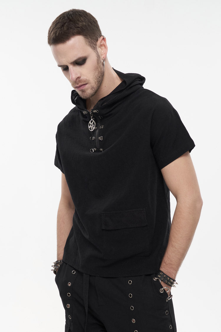 The main fabric is a non-stretch weave in a loose, hooded fit with a middle front zipper and a ripped eyelet at the back for cording.