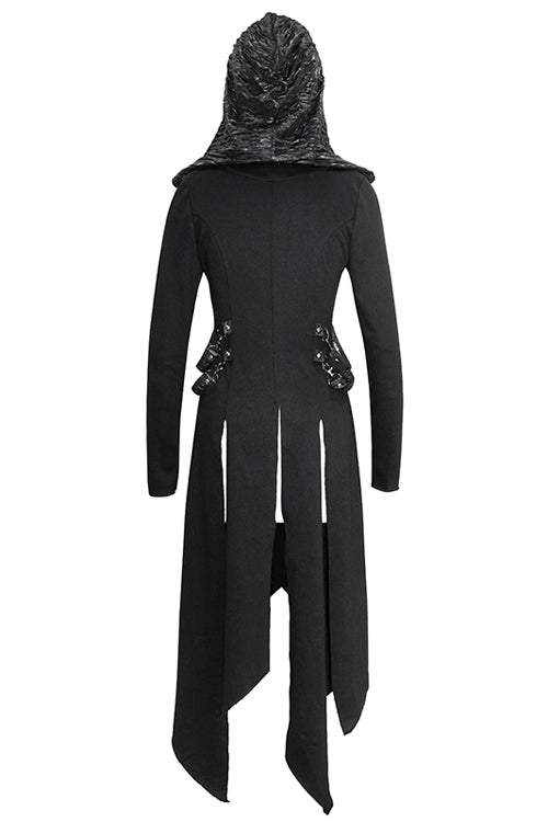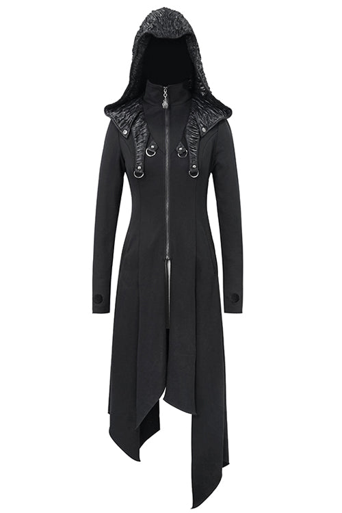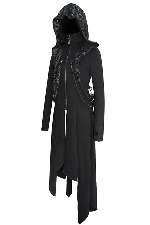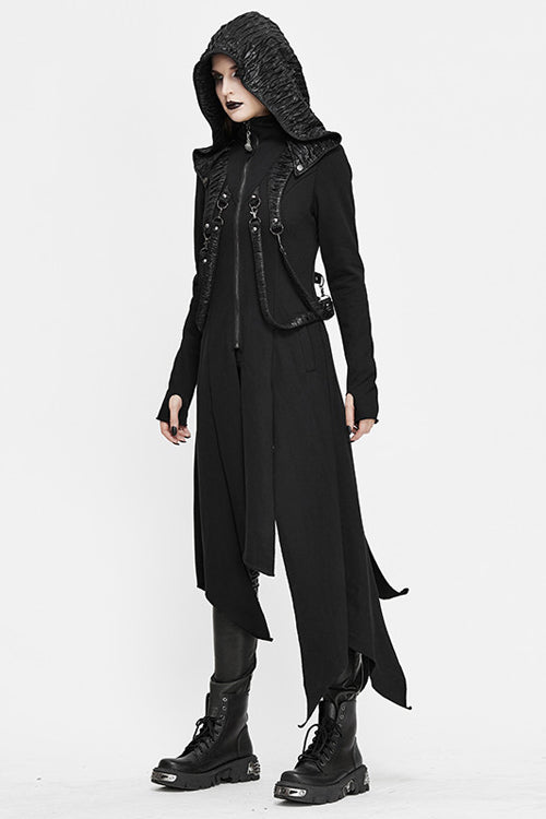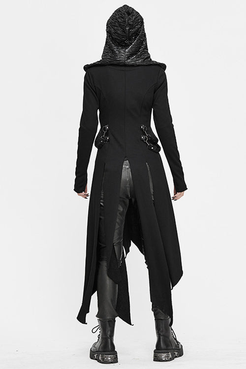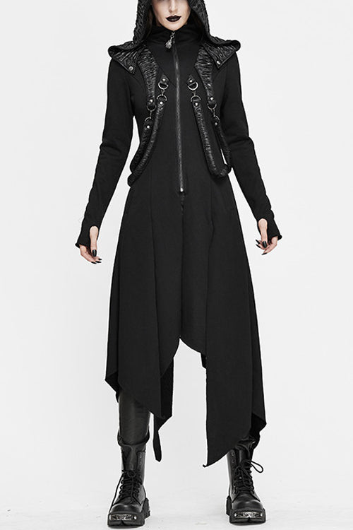 The style is slim punk knitted coat, the main material is knitted fleece fabric, the hat position is connected with pleated bright fabric, the waist loops can be removed.Left and right loops are decorated with nails.