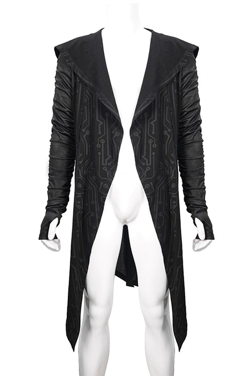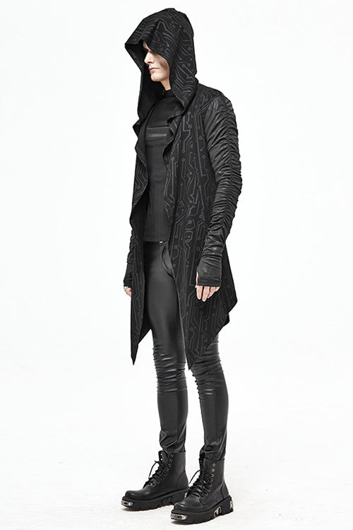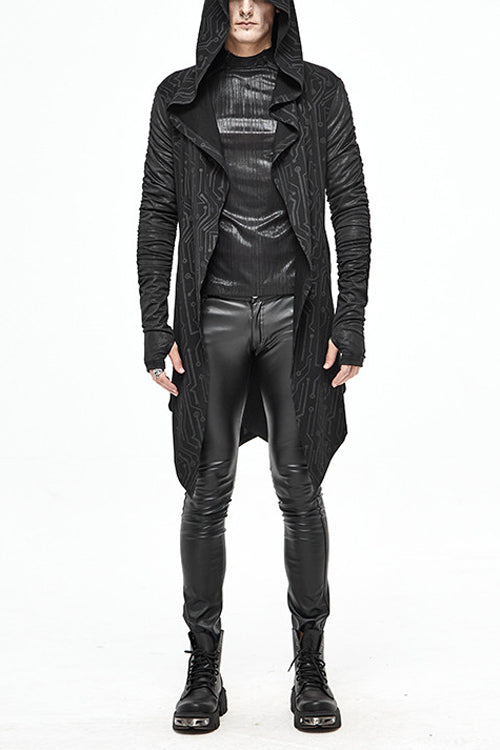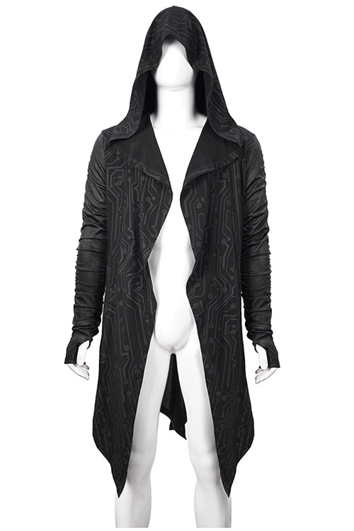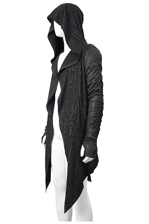 Circuit pattern printing knitting stitching with crack knitting material.Hoods, pointed hem,rubber string shirring sleeves.Suitable for cool weather in spring and autumn, it can be worn daily.