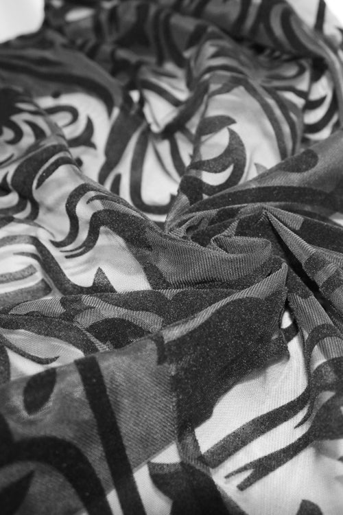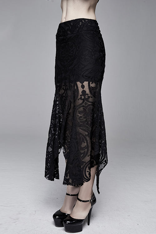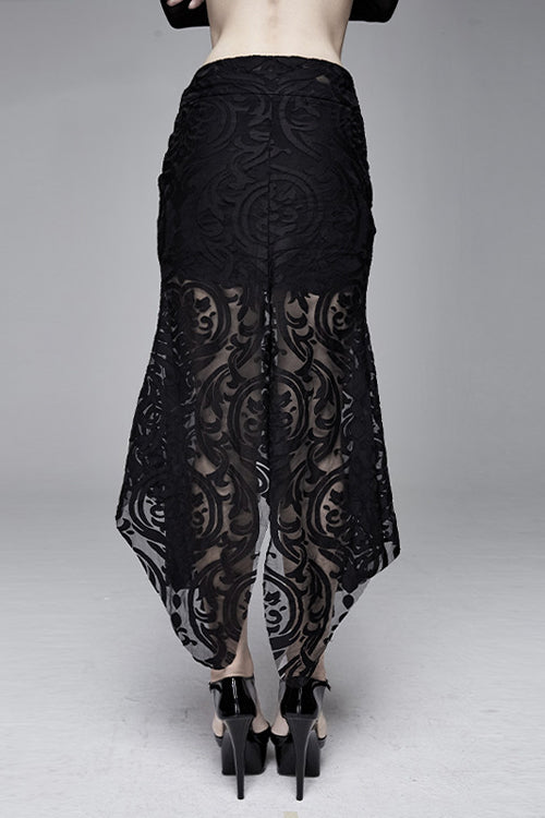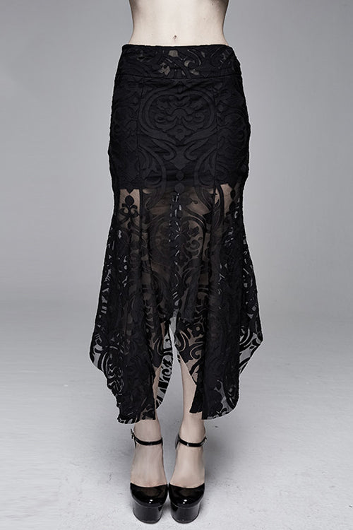 The outer fabric is made of court flocking printed mesh, irregular hem length to the ankle, and the inner layer is made of comfortable pure cotton elastic knitted fabric to wrap the hips, suitable for everyday wear.
