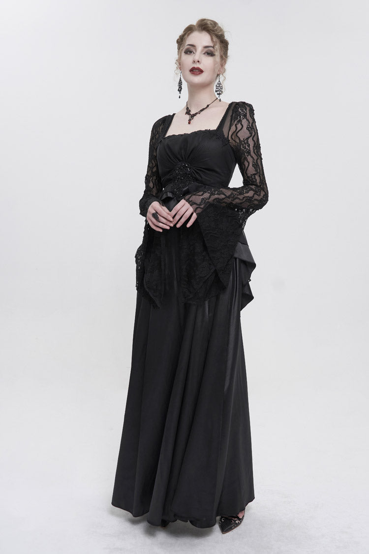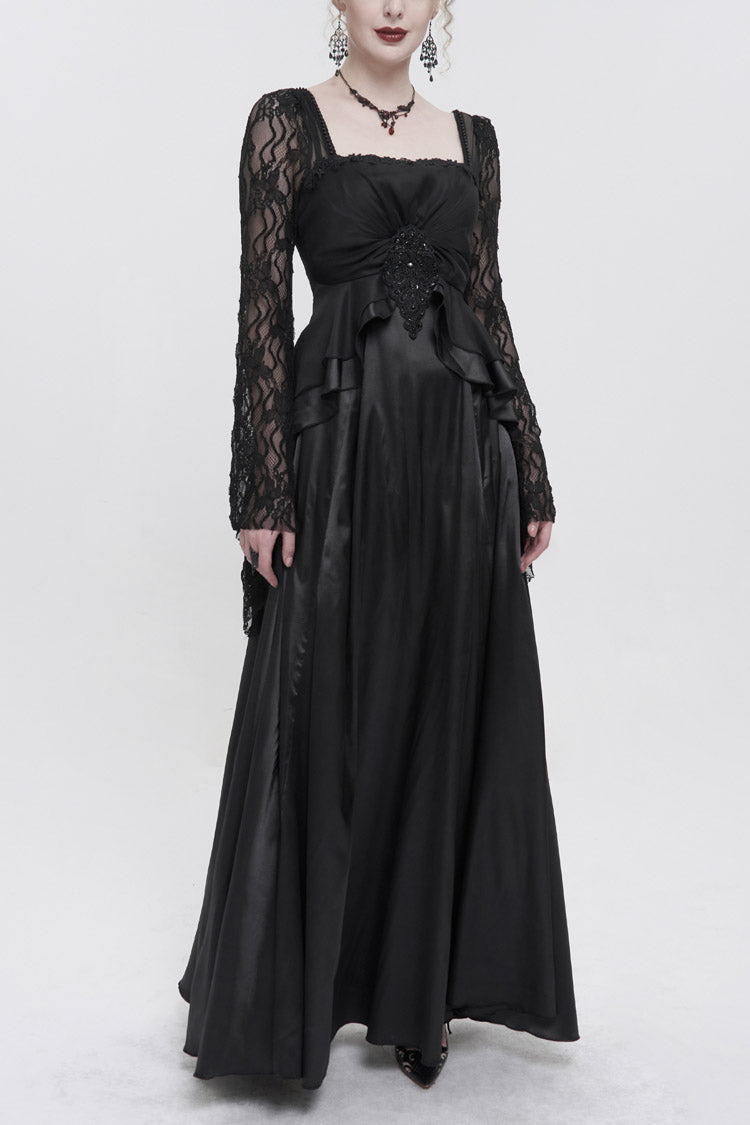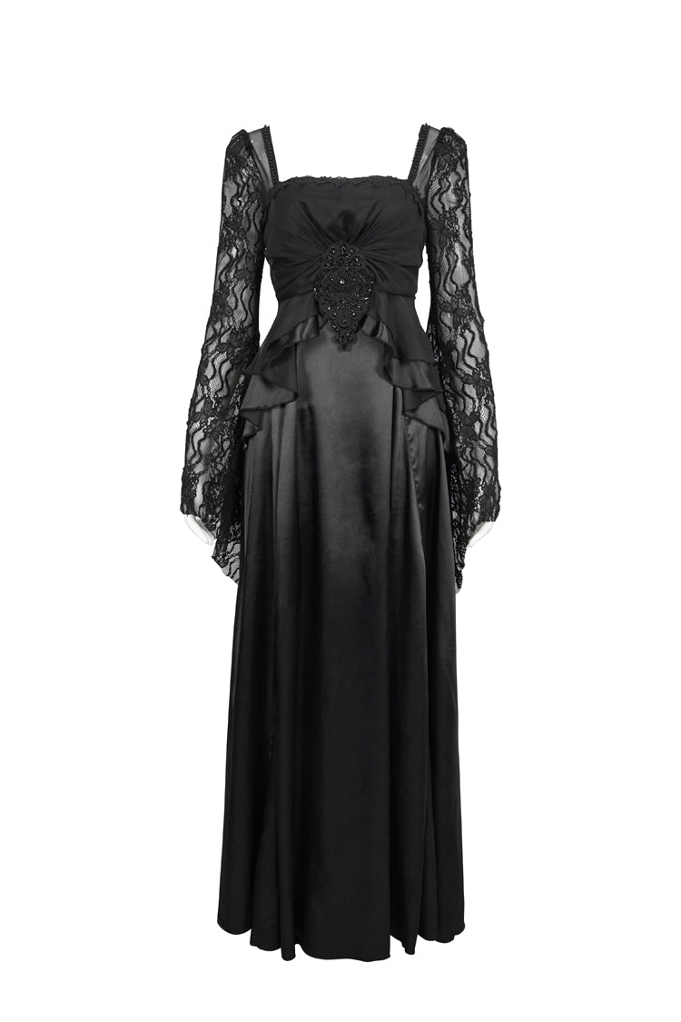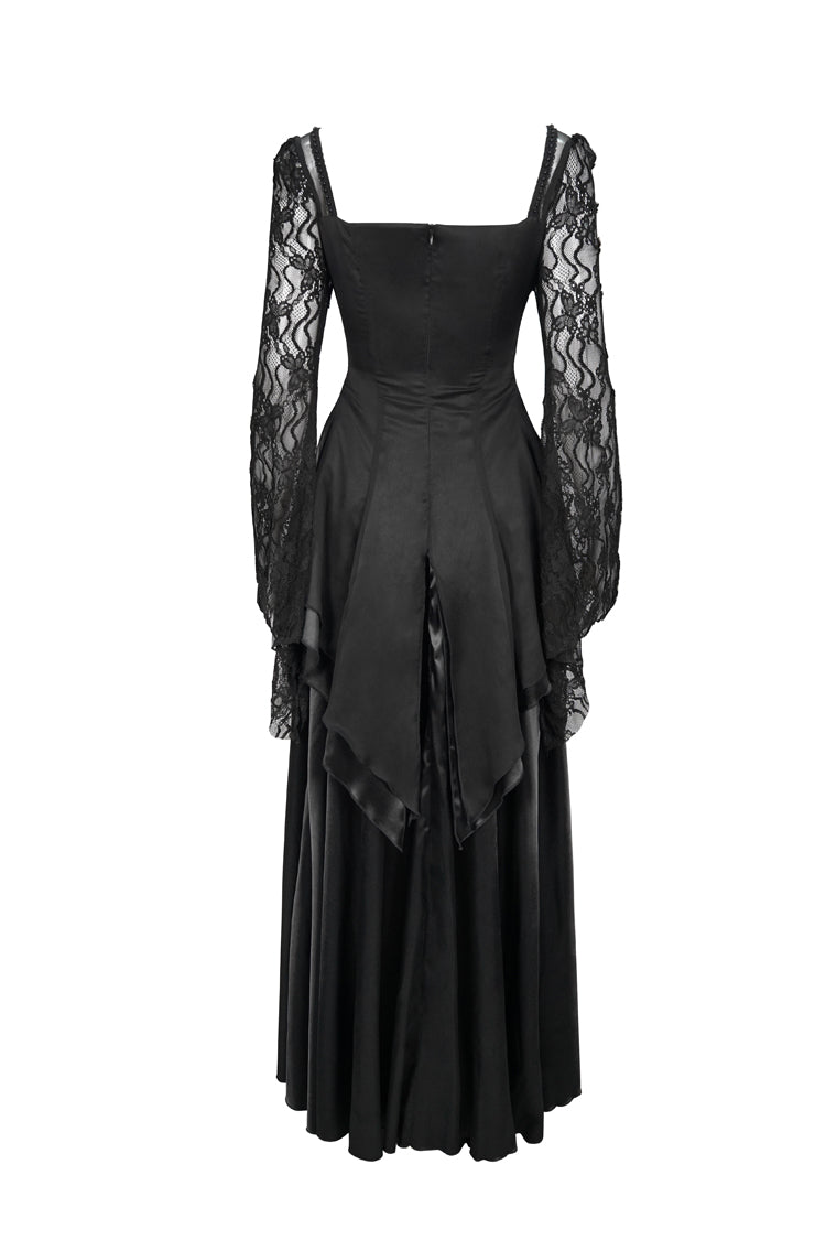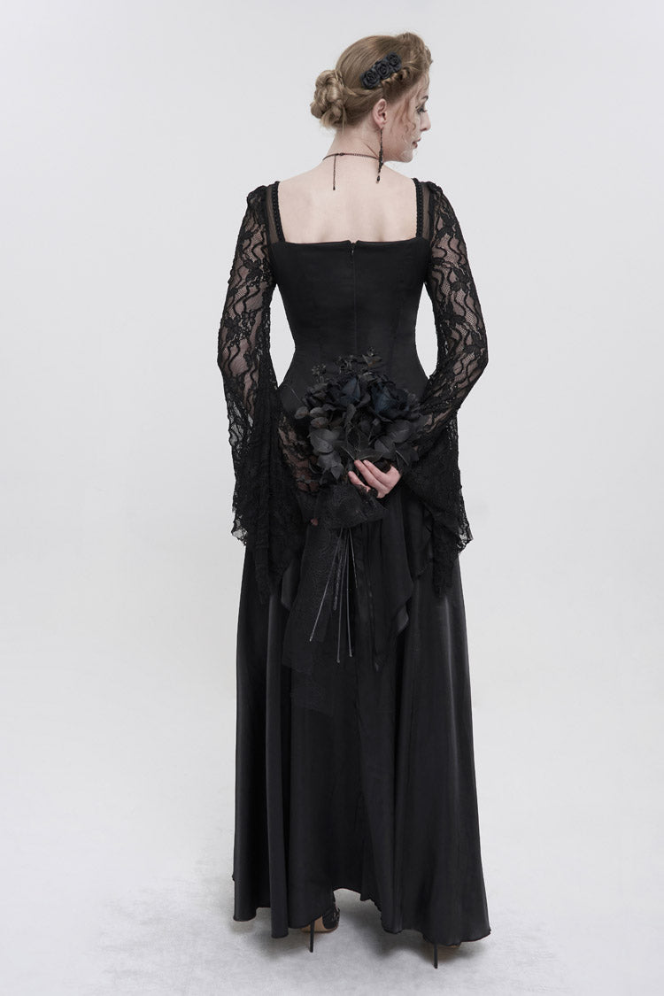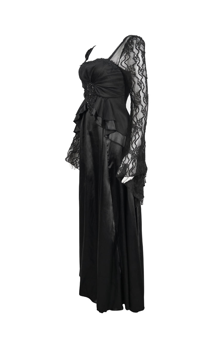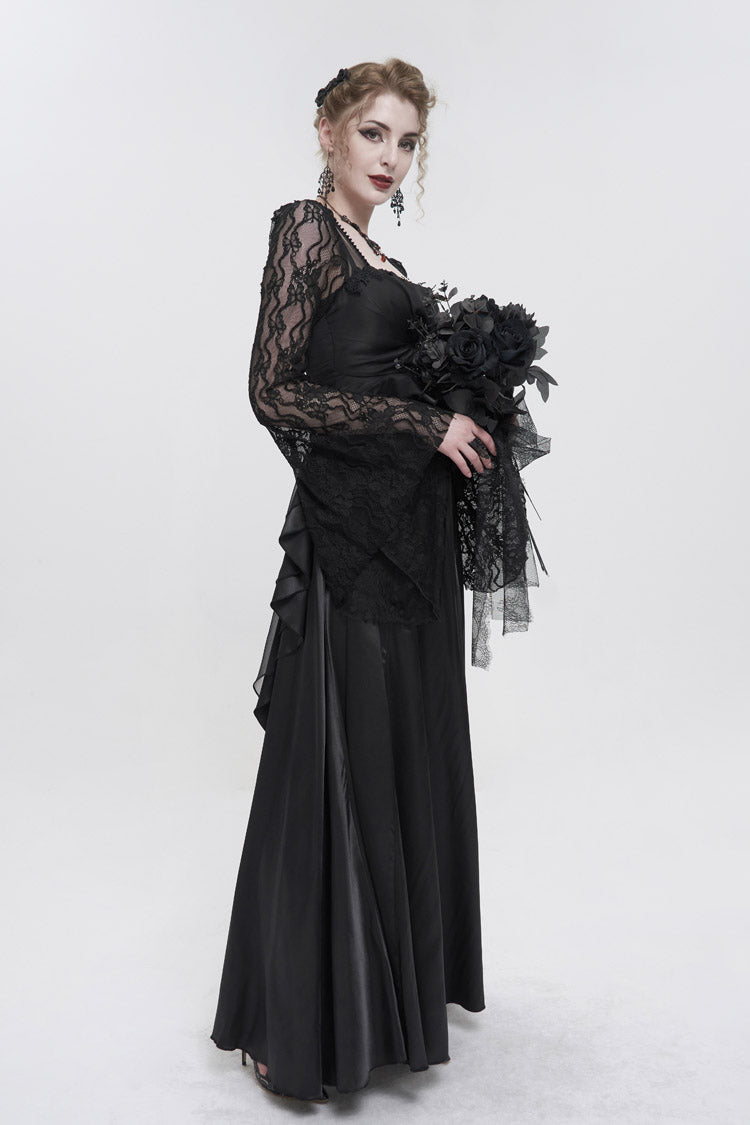 The main fabric is made of a soft satin woven fabric with lace mesh and crepe chiffon fabric in a slim fit version and a long floor-length. Pointed, oversized sleeves. Center back zipper. Perfect for party festivities and goth weddings. Can be worn in all seasons.