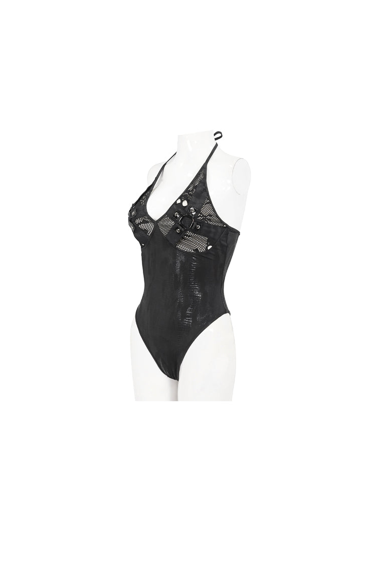 1. Irregularly printed swimsuit fabric is spliced with skeleton mesh material.