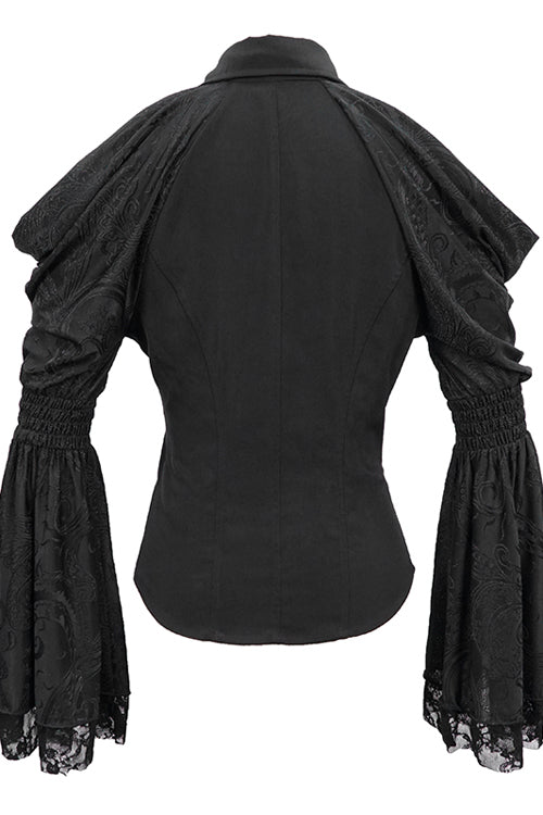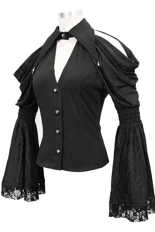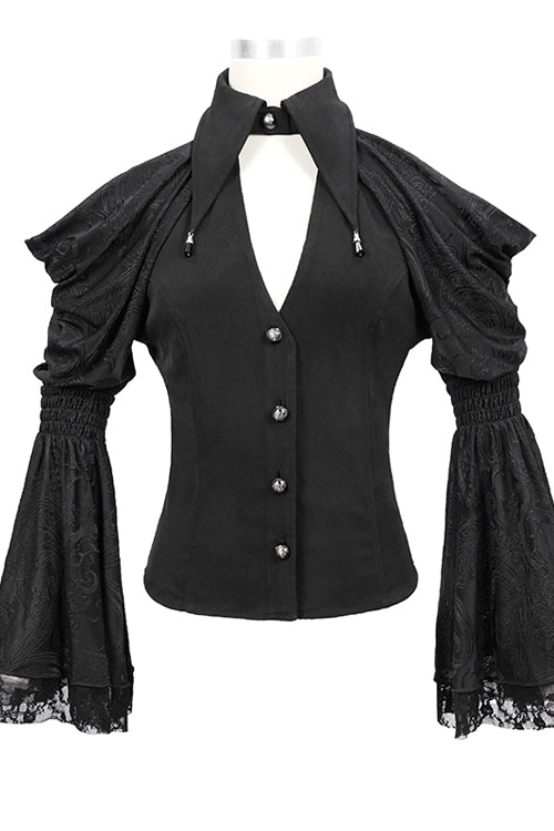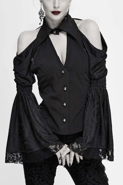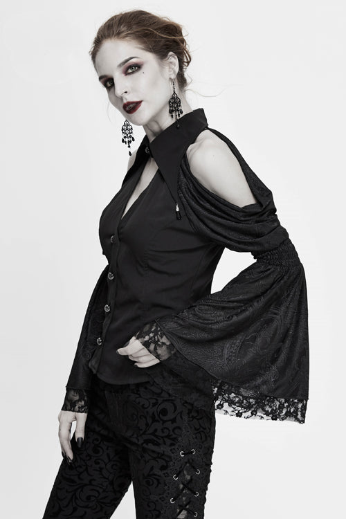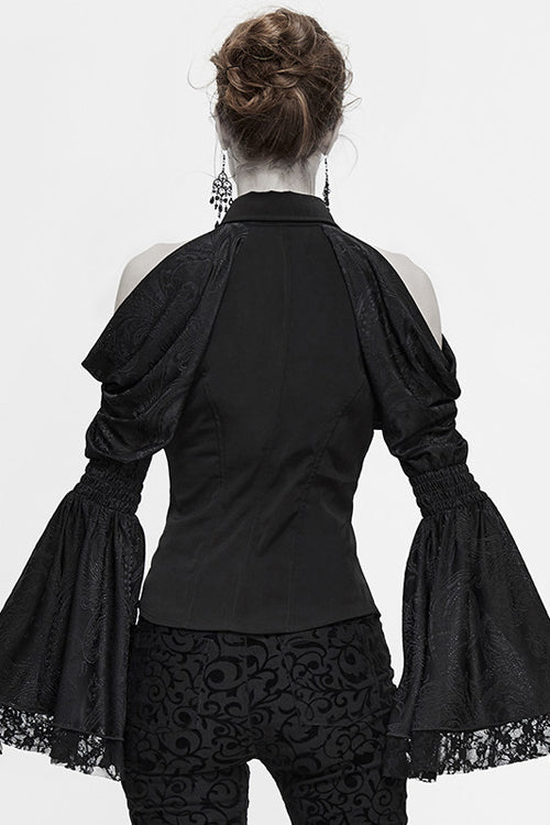 The garment body is pure color woven fabric and the sleeves are stretch floral jacquard fabric. off-the-shoulder, elastic ribbon tightening sleeves,big cuffs stitching lace mesh material.The top collar sharp corner with a small pendant echos the V-neck at the chest.