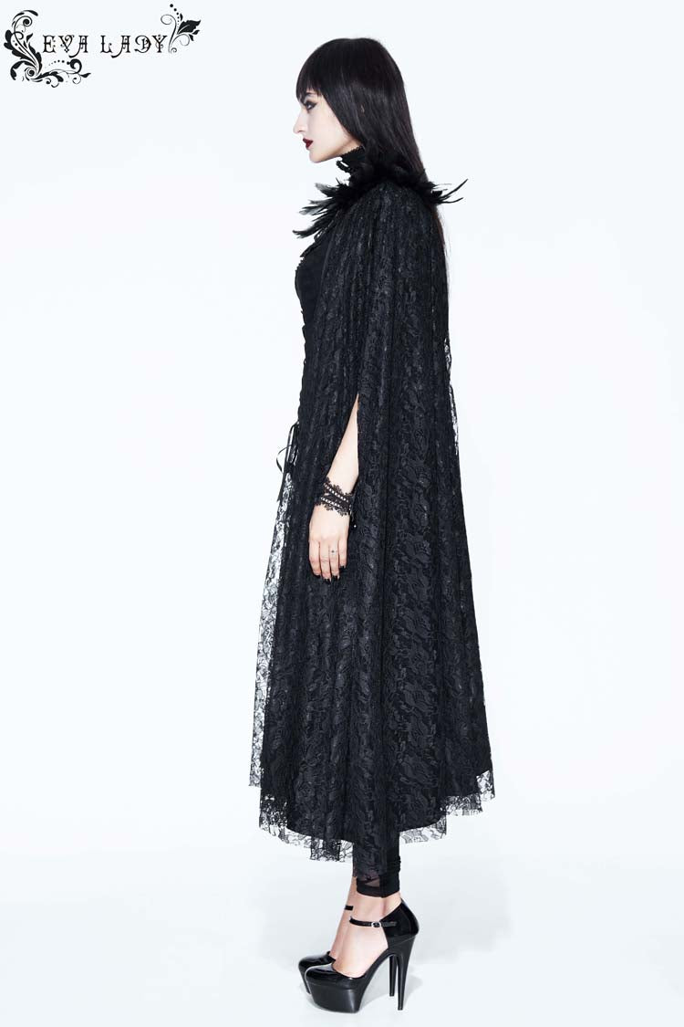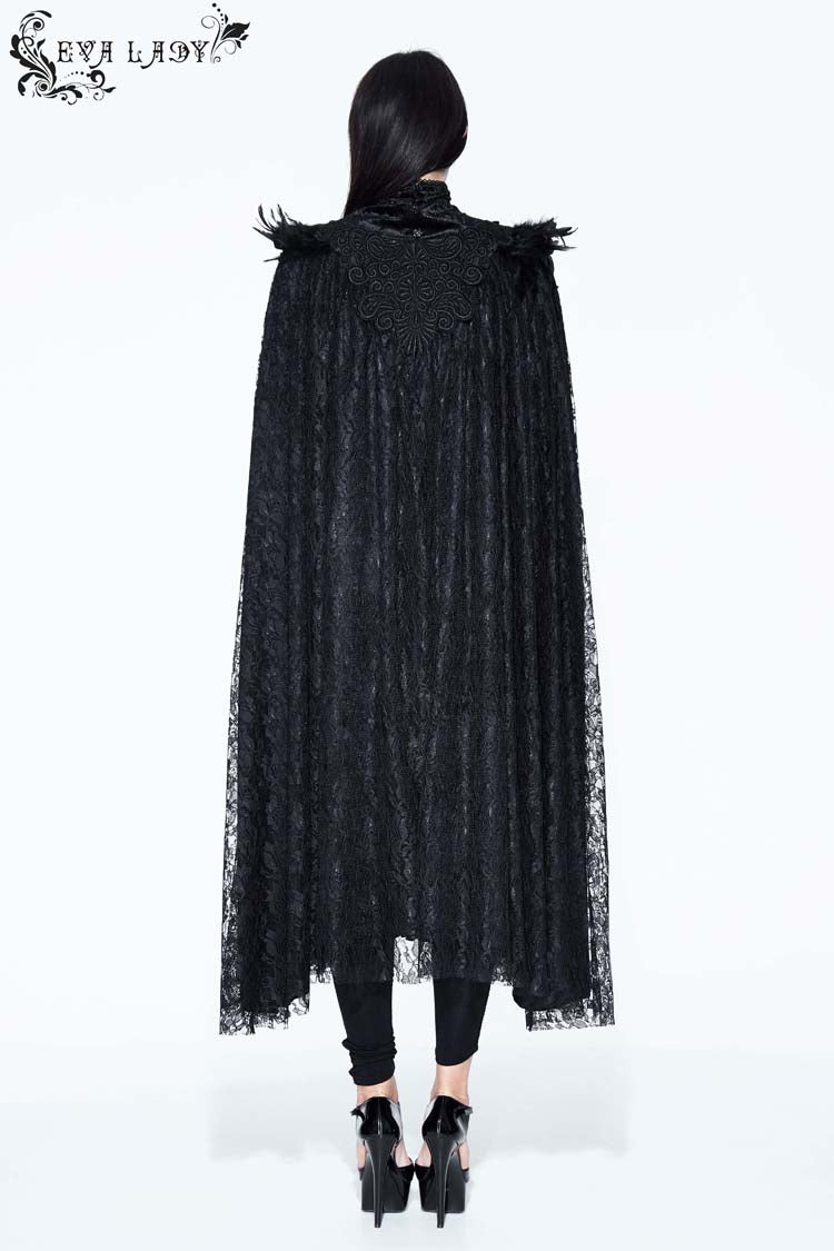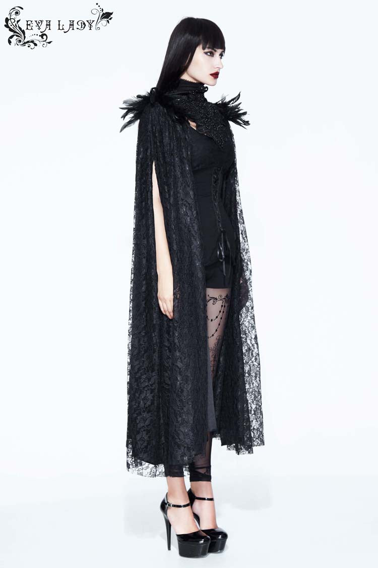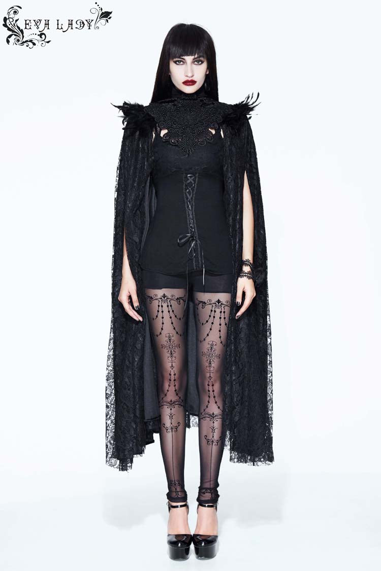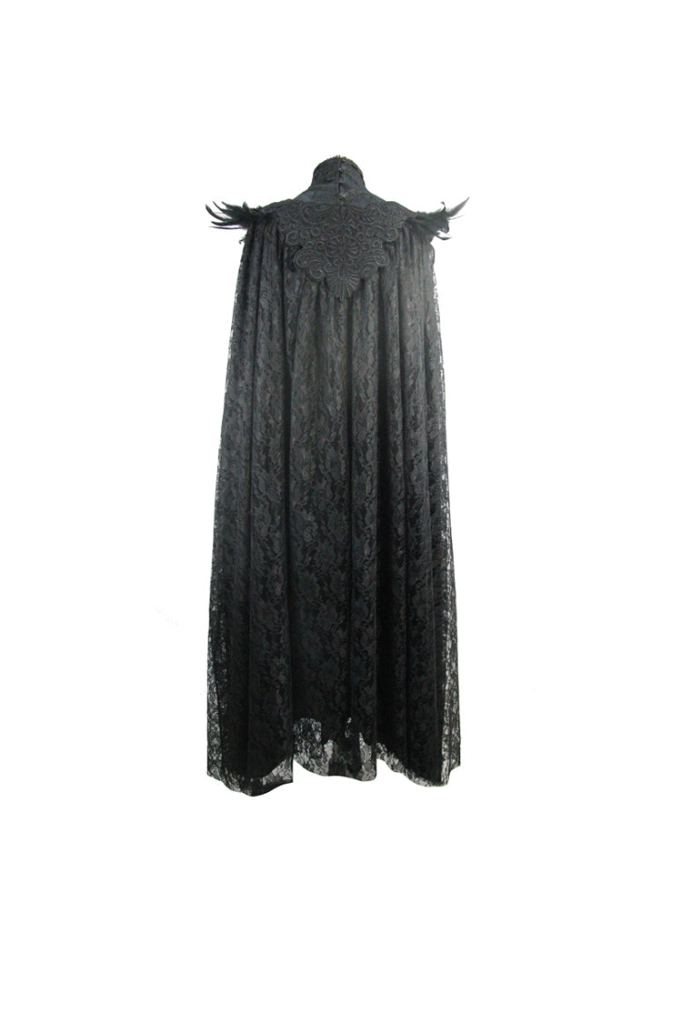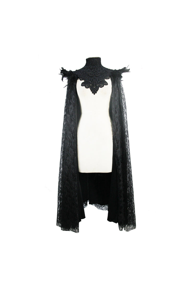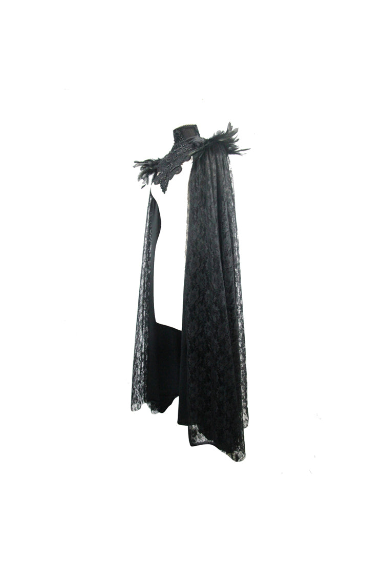 Here is a perfect over garment to complement your gothic look. This cape is designed to satisfy even the most particular of Goths with its lace overlay and stunning embroidered element that covers the chest and the neck. The cape has feathered trimming around the shoulder that enhances the Gothic appeal of the garment.