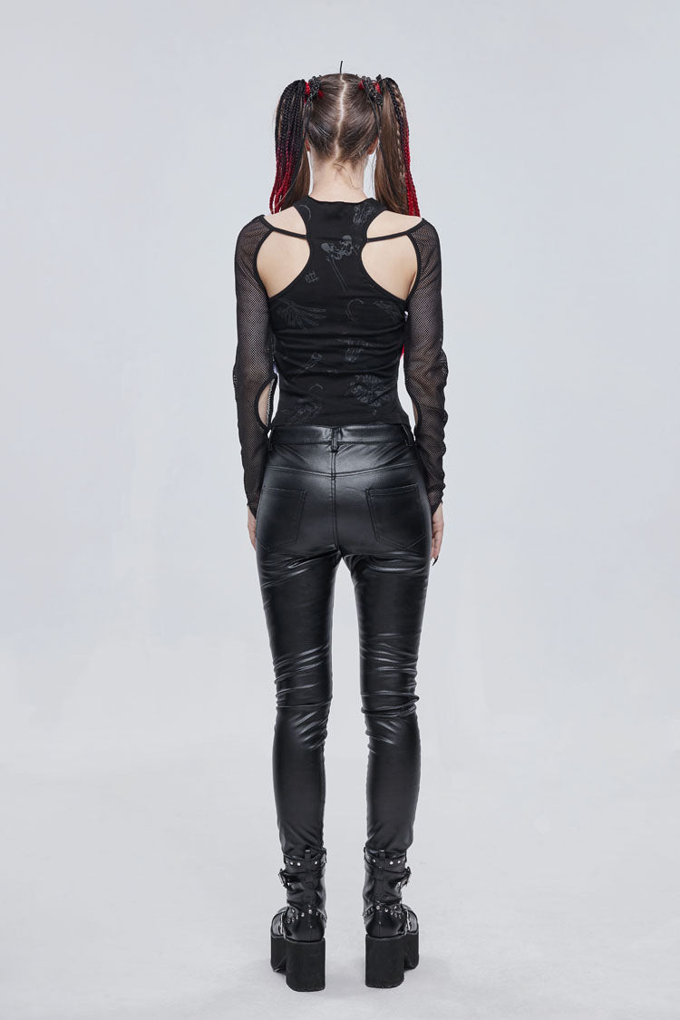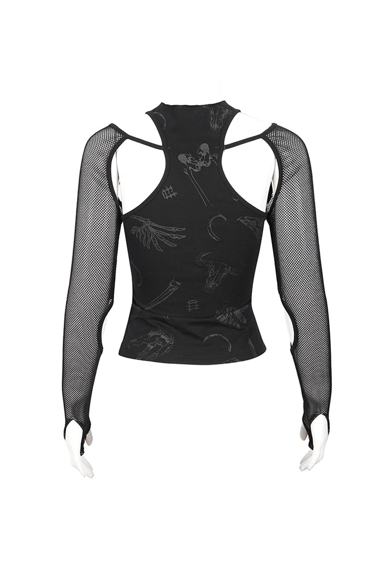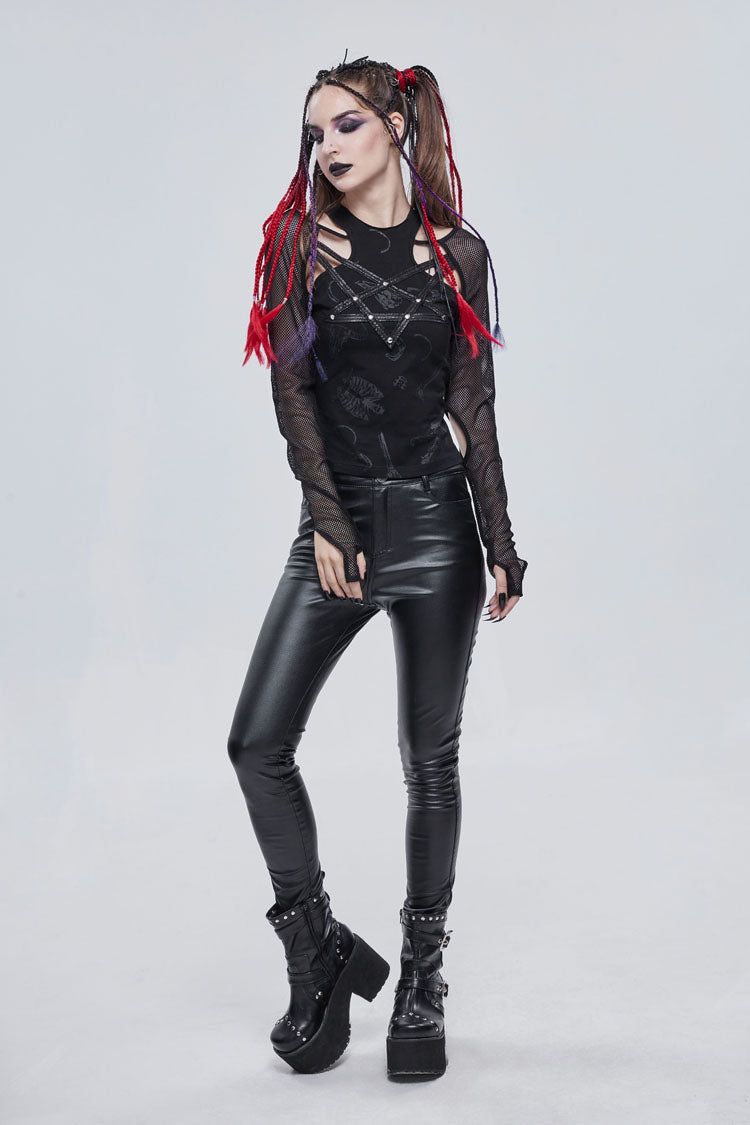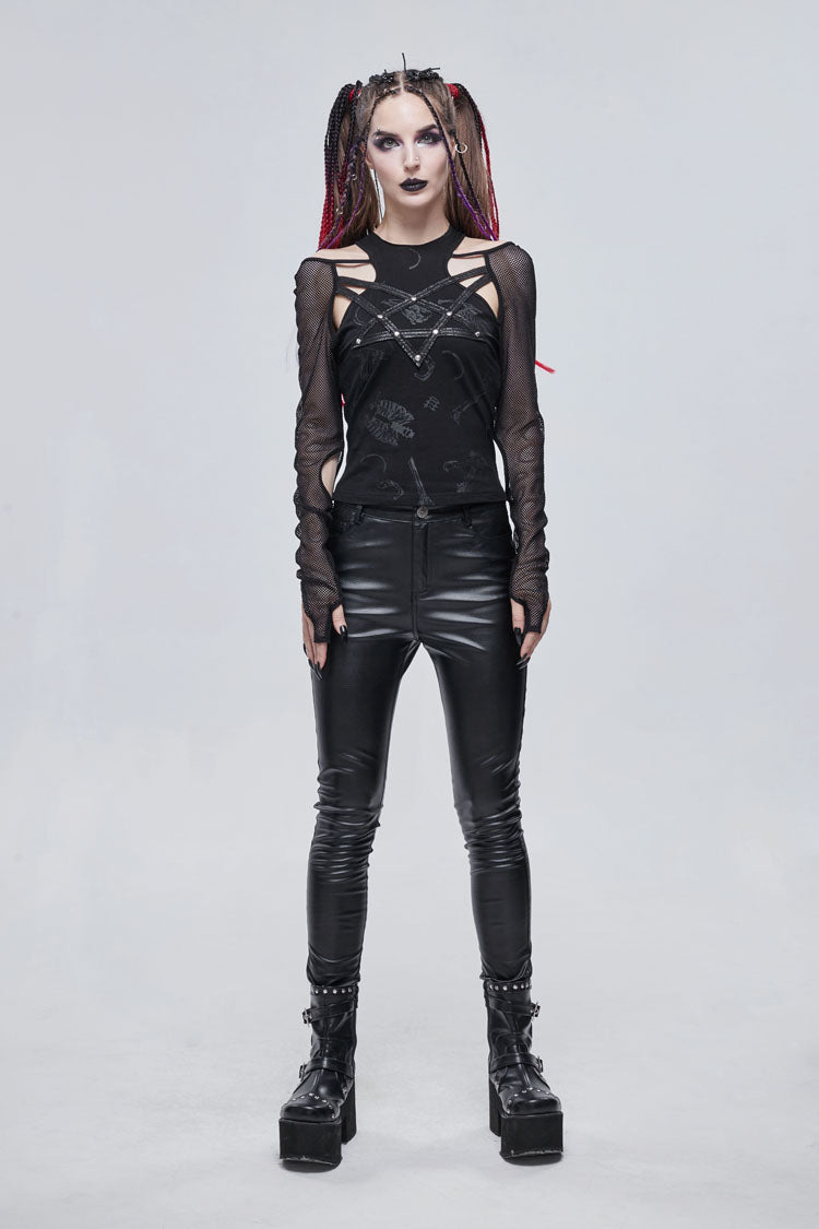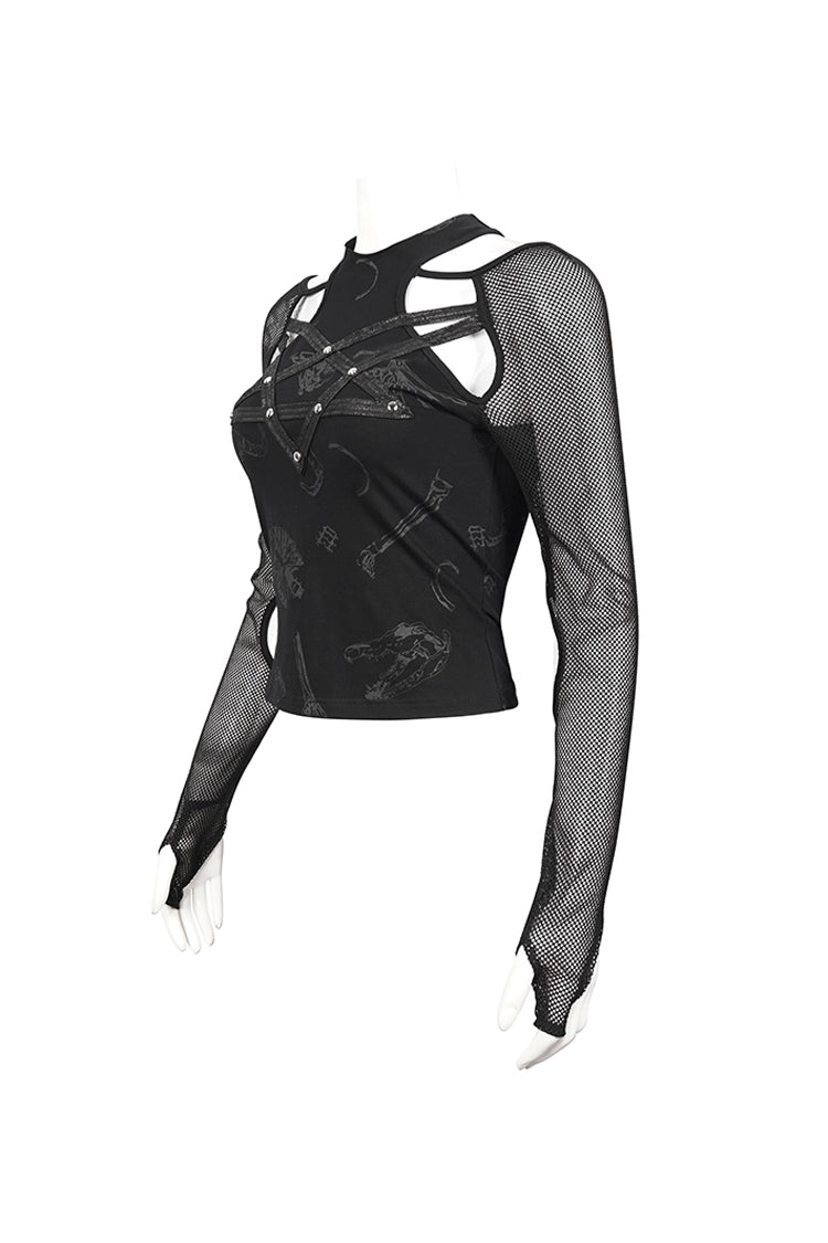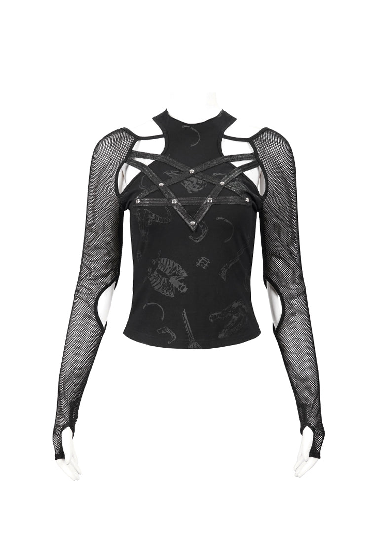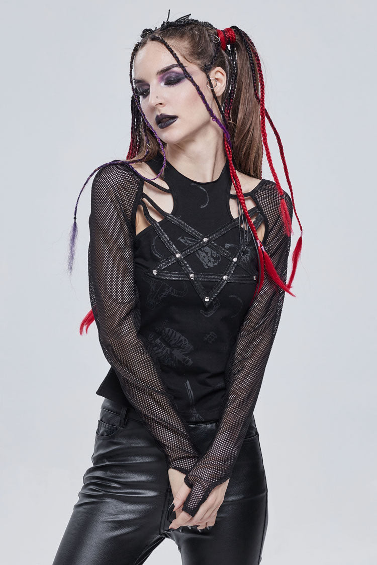 The main fabric is a knitted fabric with good elasticity of cotton and bone printing. The pimp on the chest is in the shape of a pentagram, and the sleeves are connected with elastic mesh. The pimp is decorated with studs. Raw edges at the neckline, great elasticity.