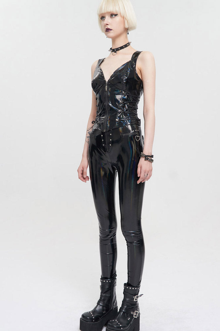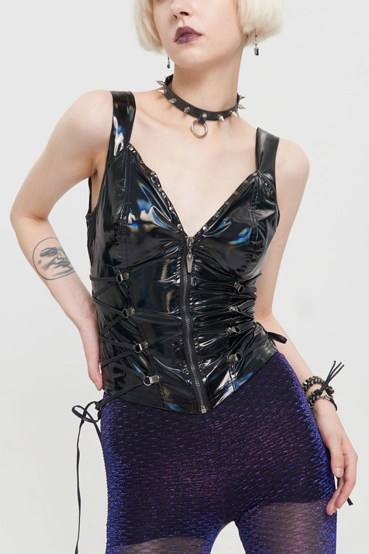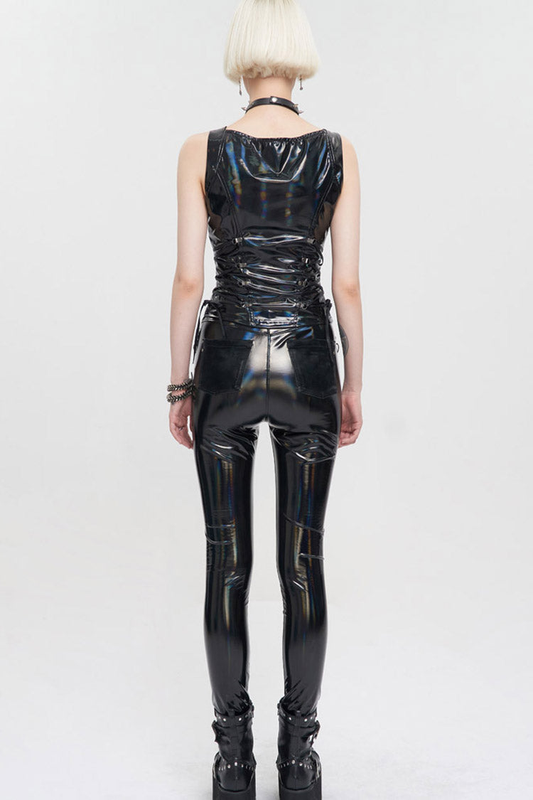 The main fabric is black magic leather with better elasticity. Strings at the sides adjust the girth, and the fit is slim enough to be worn alone.