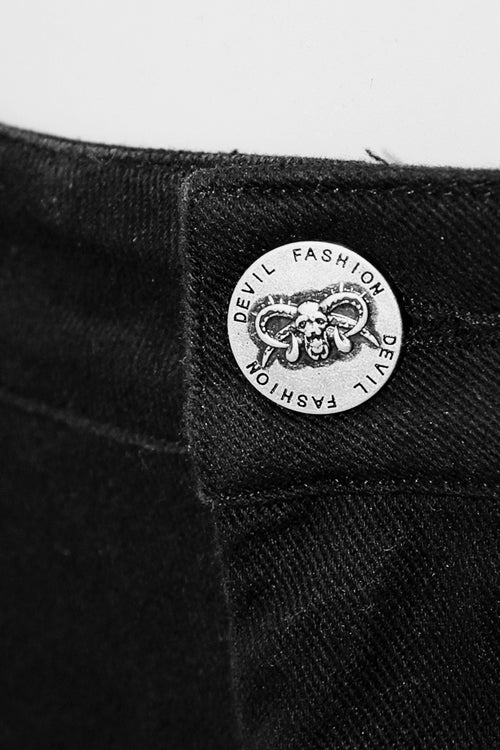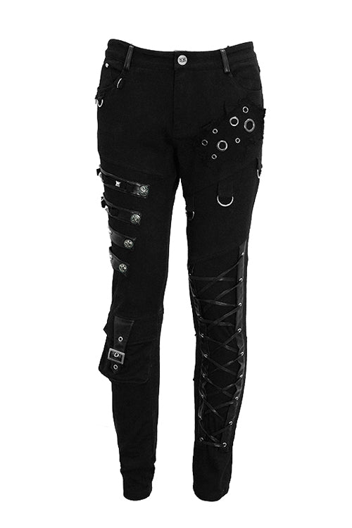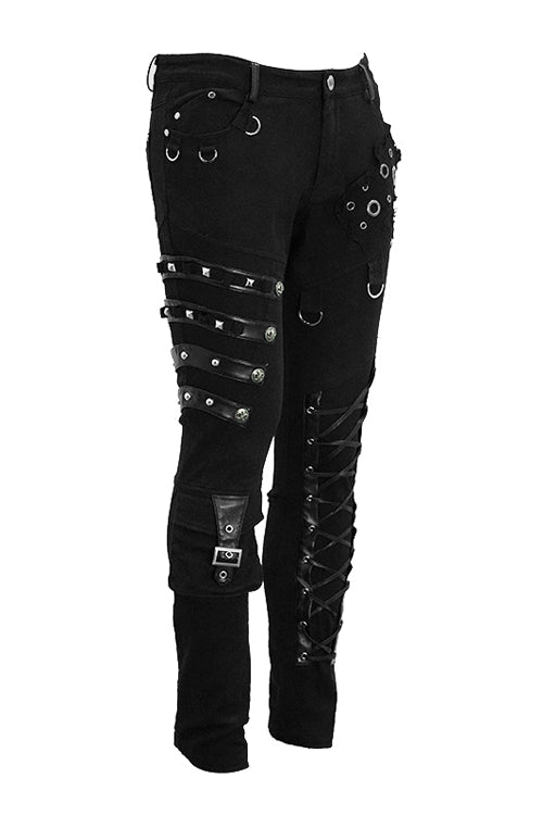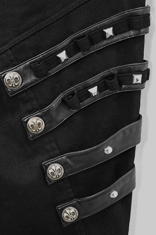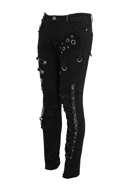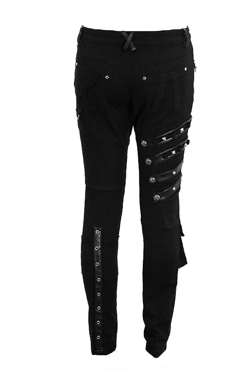 this pants is made of elastic twill Fabric, asymmetric two legs, left leg was stitched with loop with bullet, the right leg upper part is use the water washing and worn out technology.