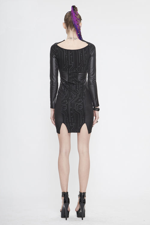 The main fabric is made of elastic knitted fabric with printed circuit board pattern, and the two sides below the waist, shoulders and sleeves are made of elastic glued knitted fabric.The waist made a false belts tied rope design.Back hem with slit for easy movement.