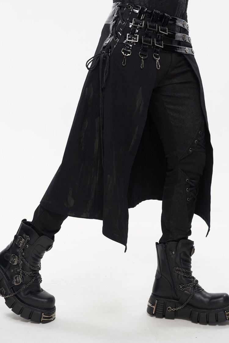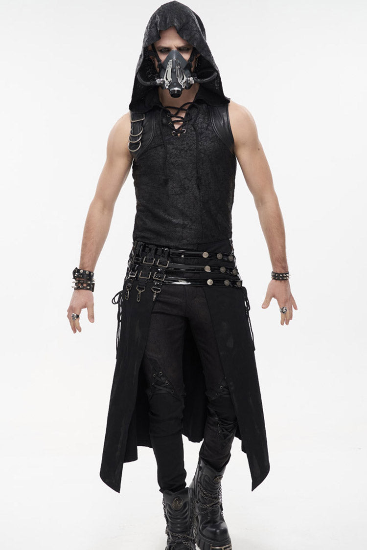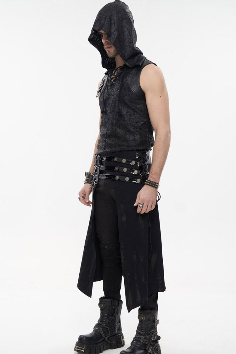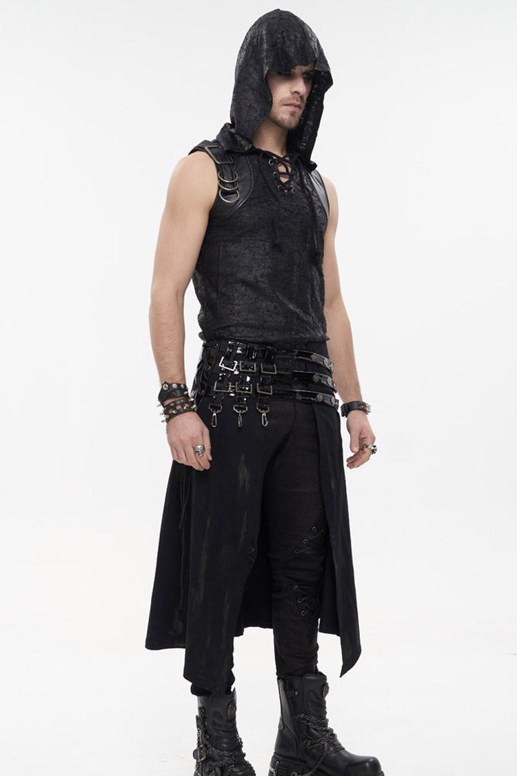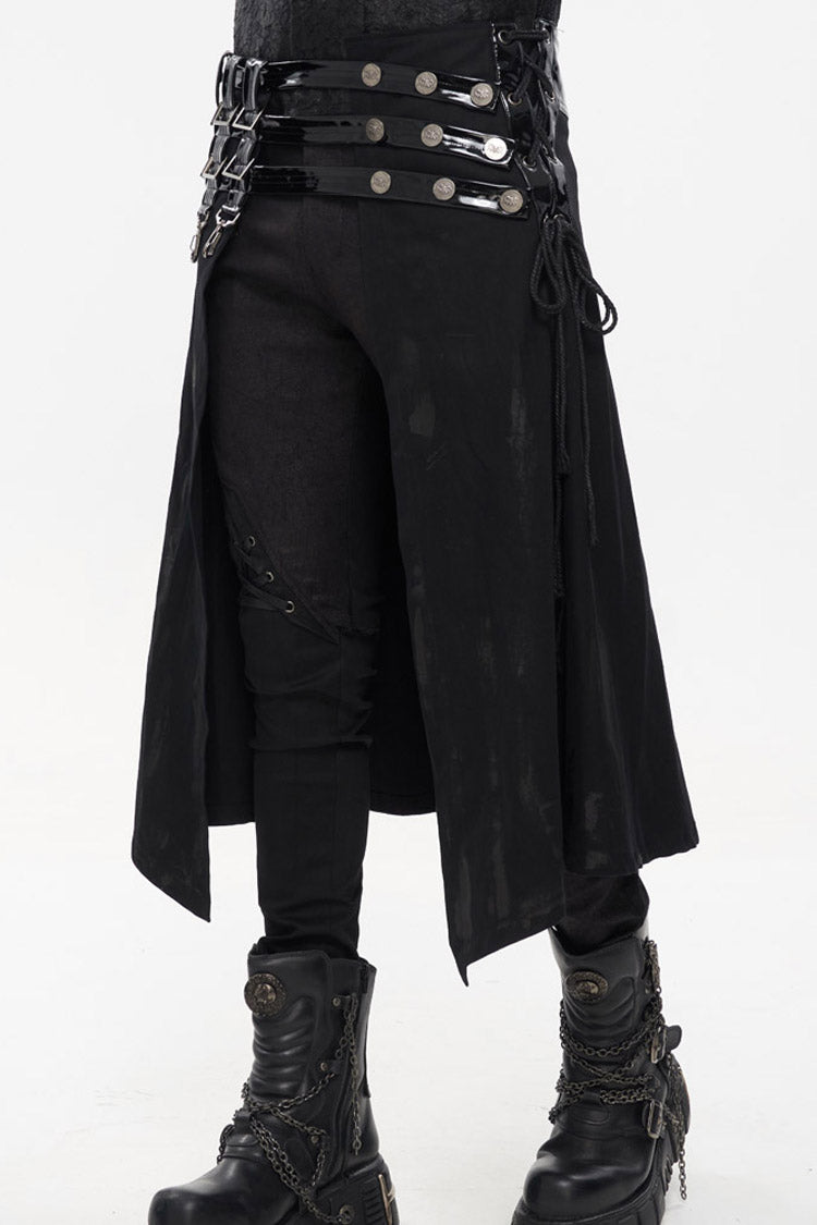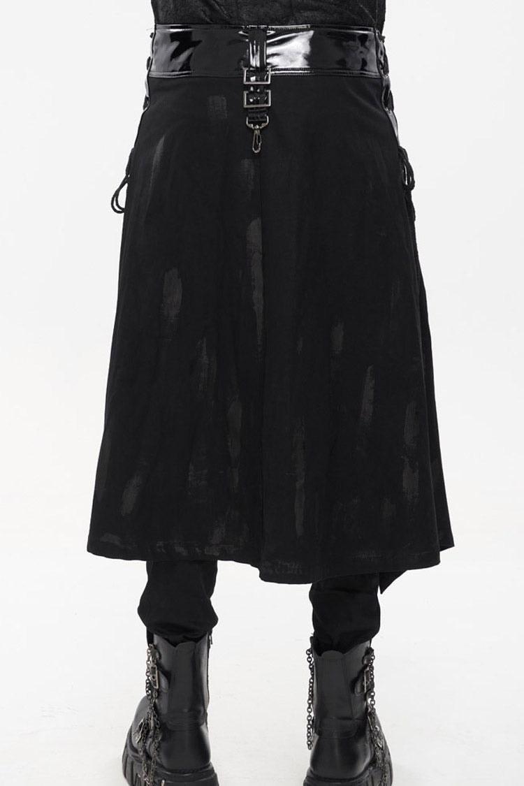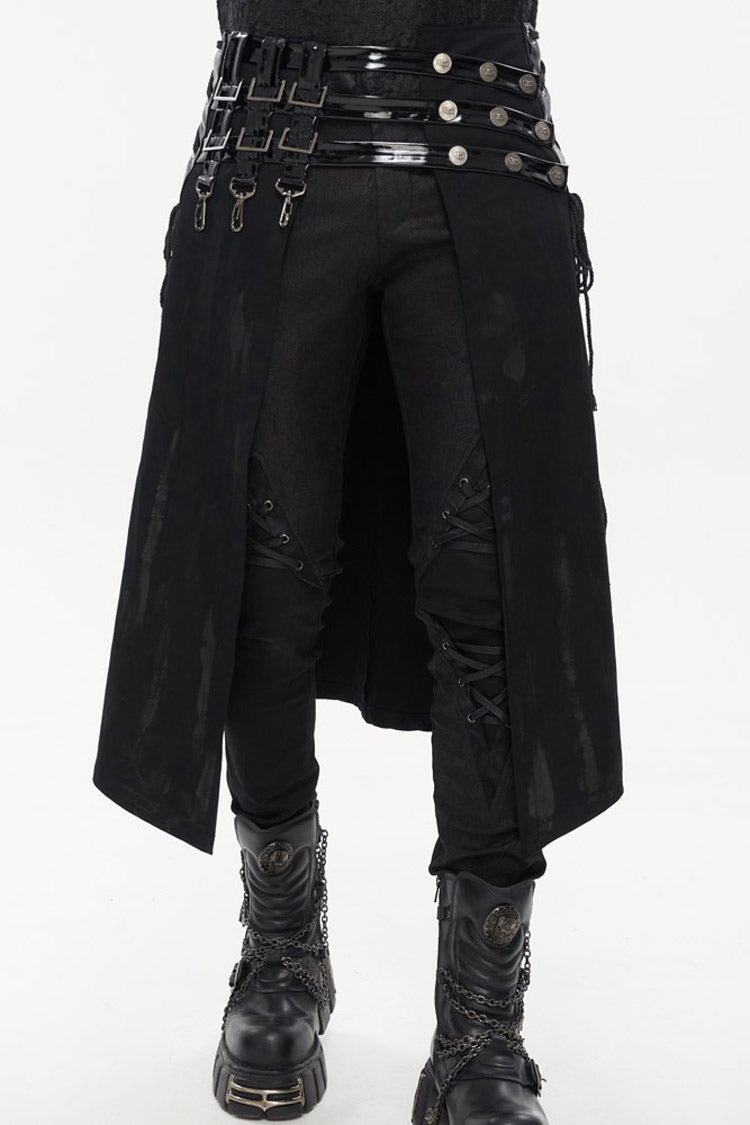 The main fabric is non-stretch woven, stitched with glossy patent leather, multi-heavy metal decoration, three front leather loops and side ropes, and the skirt circumference can be adjusted.