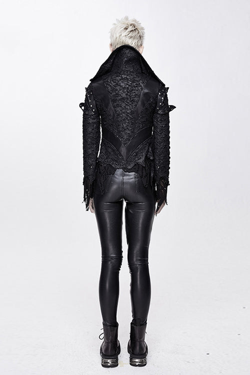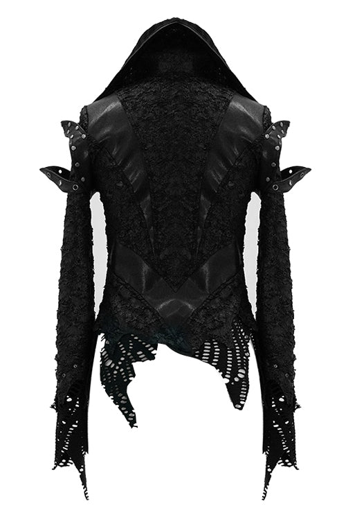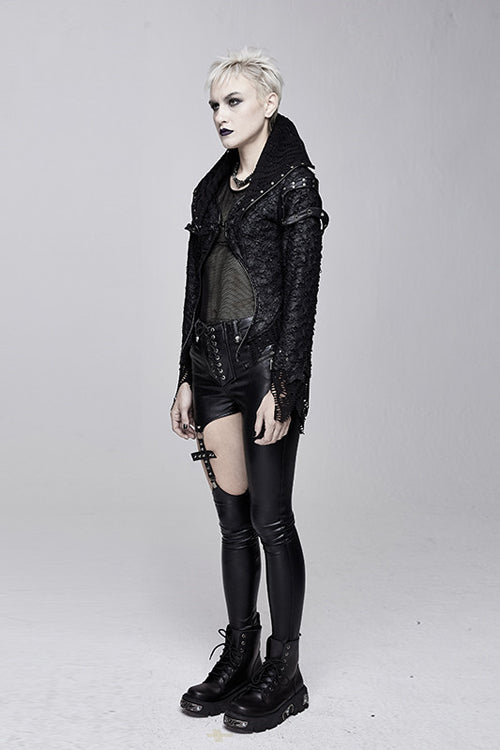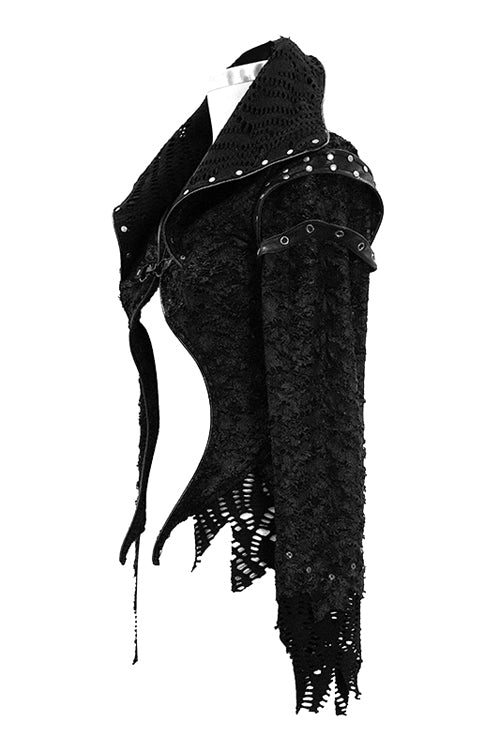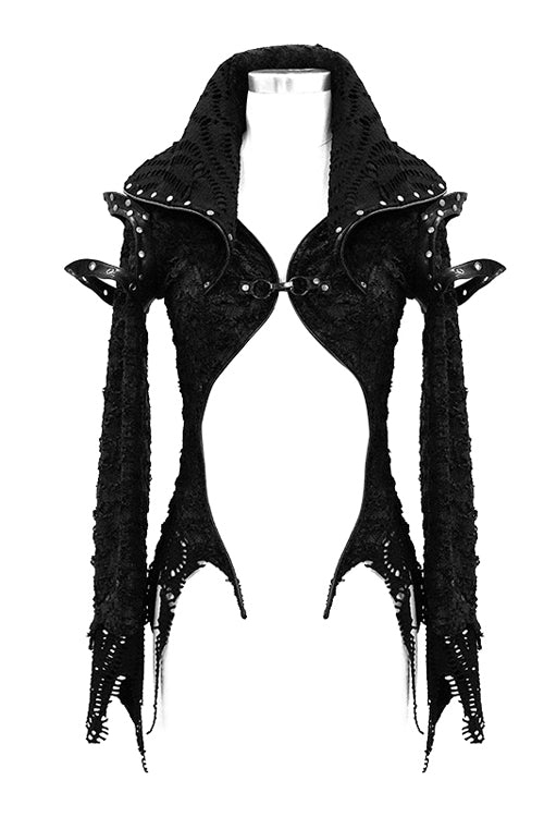 Glued broken holes knitted fabric splicing with black leather and thick mesh fabric. The front panel is extremely short and it looks lile the shawl. The back panel is divided into V-shaped segmentation.The shoulder loops and collar were nailed with big metal studs.