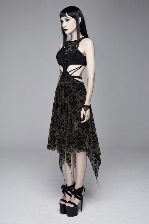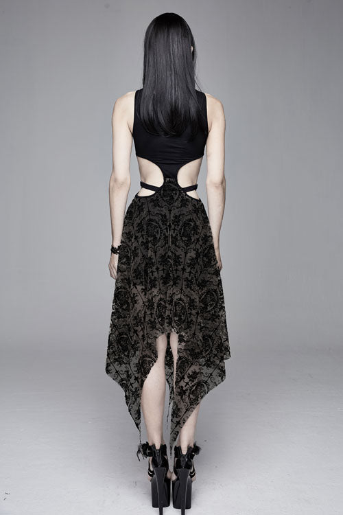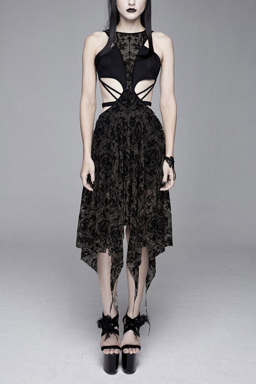 Black queen cross flocking printing mesh stitching with black elastic pure cotton knitted fabric, the center front semilucent invisible and revealing skin color, waist side stitched with elastic rubber string, hem sharp Angle design,the lining is made of knitted fabric.