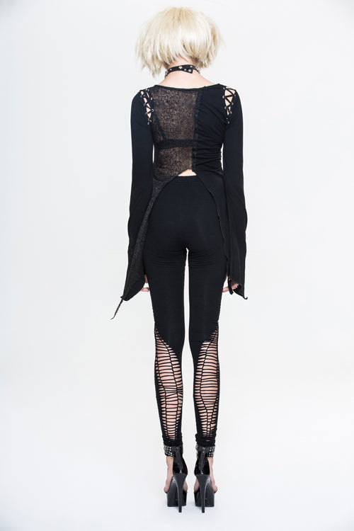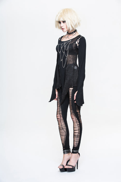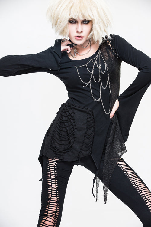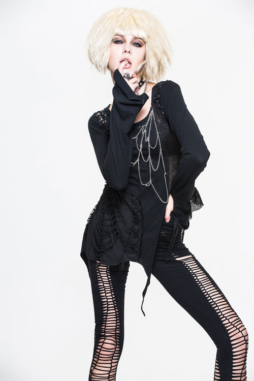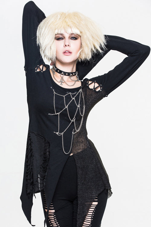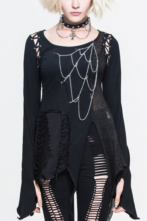 Pure cotton knitted fabric with good elastic is asymmetrically stitched wool fabric and burn-out broken holes knitted fabric,there is a hole in the cuffs to cover finger, and the chest chain is made into a spider web shape, which can be disassembled.