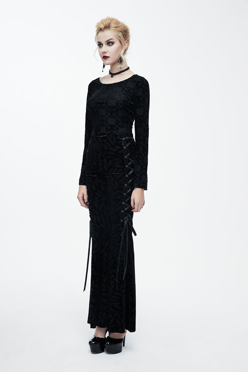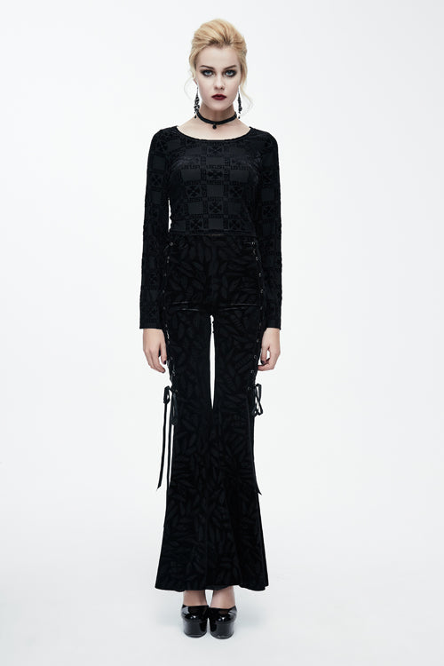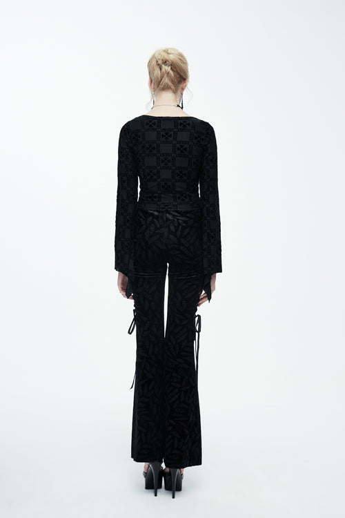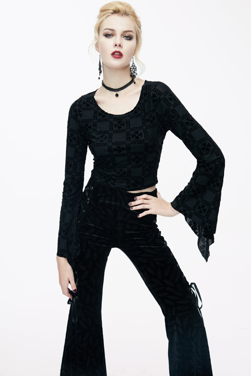 The whole piece is made of the cross burnt out pattern velvet fabric design into a basic style T-shirt with horn sleeves, suitable for daily wear.