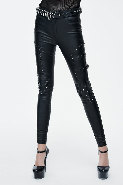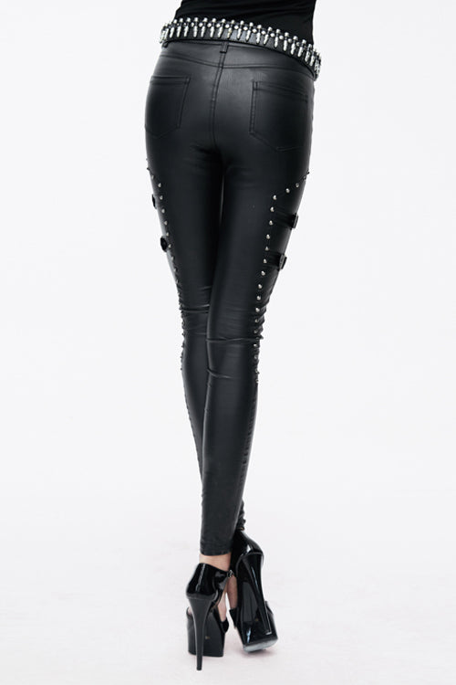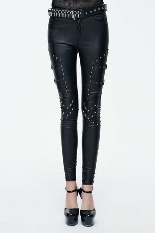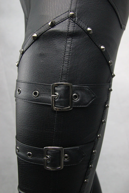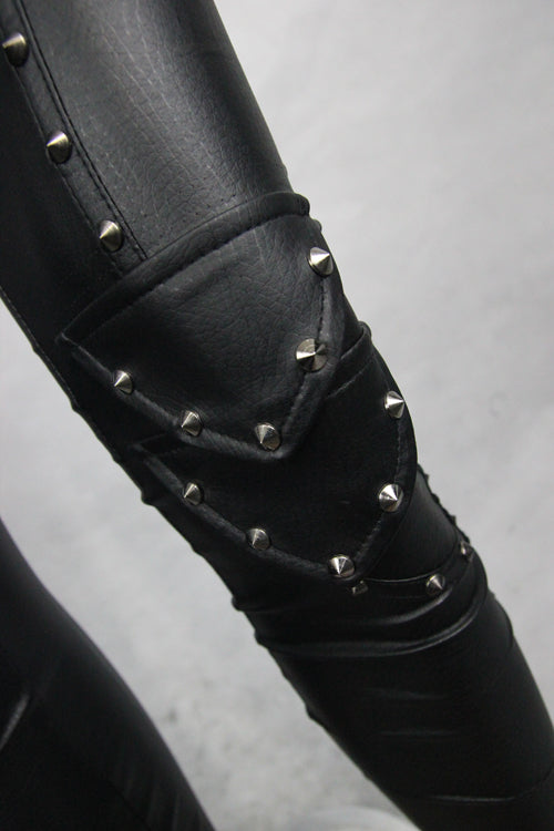 The whole piece pant is made of coarse-grain elastic imitated leather, stitching and pressure line position was studded with pointed nails. The loops on the thigh can be adjusted, and the knee is made of double-layer triangular laminated pieces, suitable for daily wear.