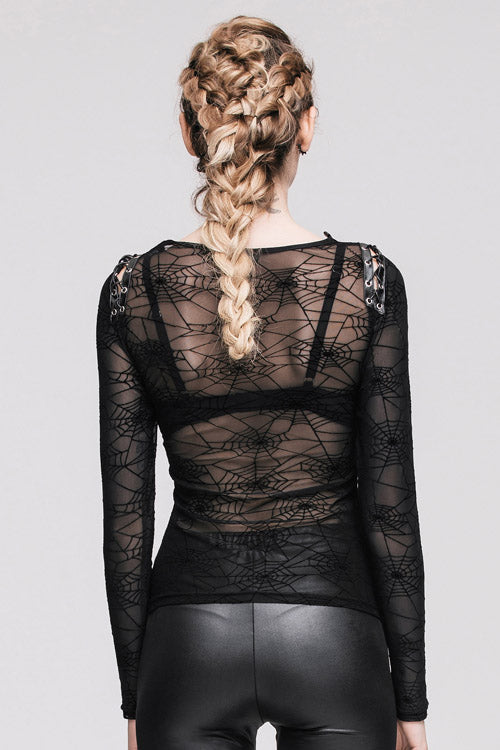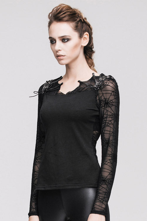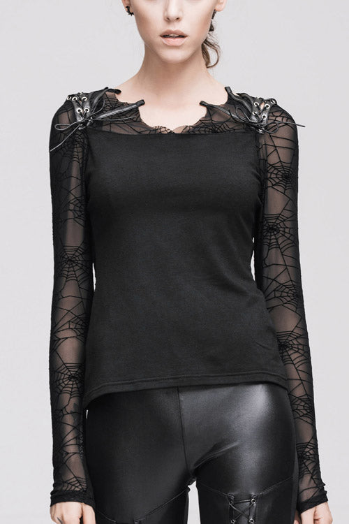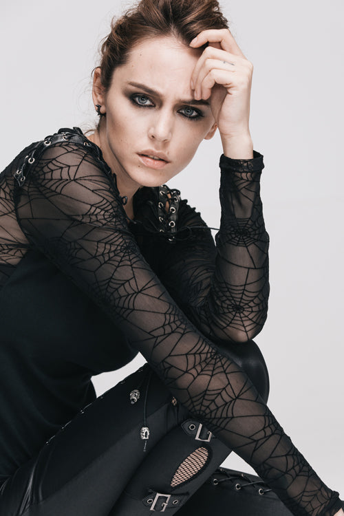 good elastic pure cotton knitted material spliced with Spider web flocking mesh fabric.The front shoulder position is made into the shape of bat wings with leather strips. Corns are tied with rope at the connection between sleeves and shoulders.