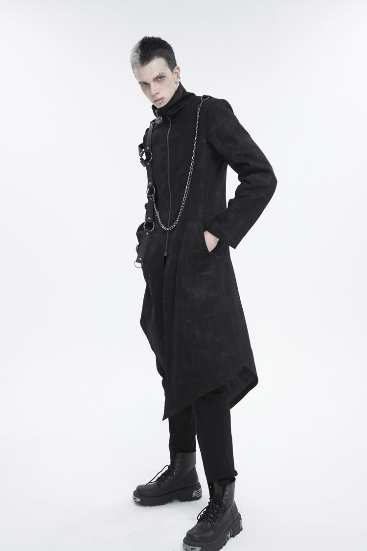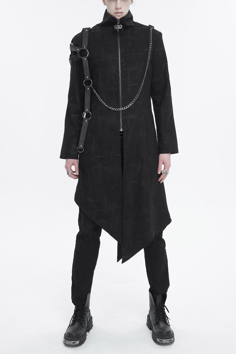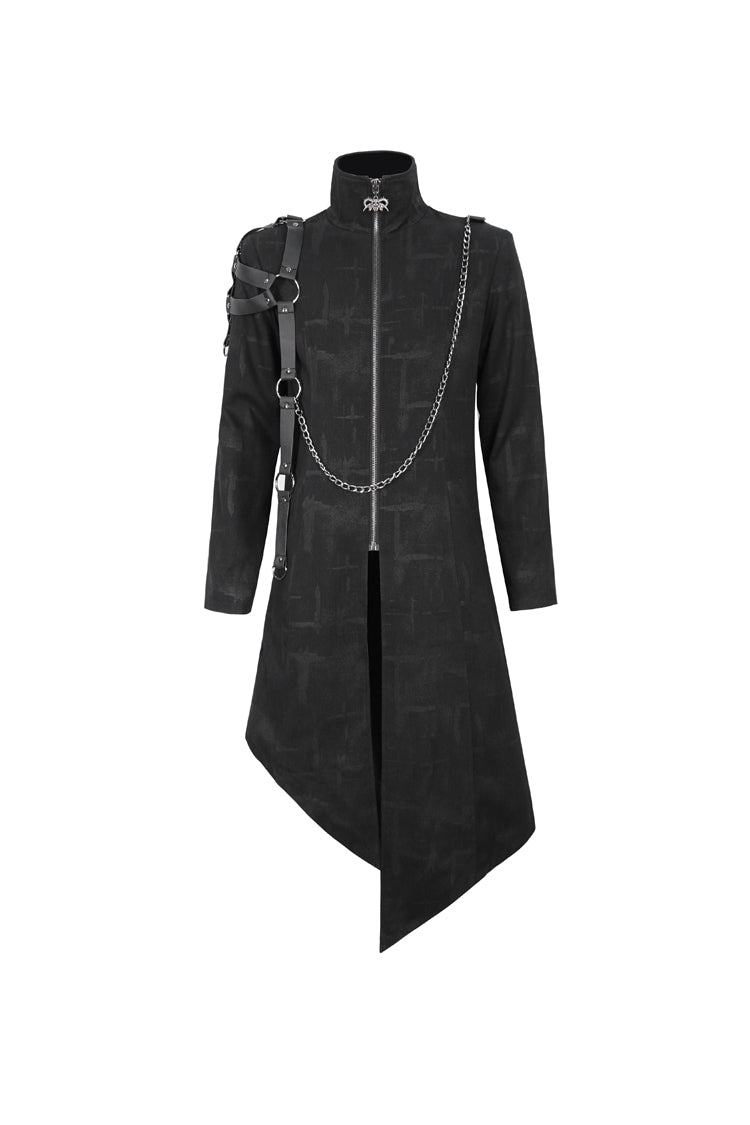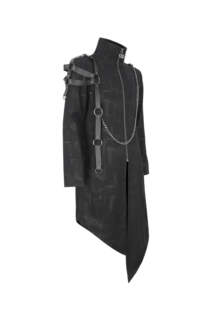 This coat has a harness on the right shoulder and a chain connected to the left shoulder. Asymmetric hem, stand collar, and skull zipper for closure. Swallow-tail on the back.