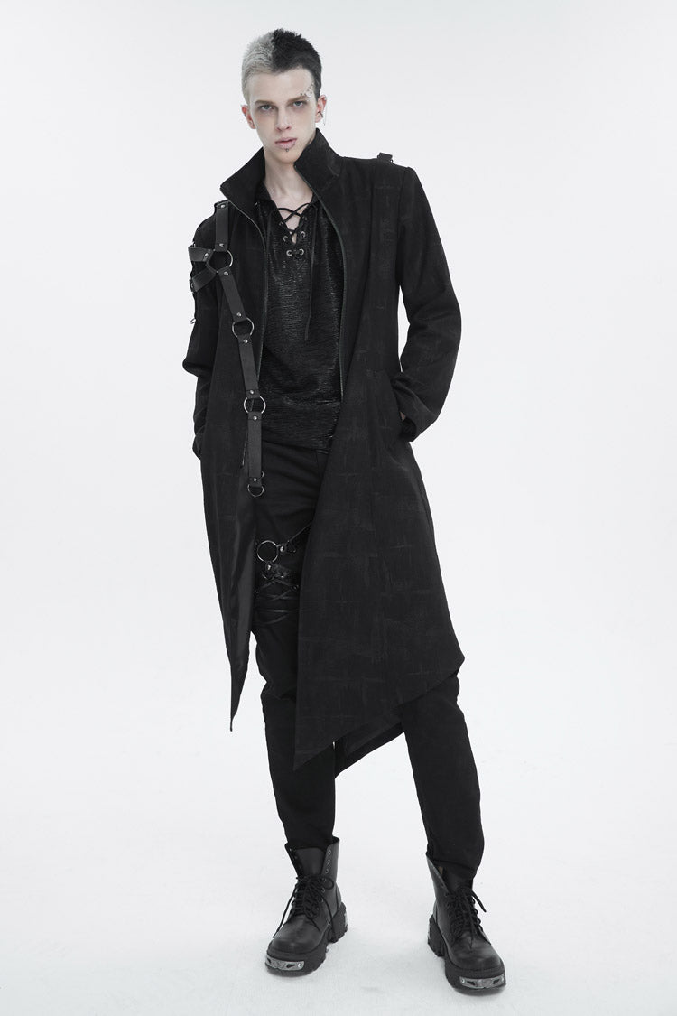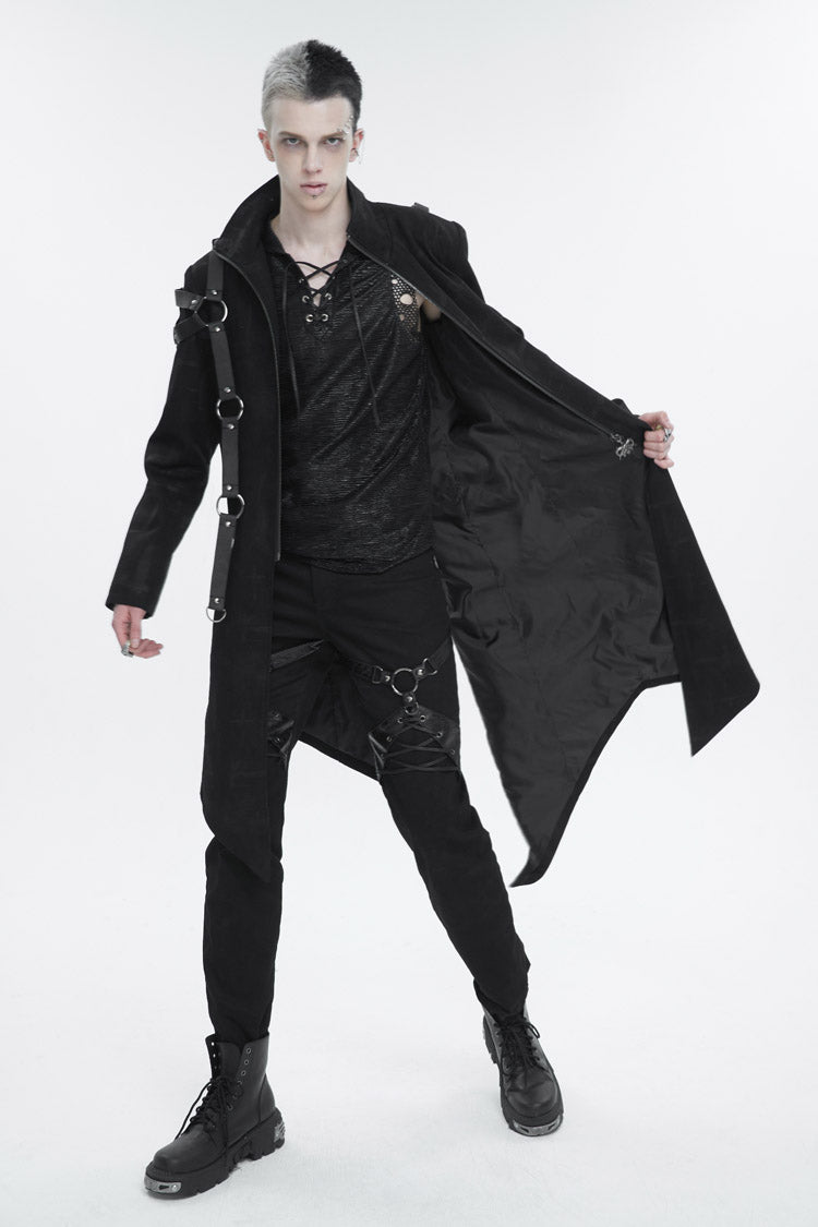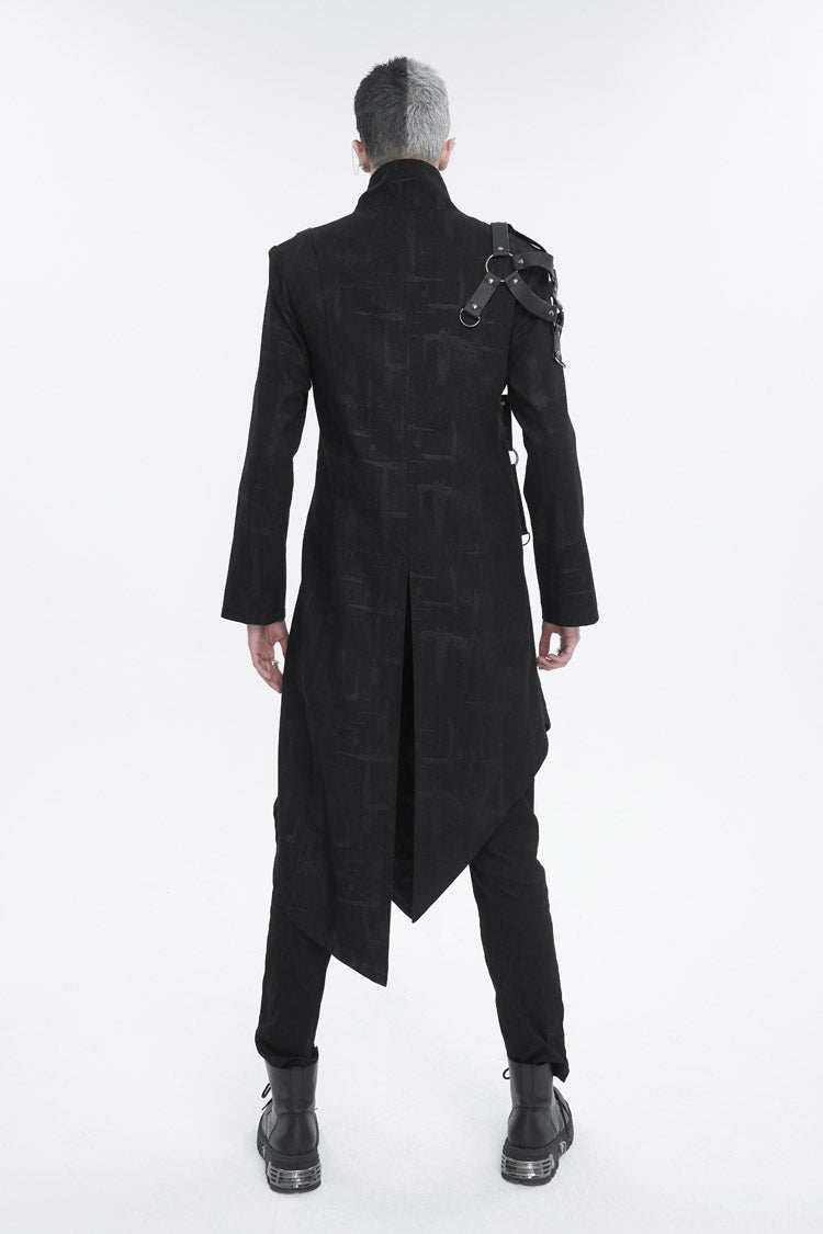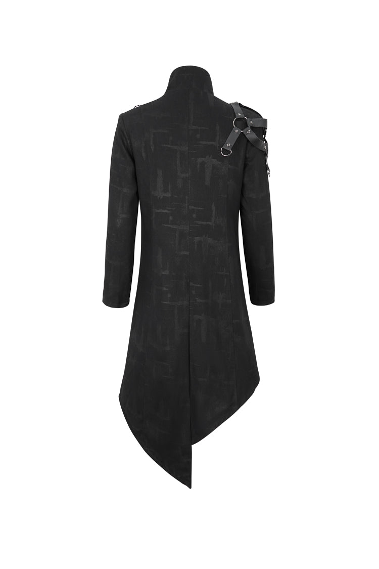 This coat has a harness on the right shoulder and a chain connected to the left shoulder. Asymmetric hem, stand collar, and skull zipper for closure. Swallow-tail on the back.