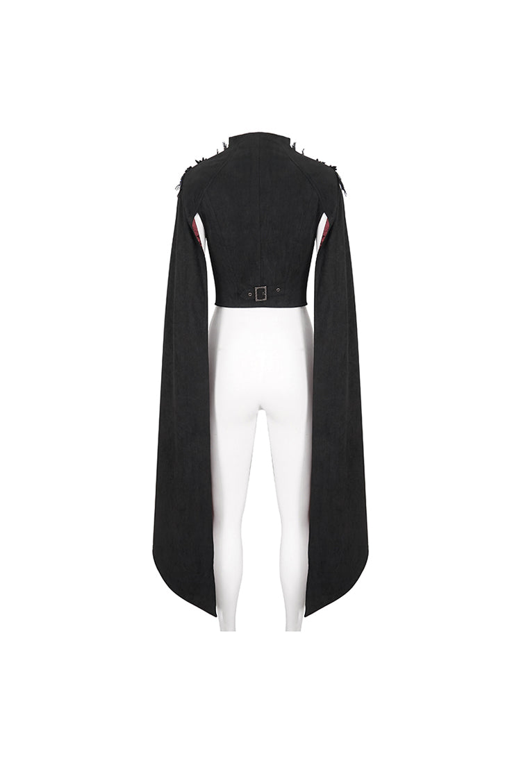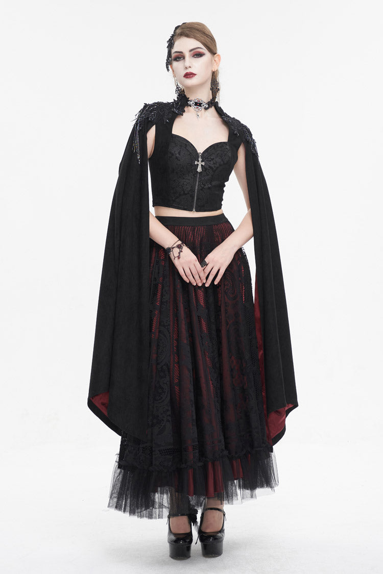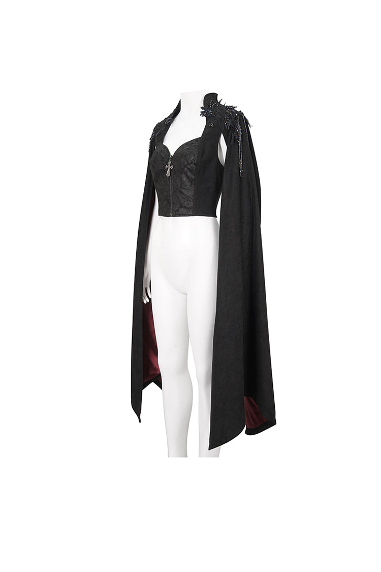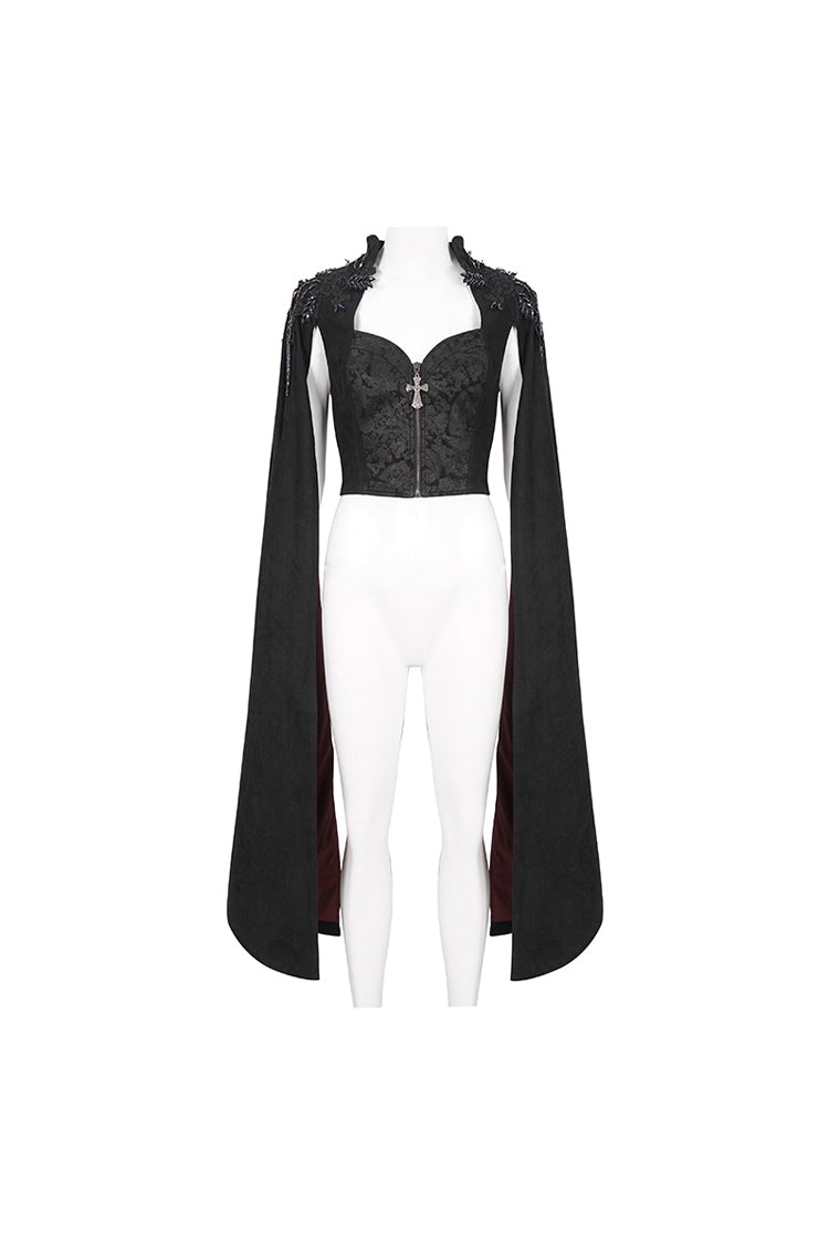This gothic shirt has super long flared sleeves. Floral embroidery and string-of-beads on the shoulders. It has stand collar, crossed zipper and buckle on the back. Slim fitted silhouette and no elastic fabric.