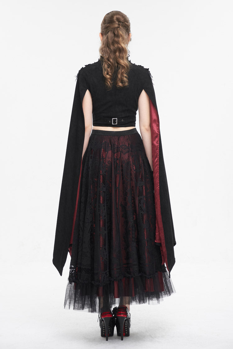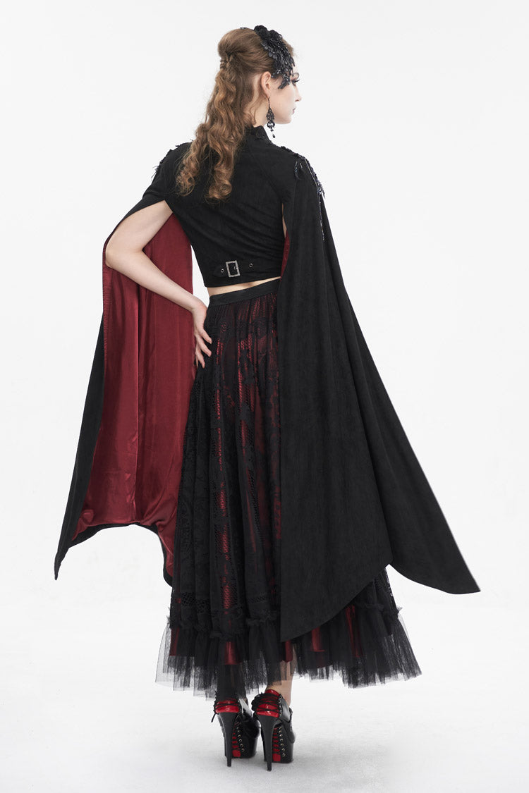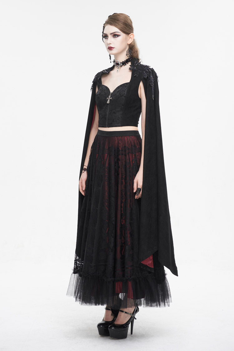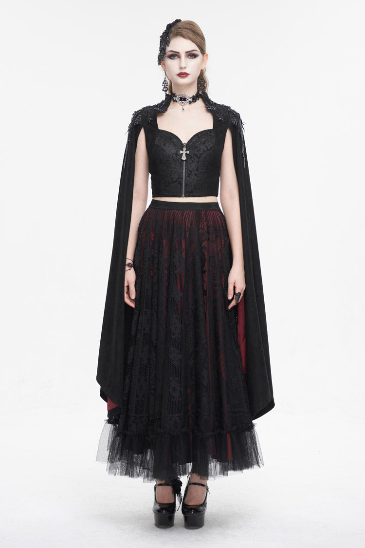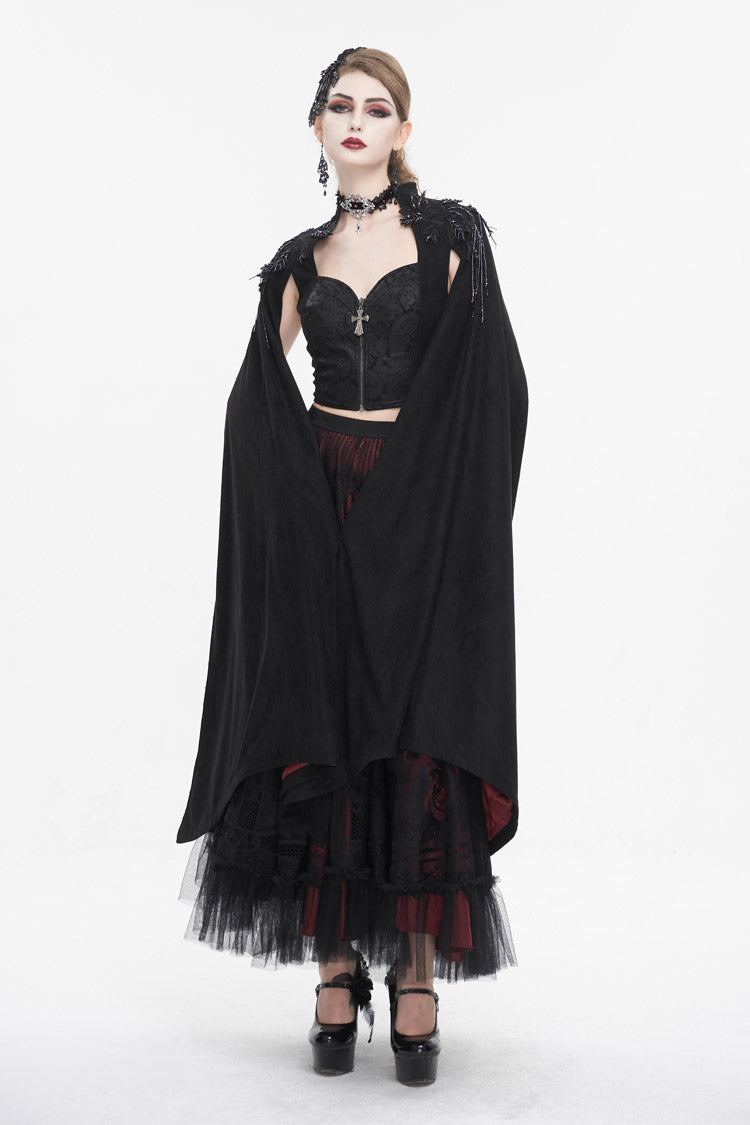 This gothic shirt has super long flared sleeves. Floral embroidery and string-of-beads on the shoulders. It has stand collar, crossed zipper and buckle on the back. Slim fitted silhouette and no elastic fabric.