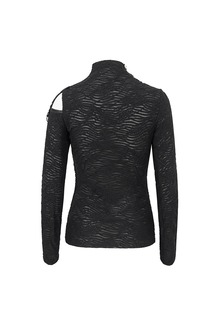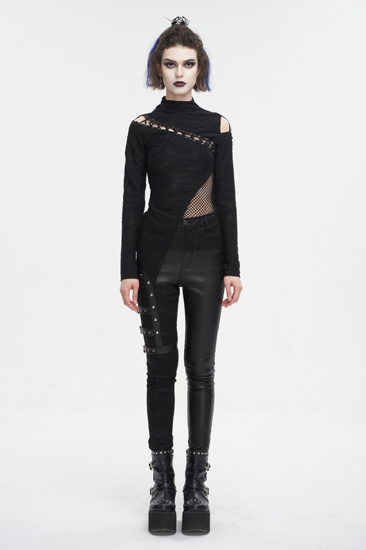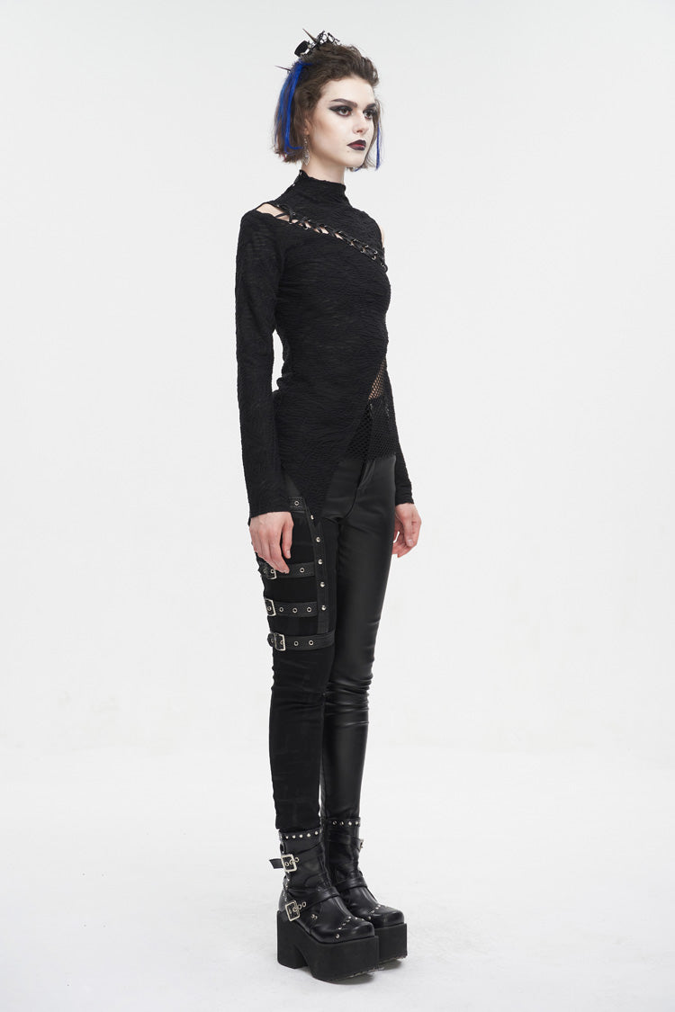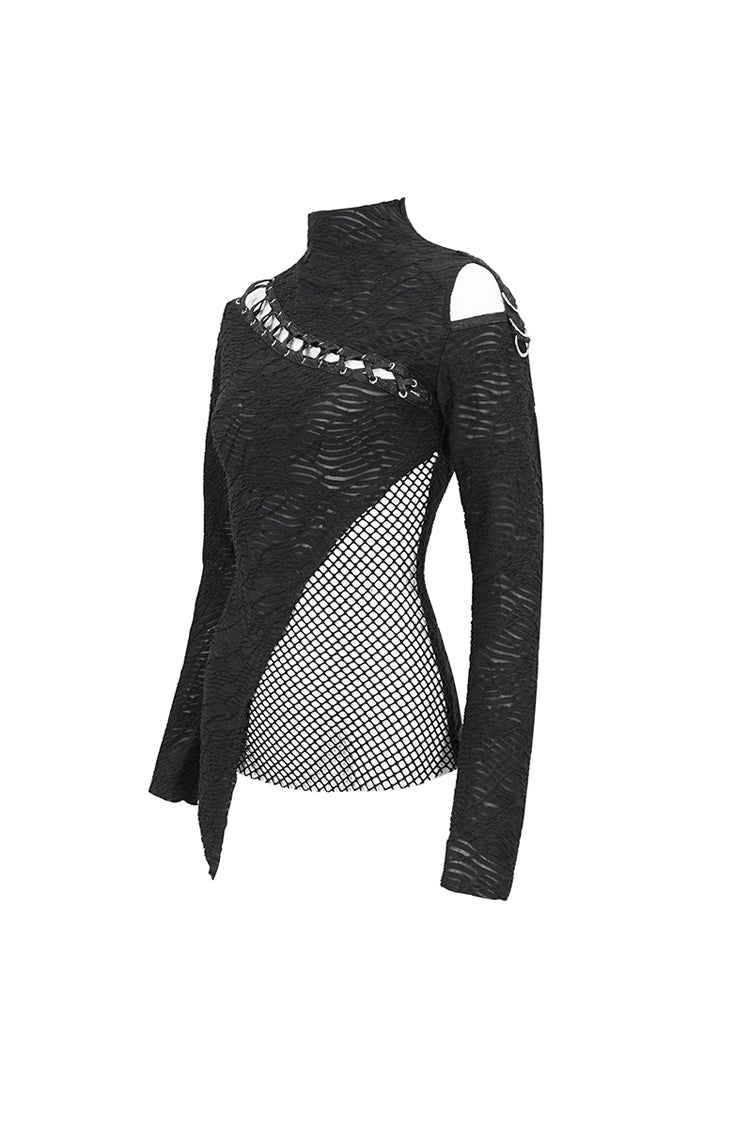 This gothic shirt has a half-high neck, irregular hem, and patchwork with mesh. It hollows out on the left shoulder and front. Cross straps at the front. Slim fitted silhouette.
