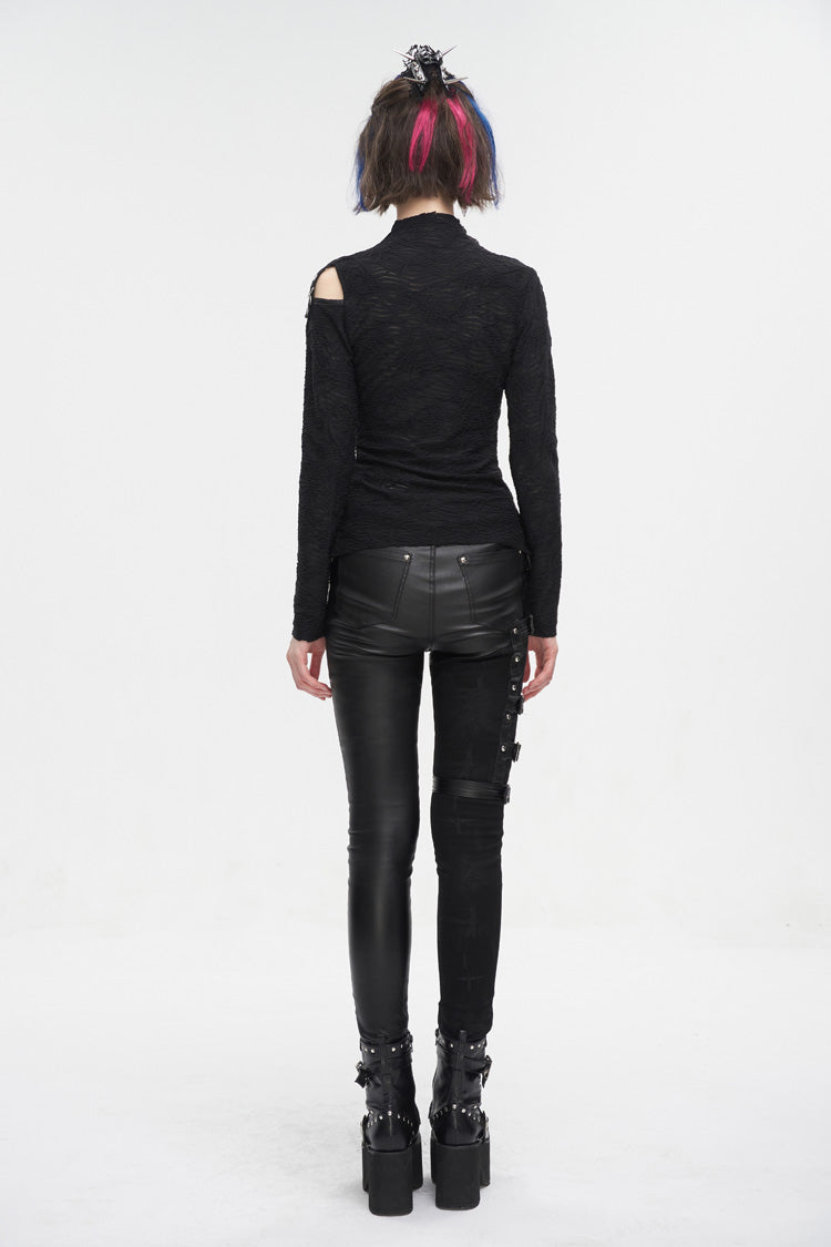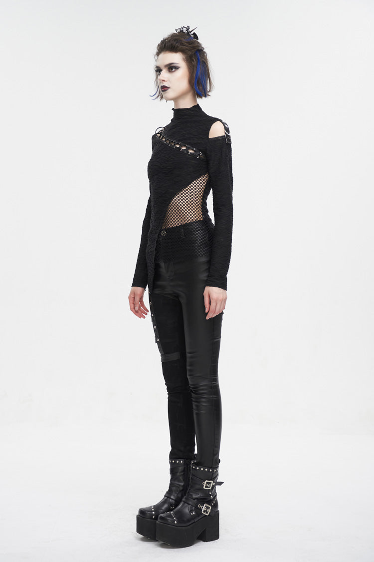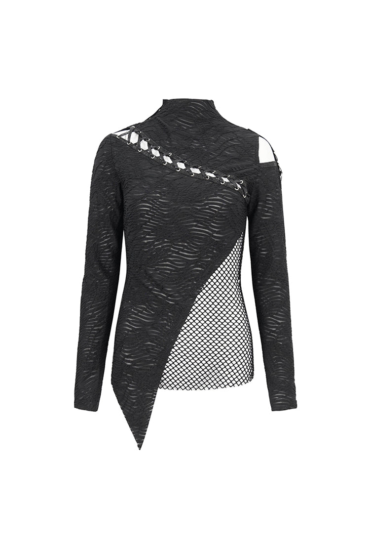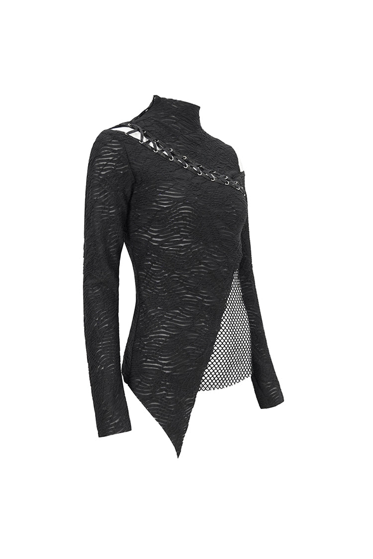This gothic shirt has a half-high neck, irregular hem, and patchwork with mesh. It hollows out on the left shoulder and front. Cross straps at the front. Slim fitted silhouette.