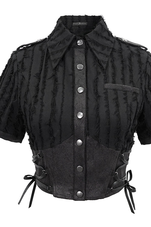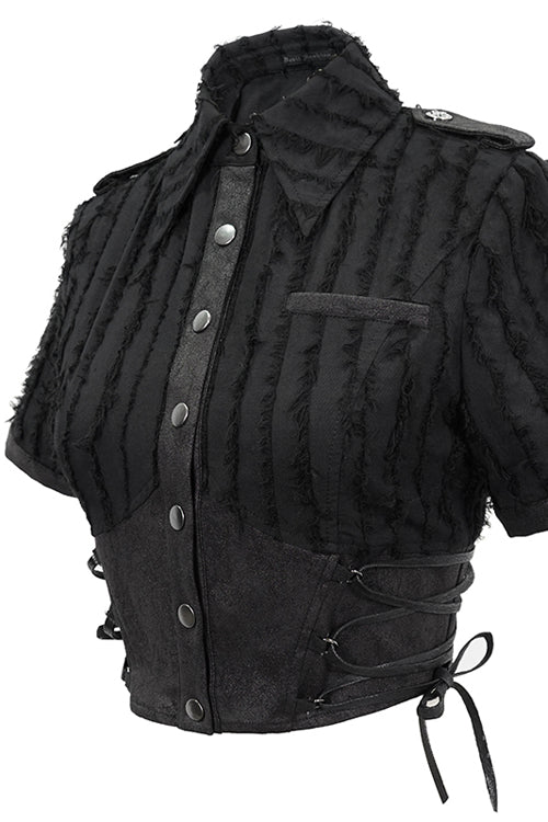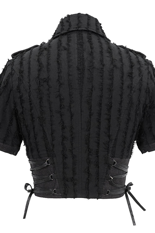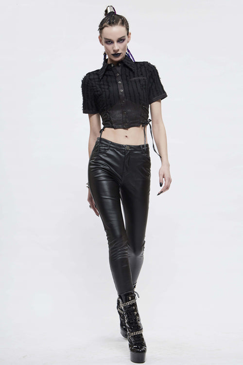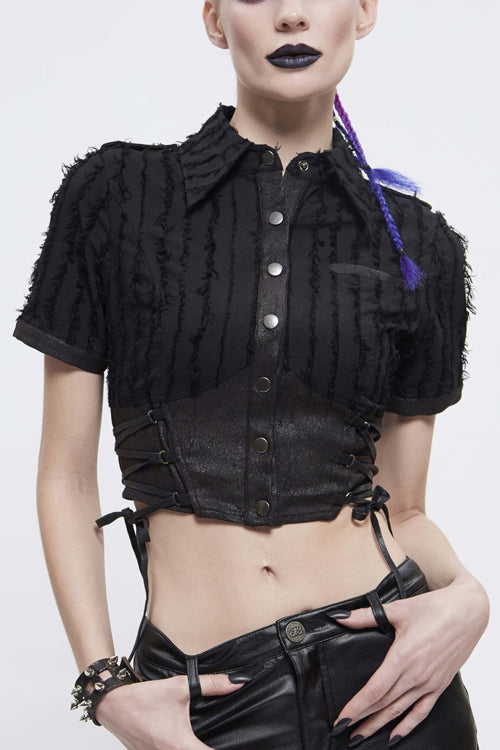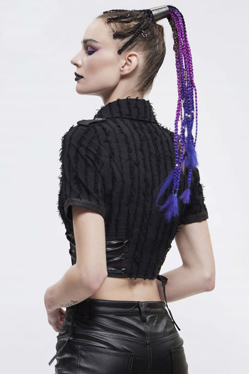 The main material is vertical strips of ragged material, and the waist section is similar to the belts design with shiny glued material, the side ties can be adjusted, and the shoulder loops echo. The whole style is simple everyday punk style.