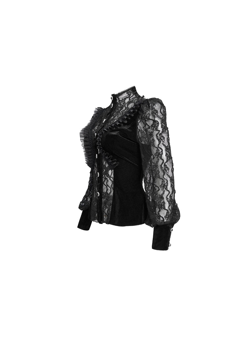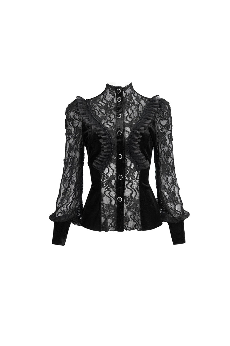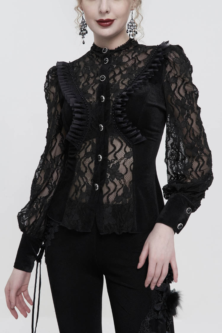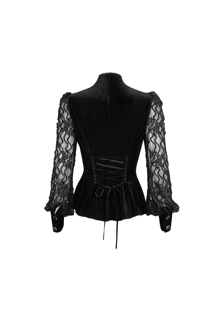The main material is made of Black dark-grained velvet fabric, the center front and sleeves are made of three-dimensional fringed iris mesh fabric, high collar design, fake bodice design, and the back center string can be adjusted.