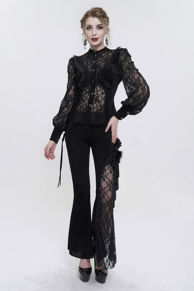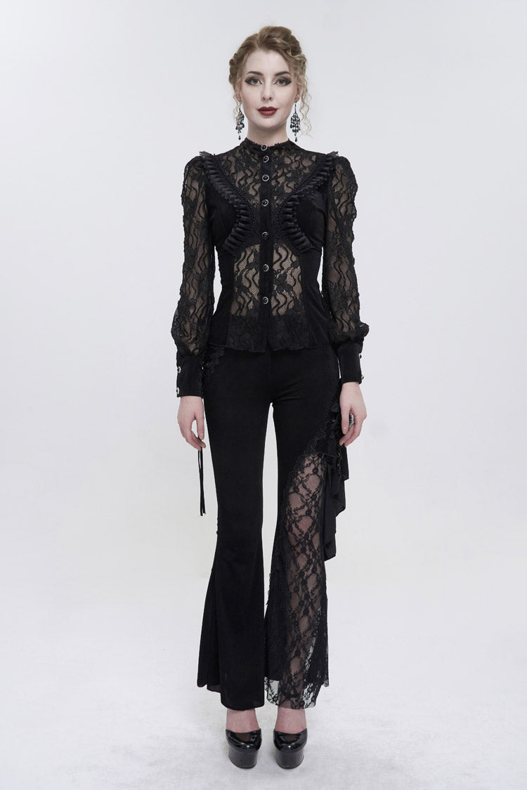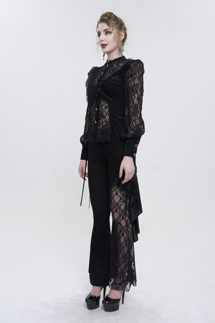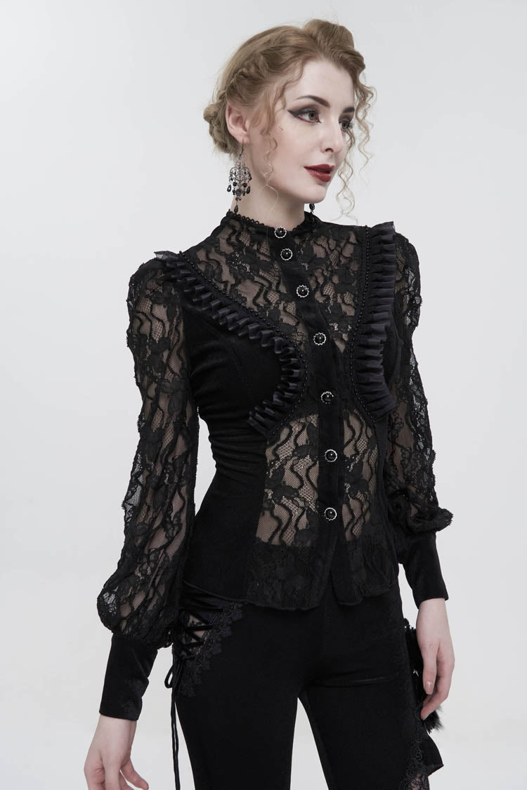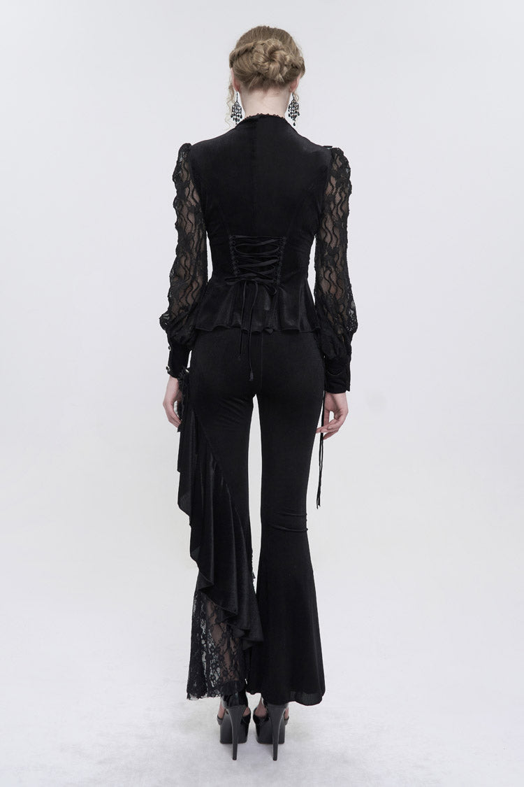 The main material is made of Black dark-grained velvet fabric, the center front and sleeves are made of three-dimensional fringed iris mesh fabric, high collar design, fake bodice design, and the back center string can be adjusted.