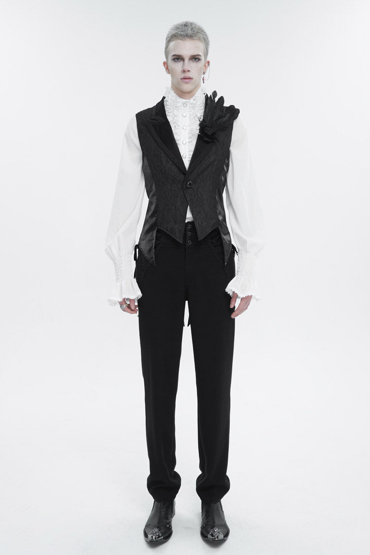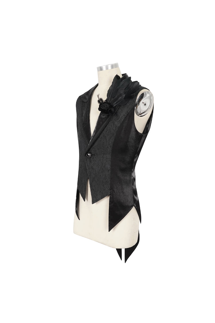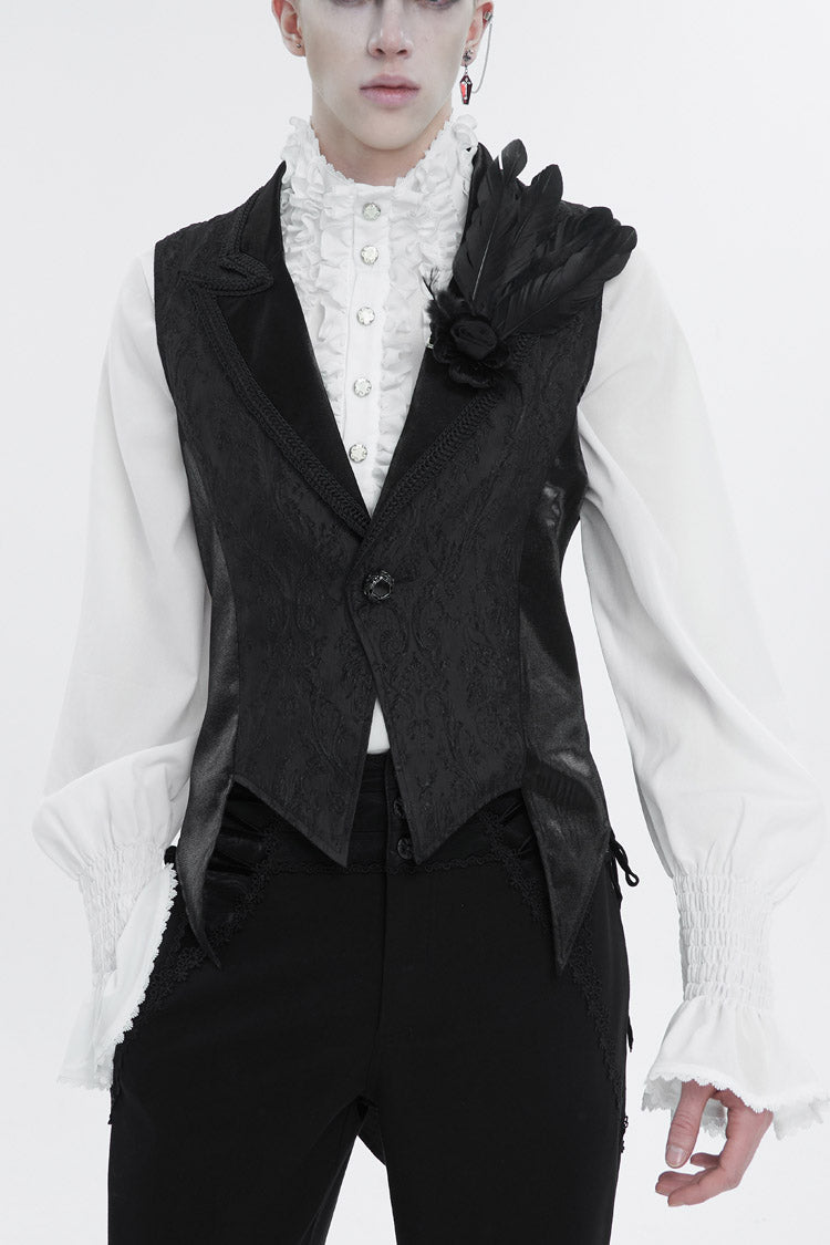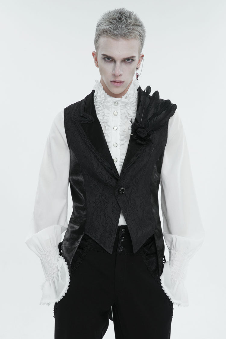 Black dark flower jacquard fabric spliced with black weft velveteen, three-dimensional webbing stitched on the crossed inverted triangle placket, decorated with high-grade glass carved buckles, and concealed buttons sewn at the bottom.