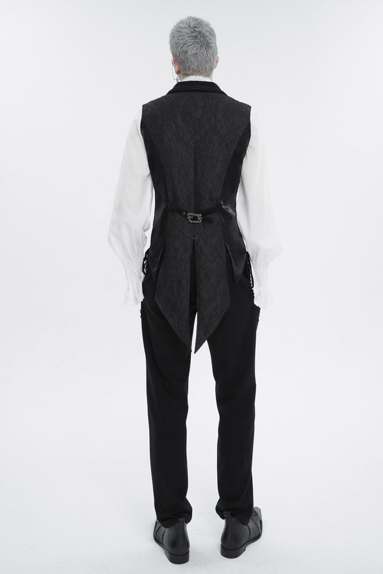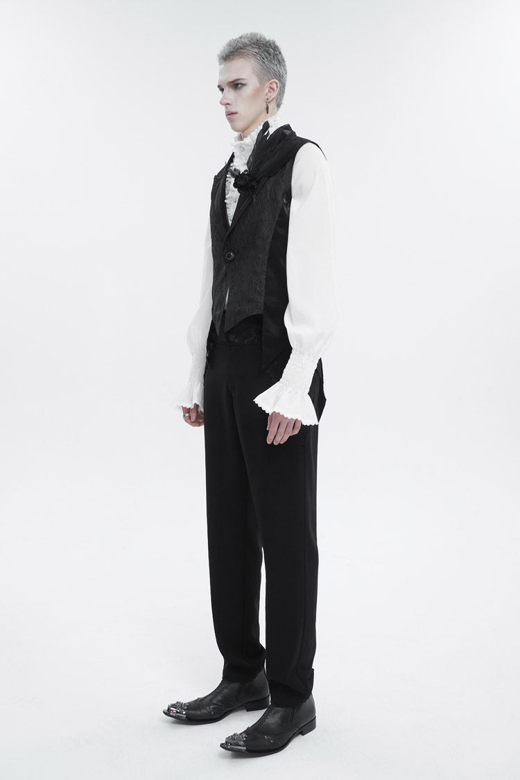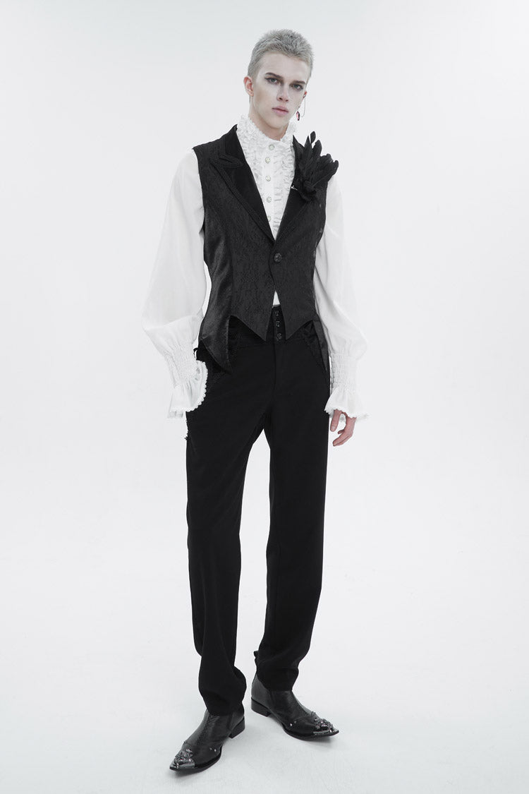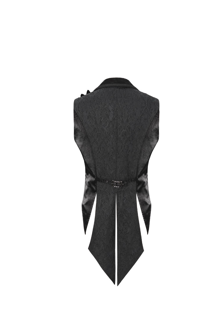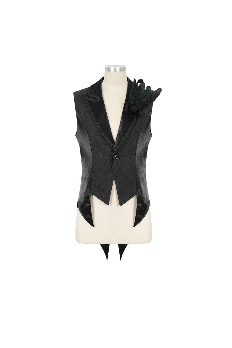 Black dark flower jacquard fabric spliced with black weft velveteen, three-dimensional webbing stitched on the crossed inverted triangle placket, decorated with high-grade glass carved buckles, and concealed buttons sewn at the bottom.