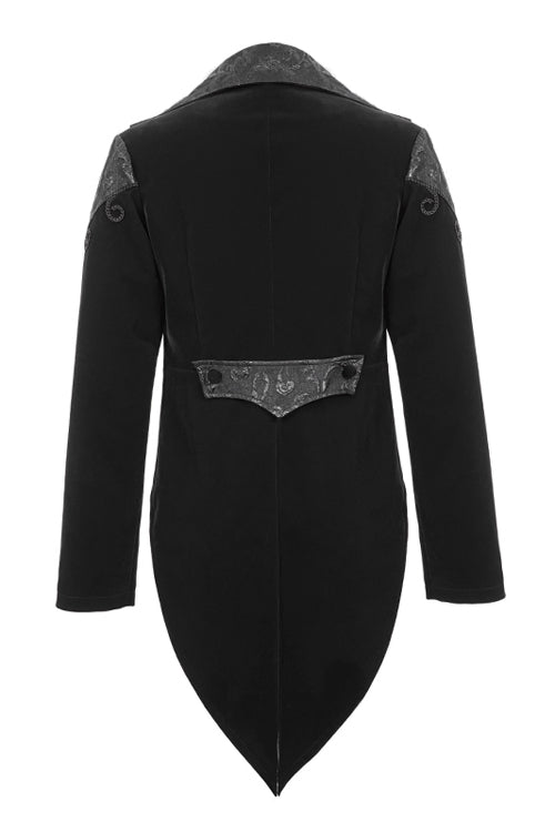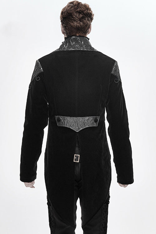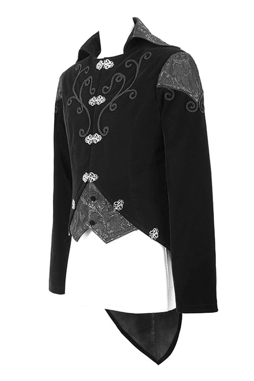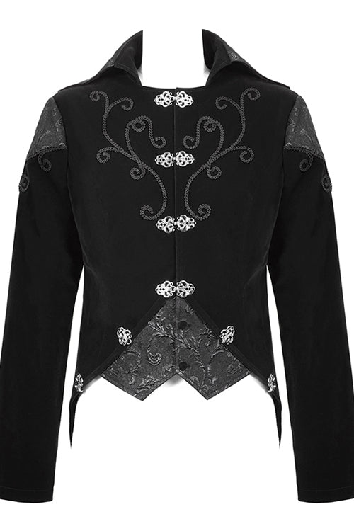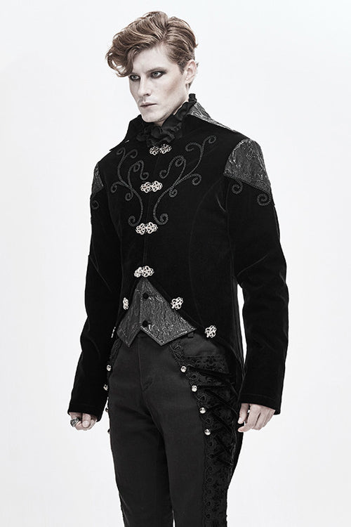 Black weft velvety fabric splicing three-dimensional jacquard fabric, made of fake two pieces design.Hand-embroidered chest, decorated with vintage hook clasp.