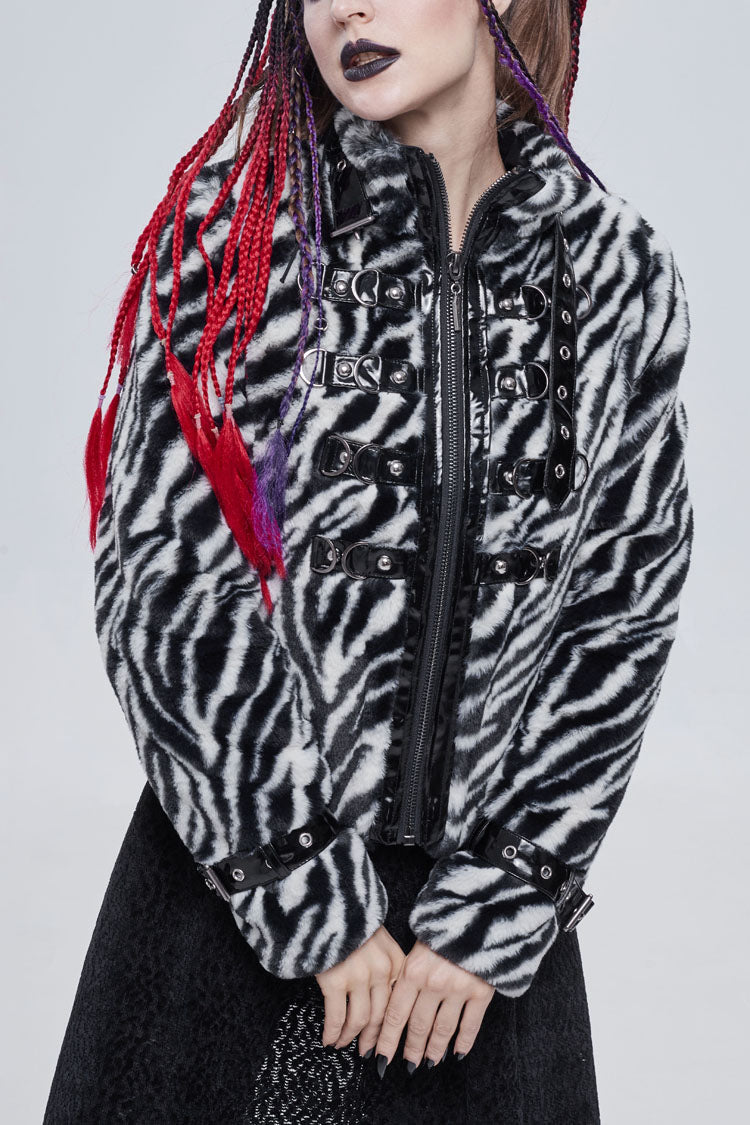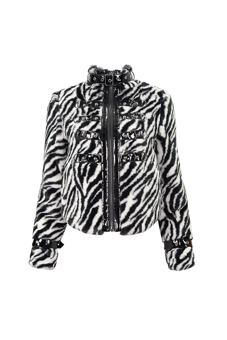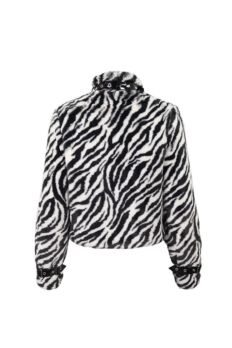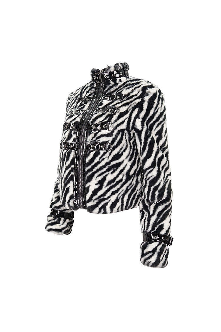 The main fabric is made of thick black and white striped fake wool, with bright leather loops, the front chest loop is decorated with D-shaped buttons, the leather loops on the cuffs and collar can be removed, and the inner lining is quilted with cotton interval, which is suitable for daily wear in autumn and winter.