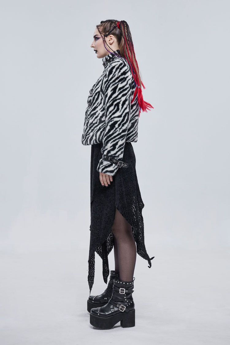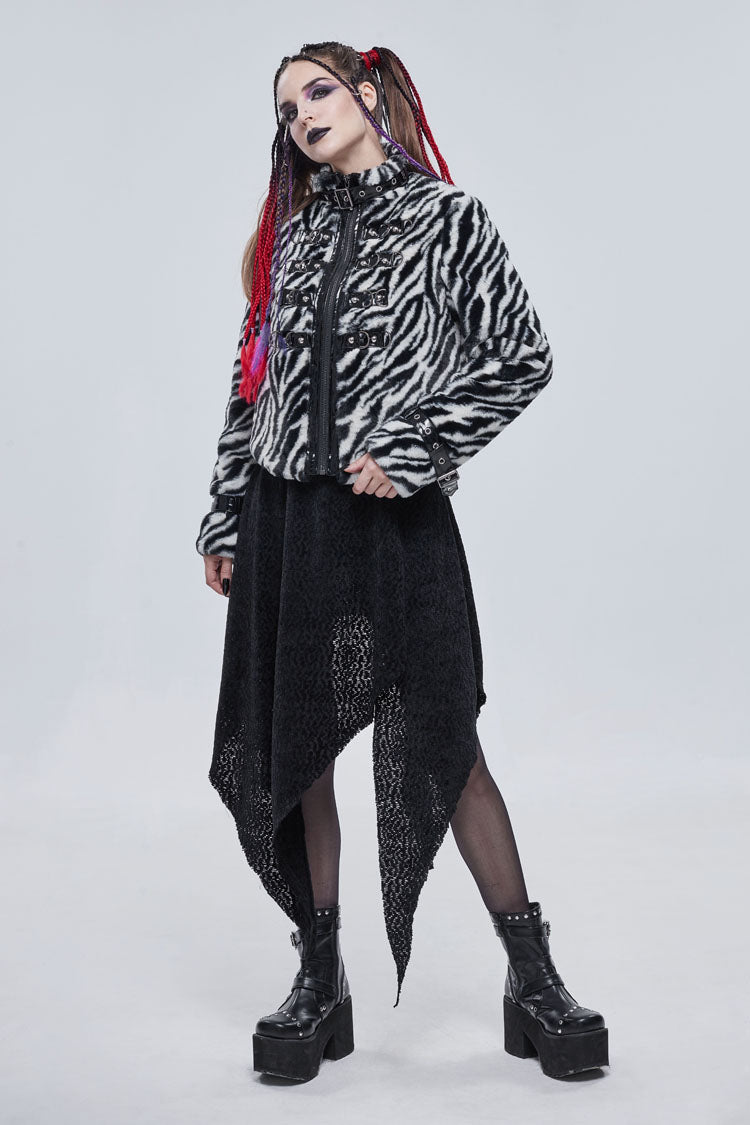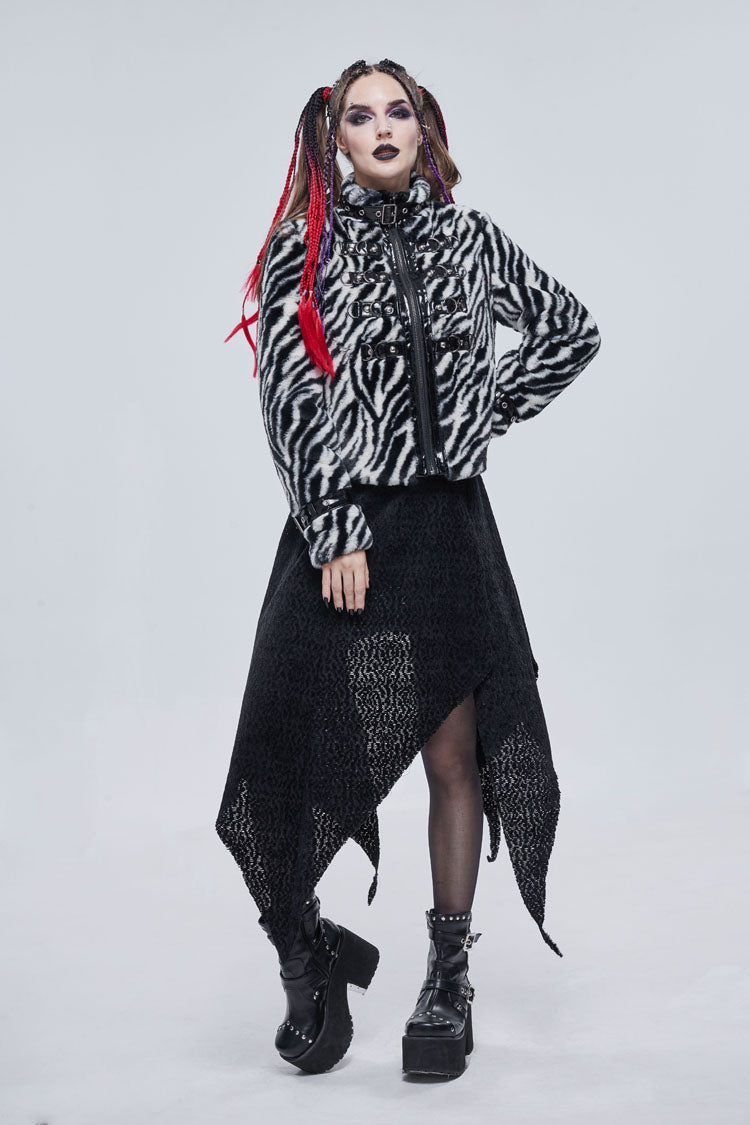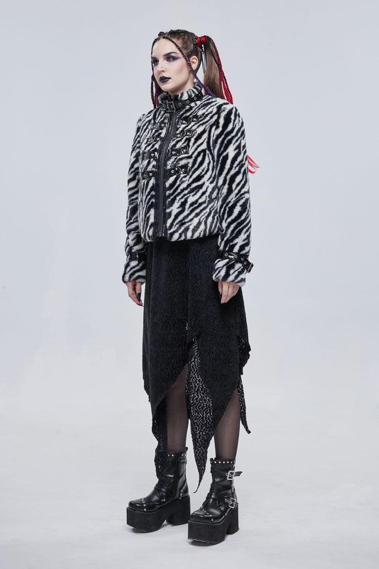 The main fabric is made of thick black and white striped fake wool, with bright leather loops, the front chest loop is decorated with D-shaped buttons, the leather loops on the cuffs and collar can be removed, and the inner lining is quilted with cotton interval, which is suitable for daily wear in autumn and winter.