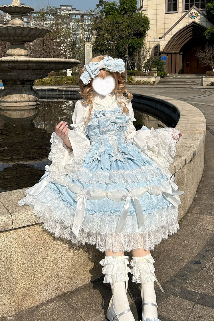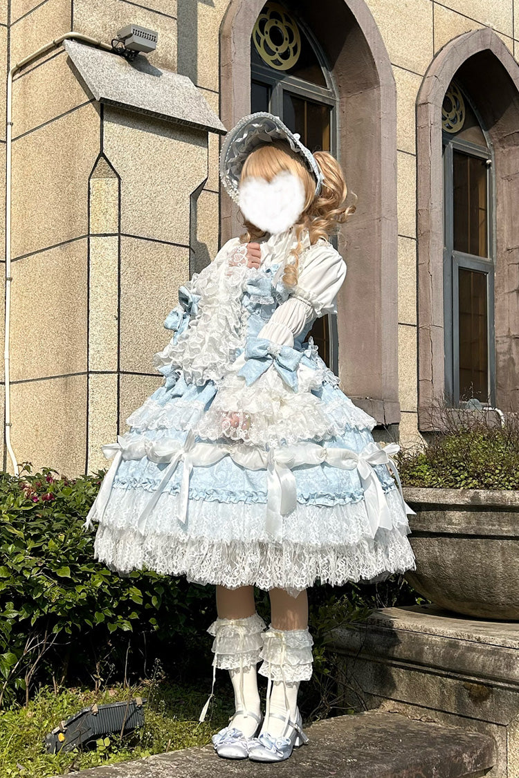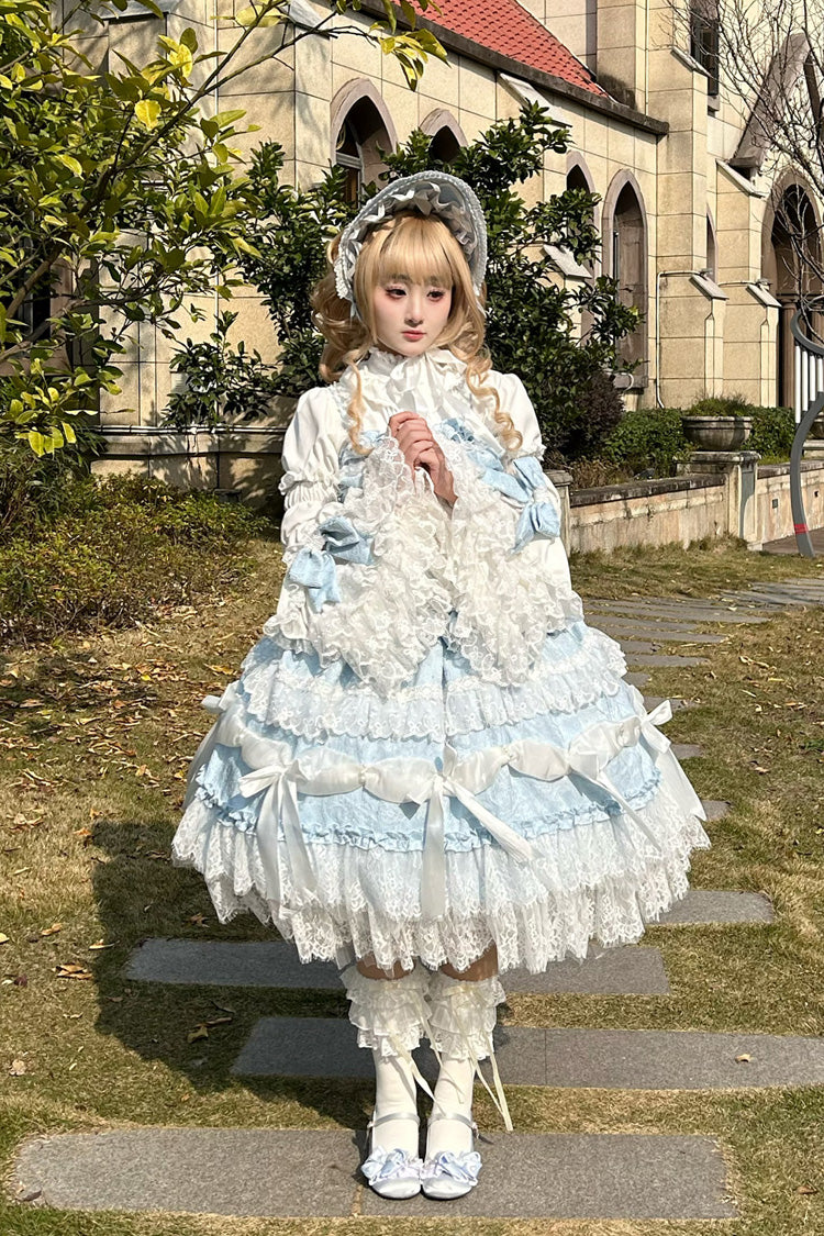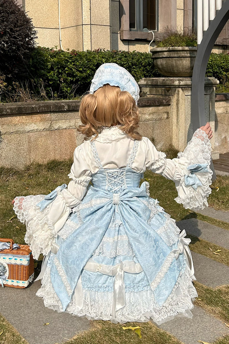 Enthalten: Kleid + Stirnband + Brustschleife + Hut + Ärmel-Schleife (2 Stück) + Ärmel + Zwei Stücke + Schleppe + Taillenschleife