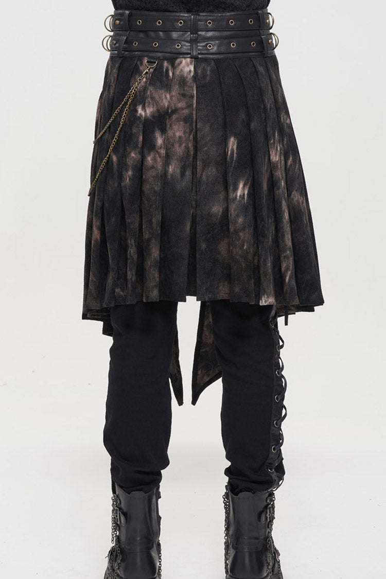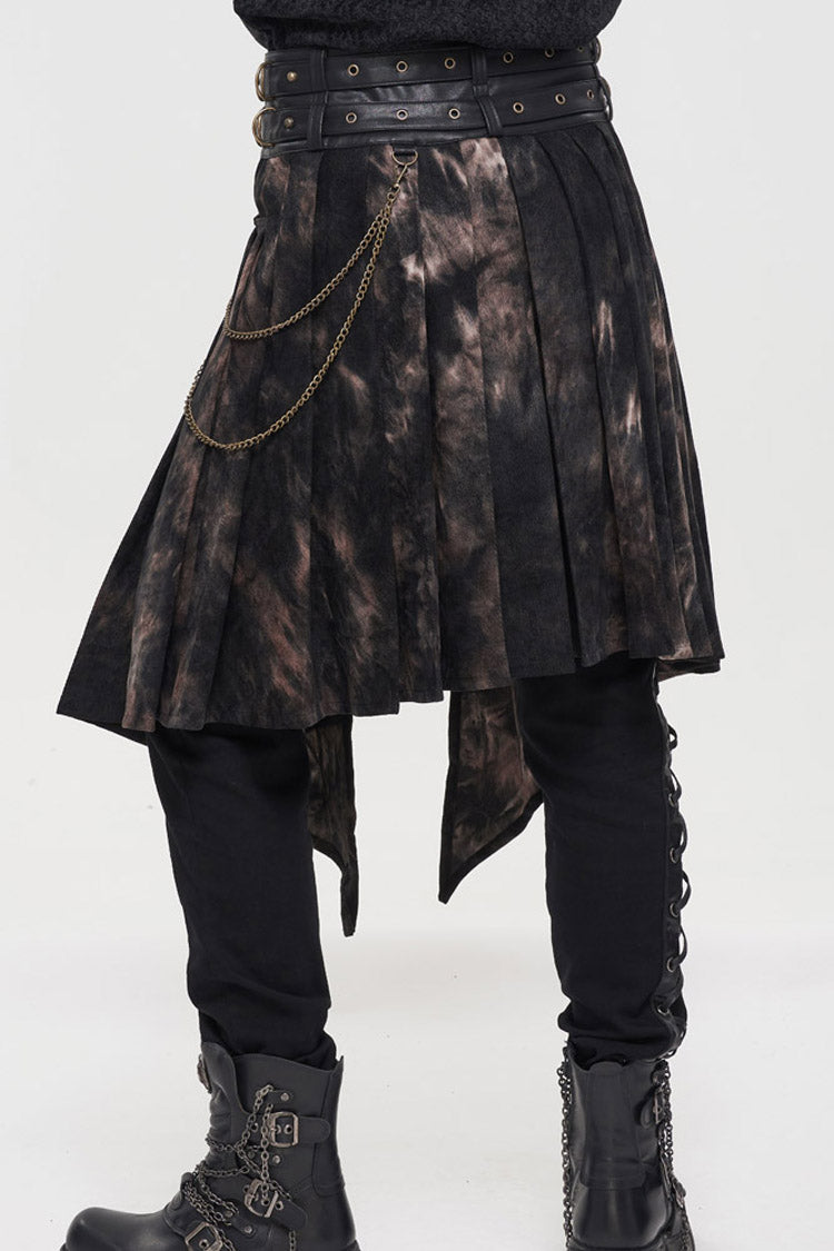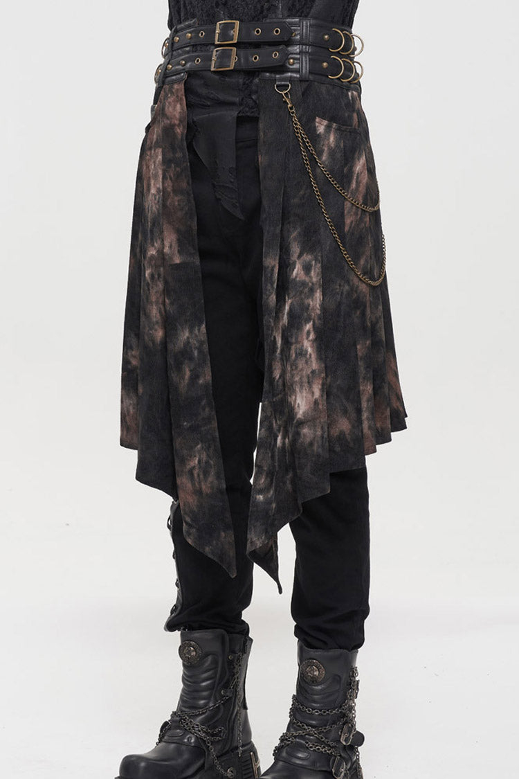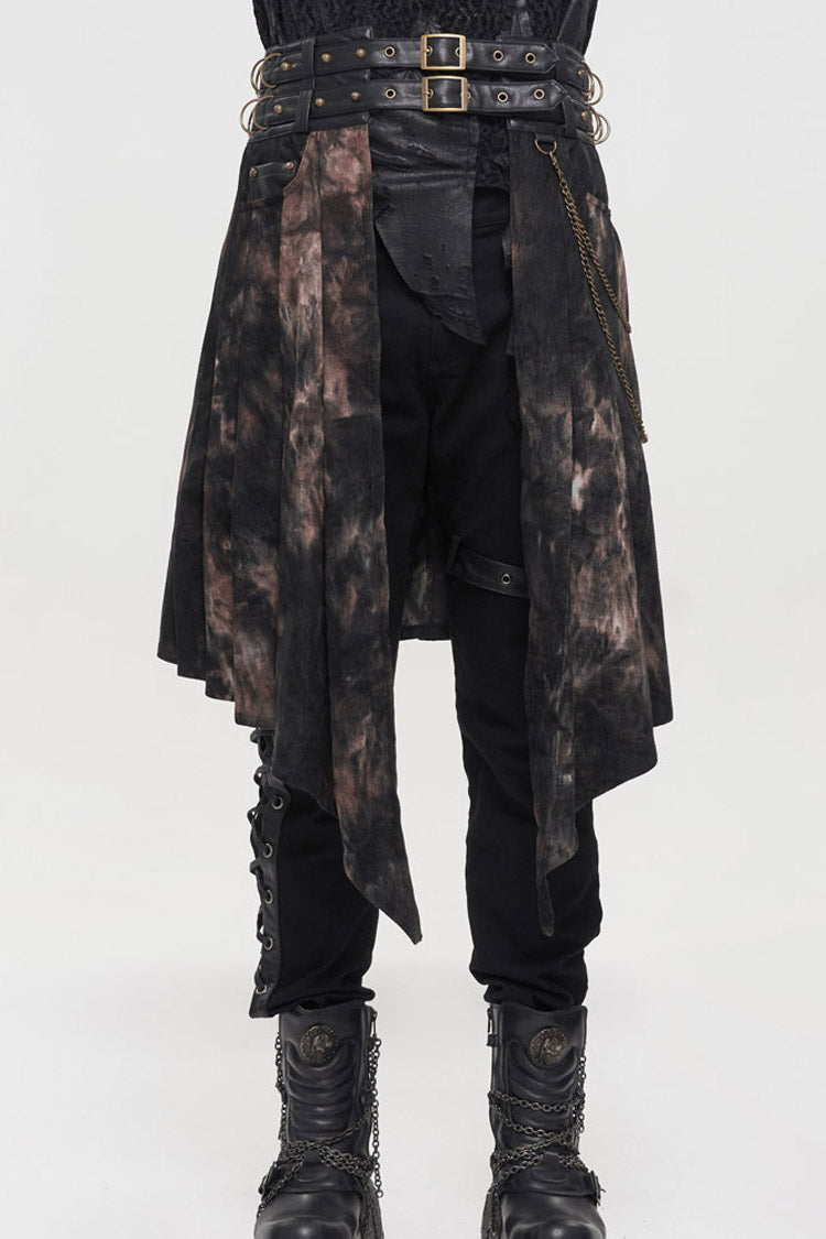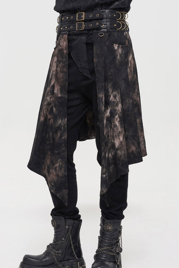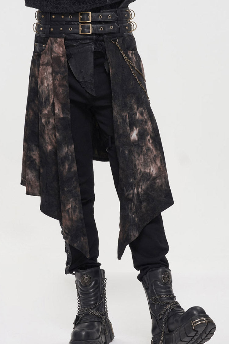 The main material is corduroy to tie the dye, the waist is combined with the leather material, all the auxiliary materials are bronze, and the false girdle design is used. Open pockets on both sides.