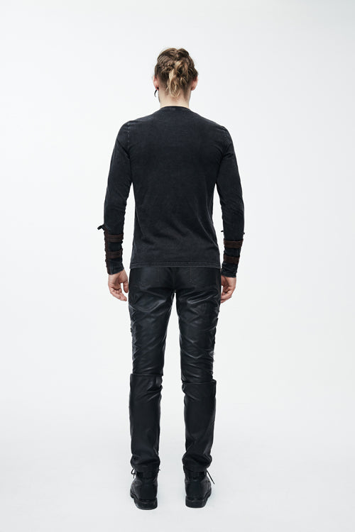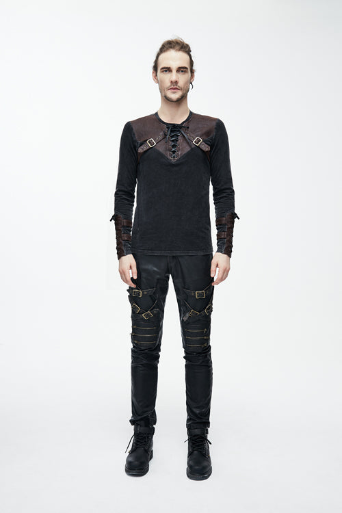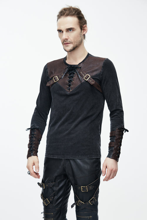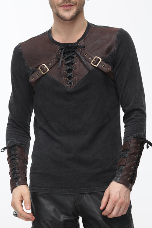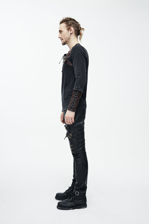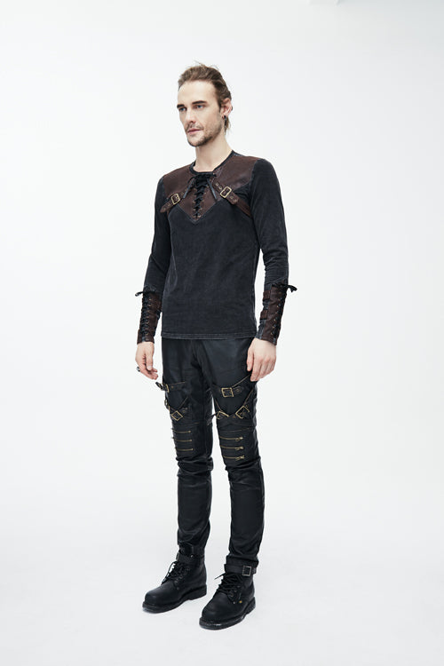 Black pure cotton knitted fabric with good elasticity is stitched with coffee heat seal backing fabric, corns are tied on the chest, the leather loop is used faded buckle, and the cuff rope is tied and make the loop.