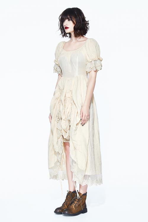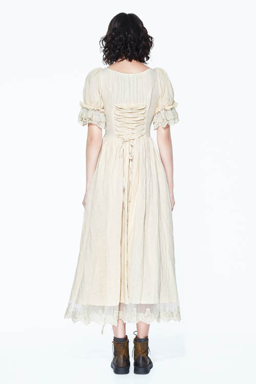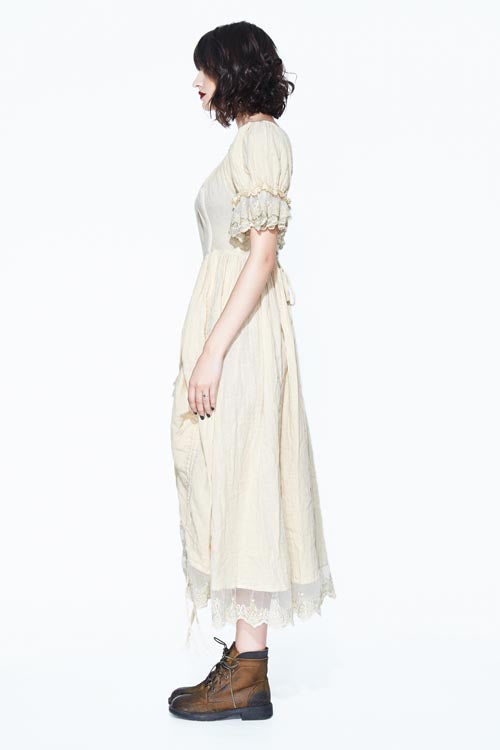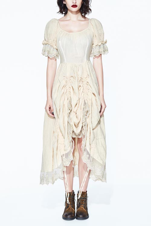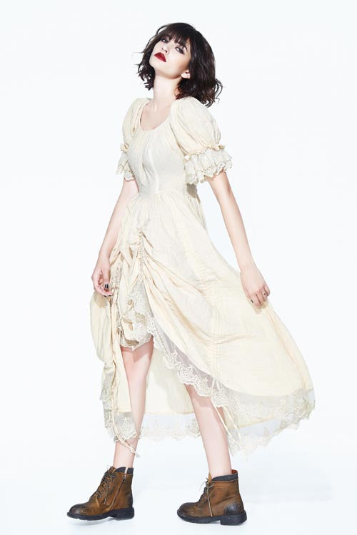 The whole piece is made of creamy white coarse yarn double layer woven fabric, cuffs and hem were stitched with expensive light gold embroidered lace, the chest stitching with creamy white three-dimensional ribbons, the bottom drawstring, the back elastic ribbon can be adjusted.