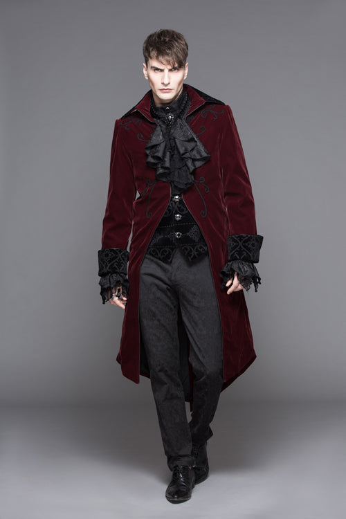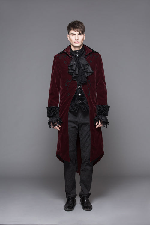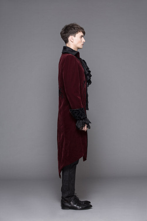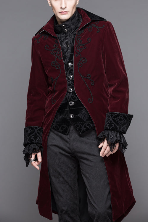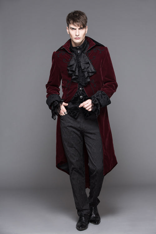 Wine velvet fabric stitching with black gothic burnt-out woollen material to make the fake two pieces coats, the chest is made of black hand embroidery, using glass patterned button.