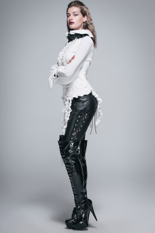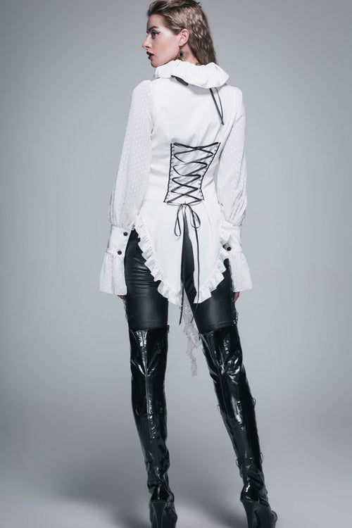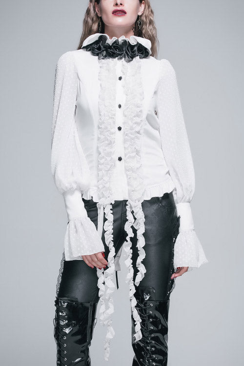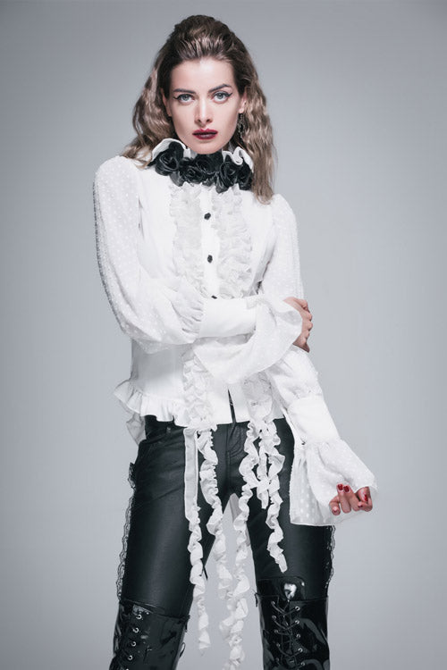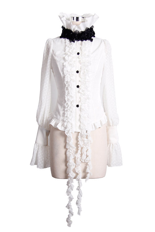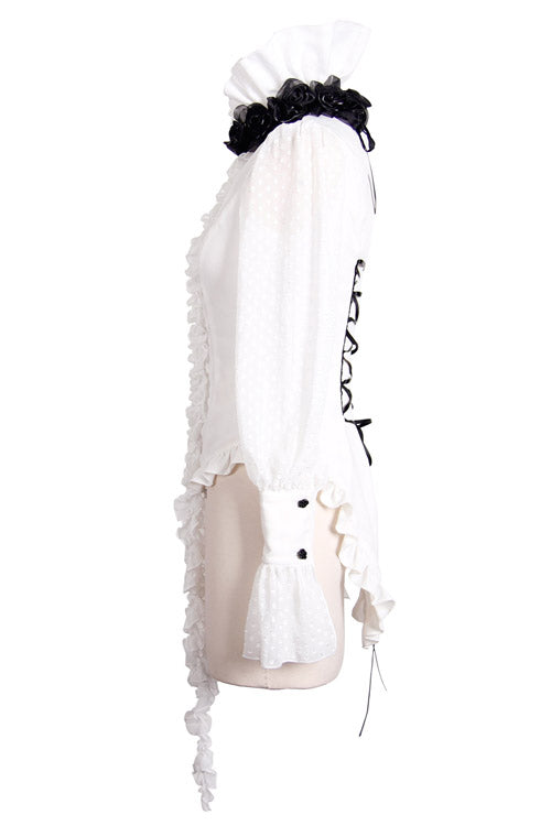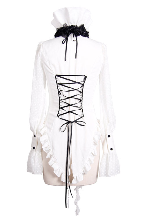 The whole piece is made of white chiffon fabric,spliced with white lace, Irregular flounces hang down naturally on the chest, and the black rose bow tie can be removed.The back is tied with black ribbon to adjust the waist, and the dovetail hem is designed.