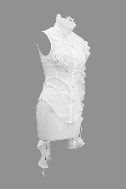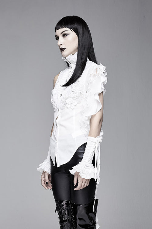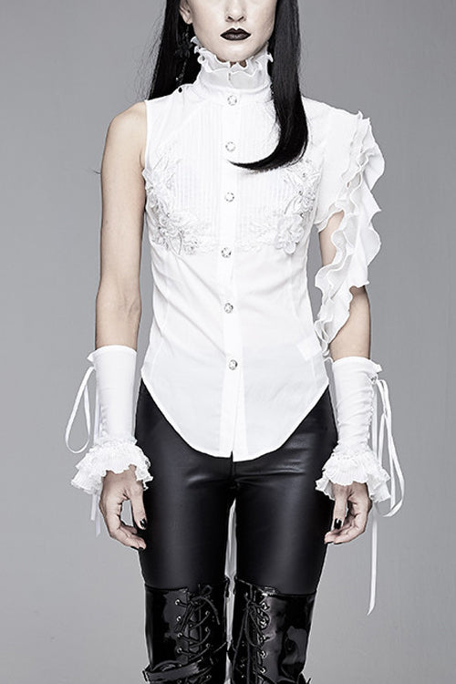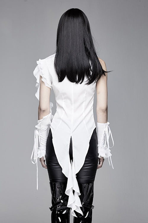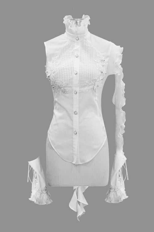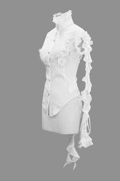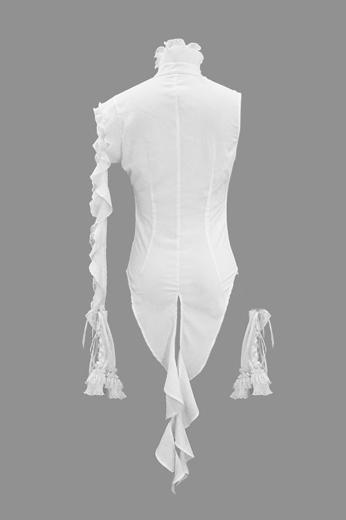 The fabric is made of similar to chiffon material, with ruffled lace.Asymmetric design of two sleeves, one side of the sleeve, one side of the twining lace.Swallowtail style in the back.Suitable for spring and autumn and summer.