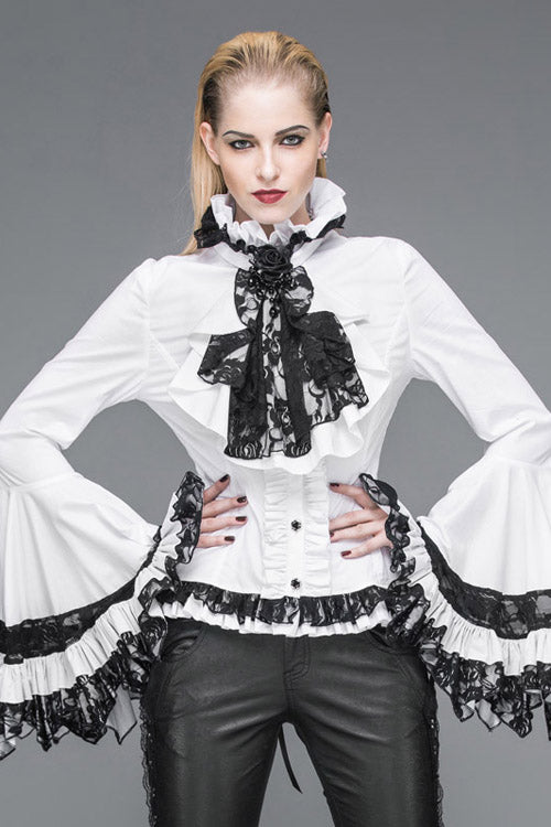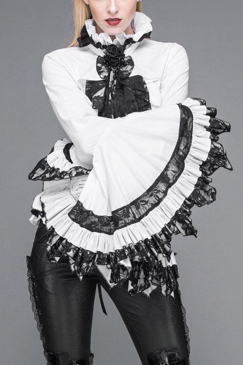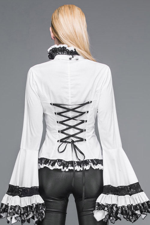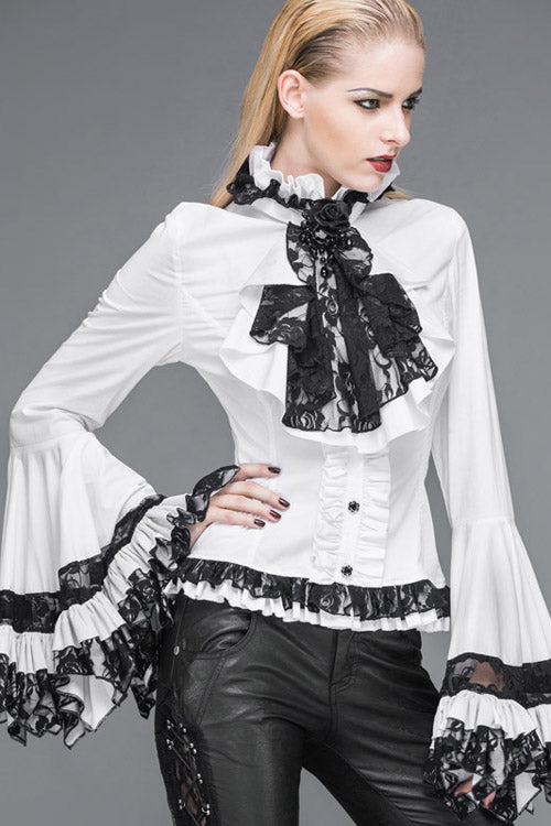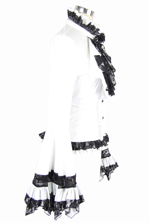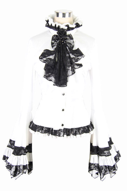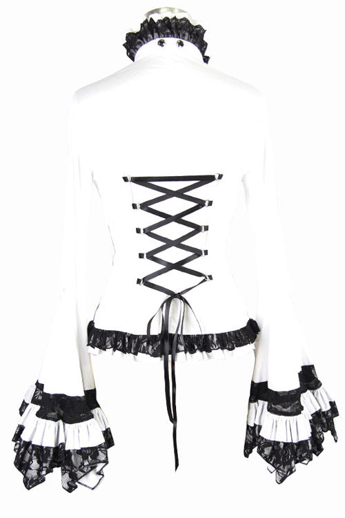The whole piece is made of white cotton elastic shirt material,spliced with black lace, big horn sleeve design, horn cuff made into sharp-angled flounces,the back ribbons can be adjusted, and the tie can be removed.