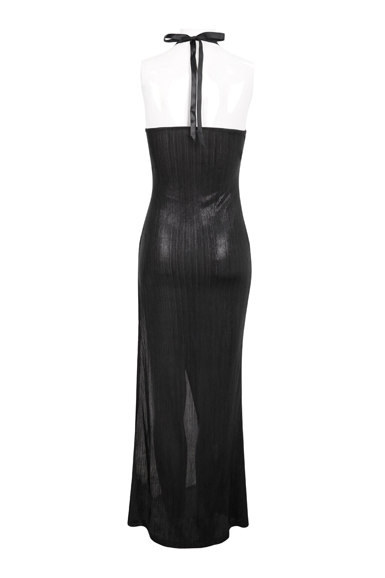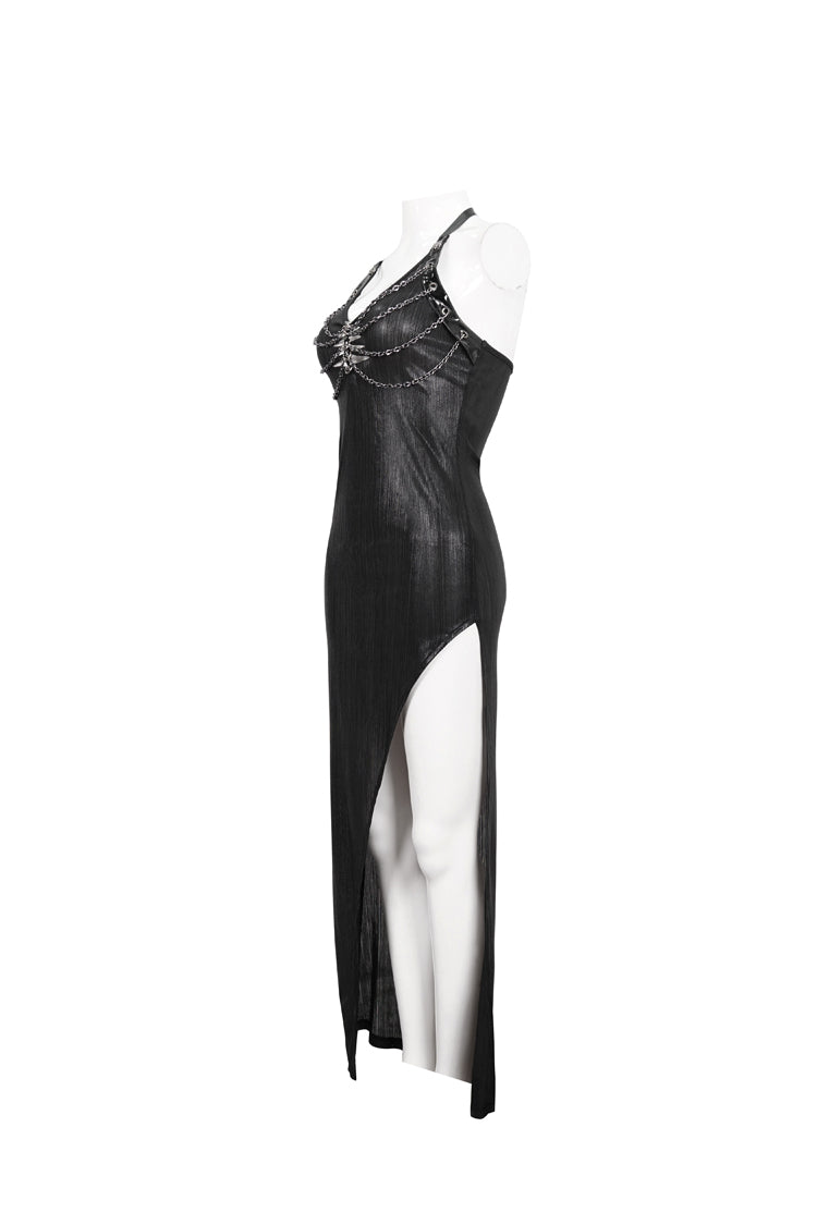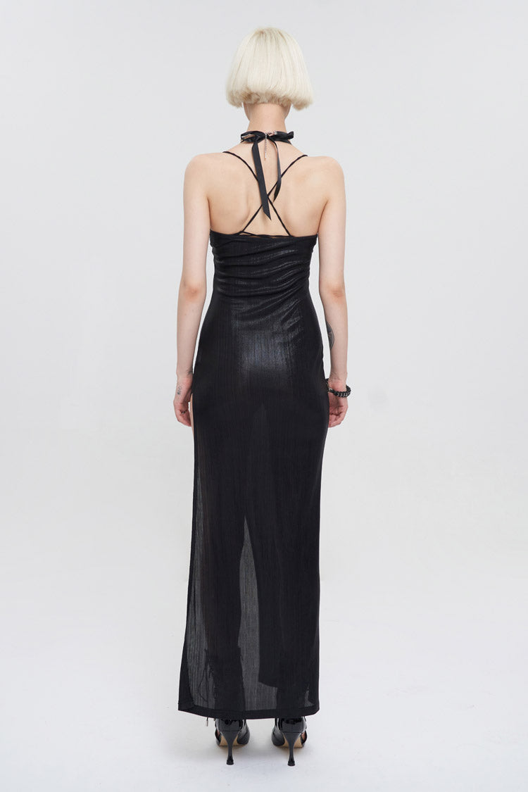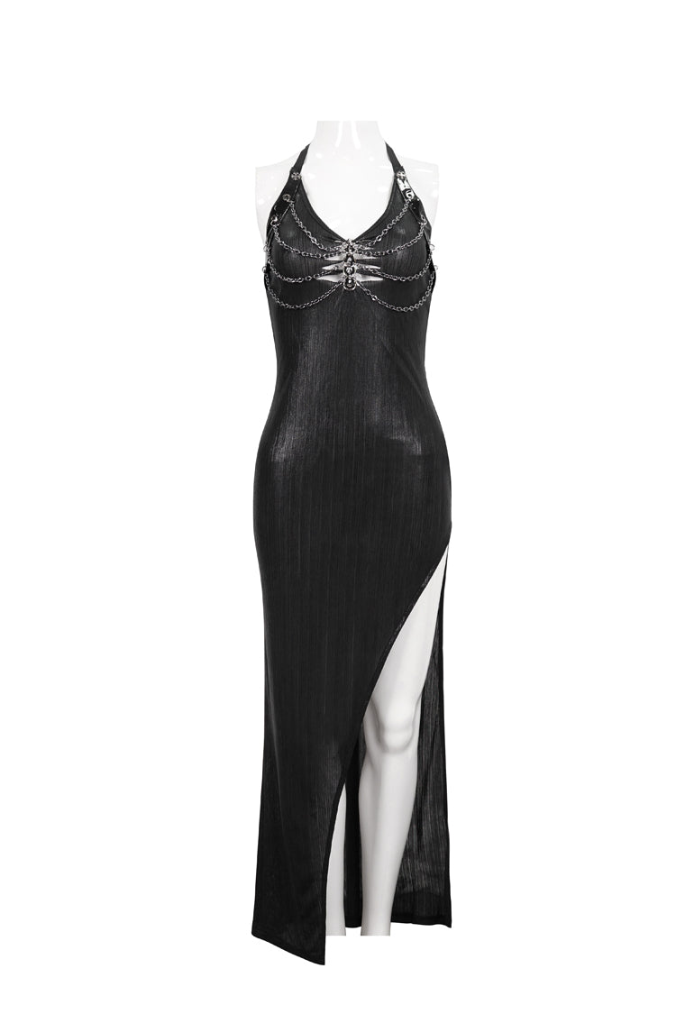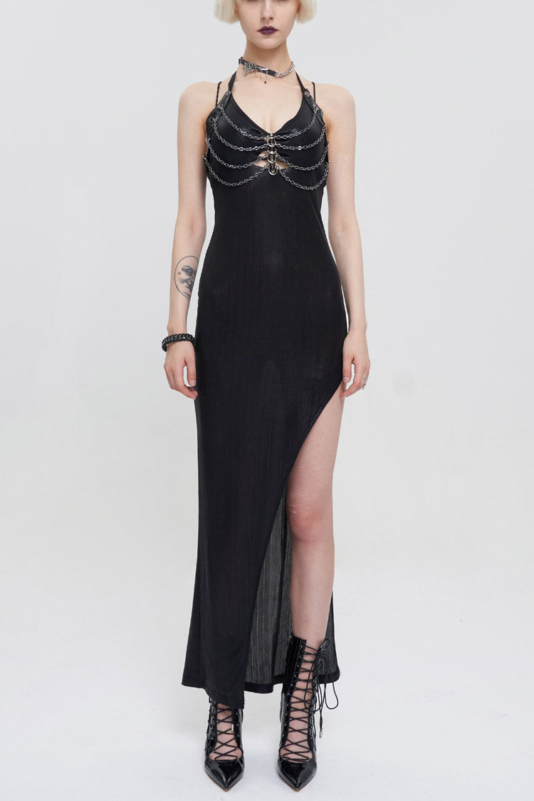 The whole piece is made of knitted bright vertical stripes, the front middle burnt flower braided metal hoop, the chest is hung with chain decoration, and the thigh high slit design.