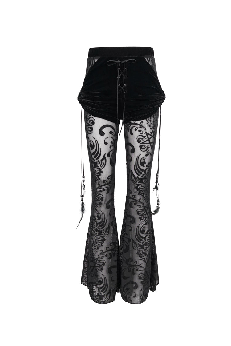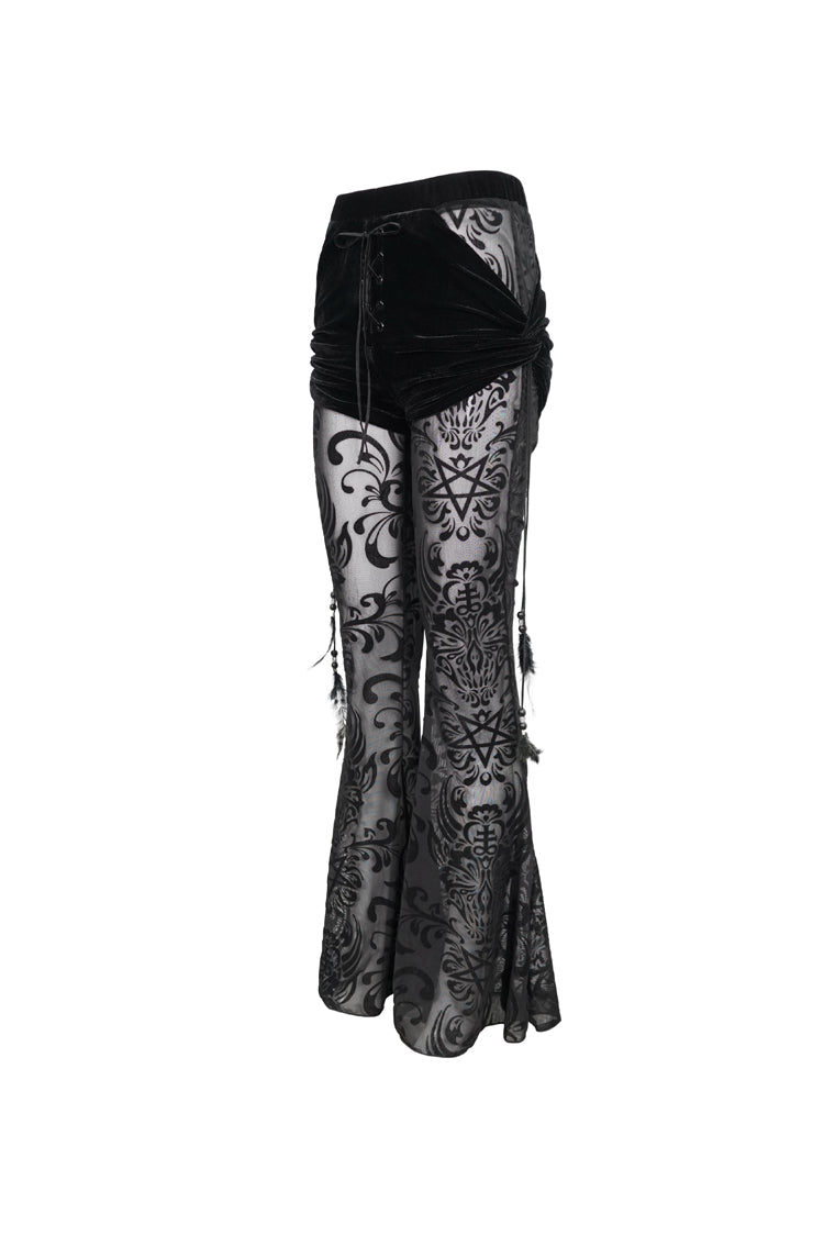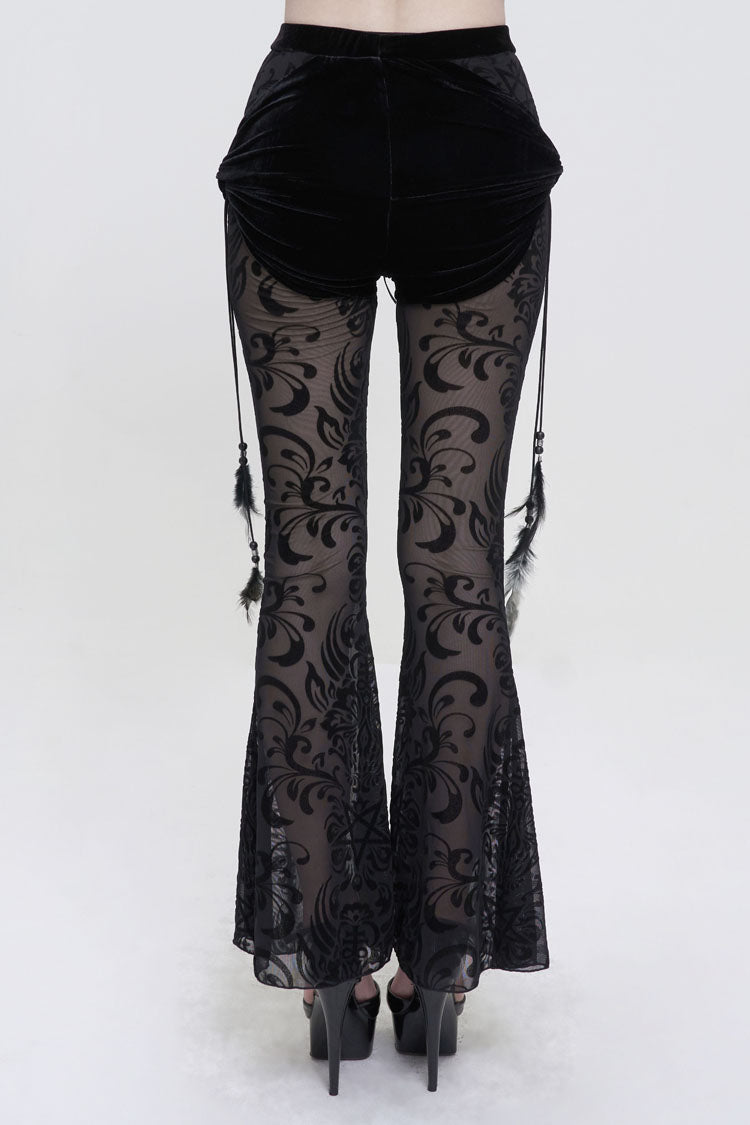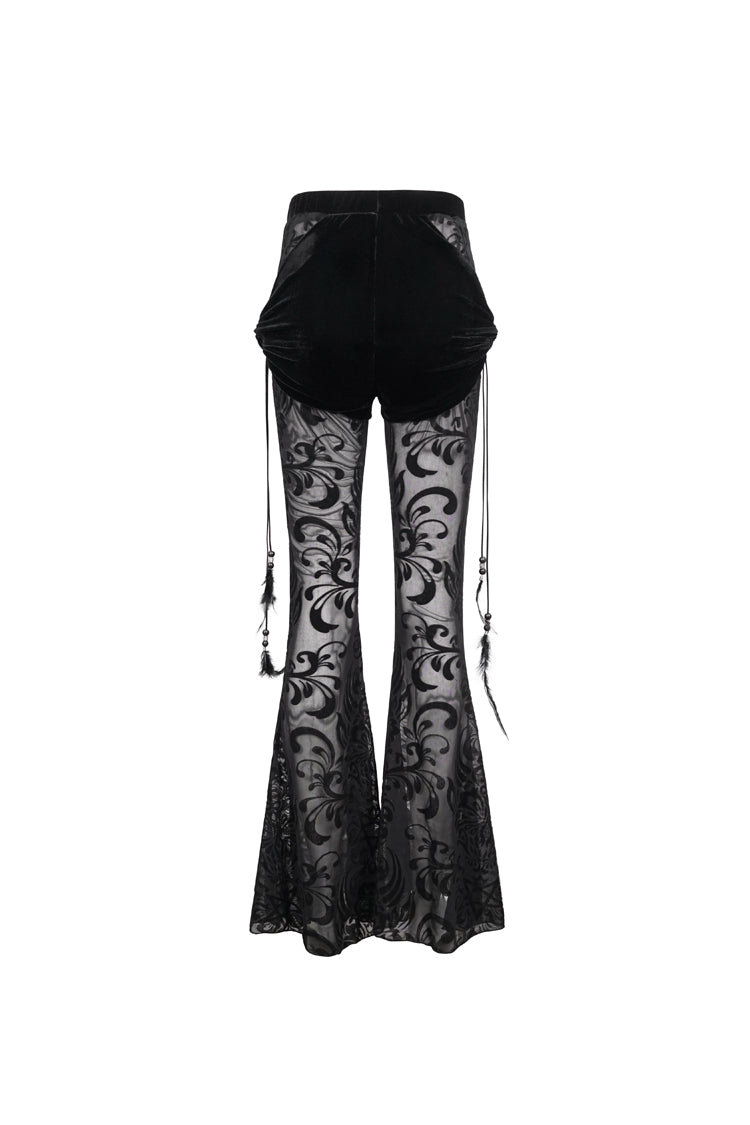 The high-grade dense velvet is twisted into the structure of shorts. The inside is made of flocked mesh to make long flared trousers, and feather pendants are hung at the side knots.