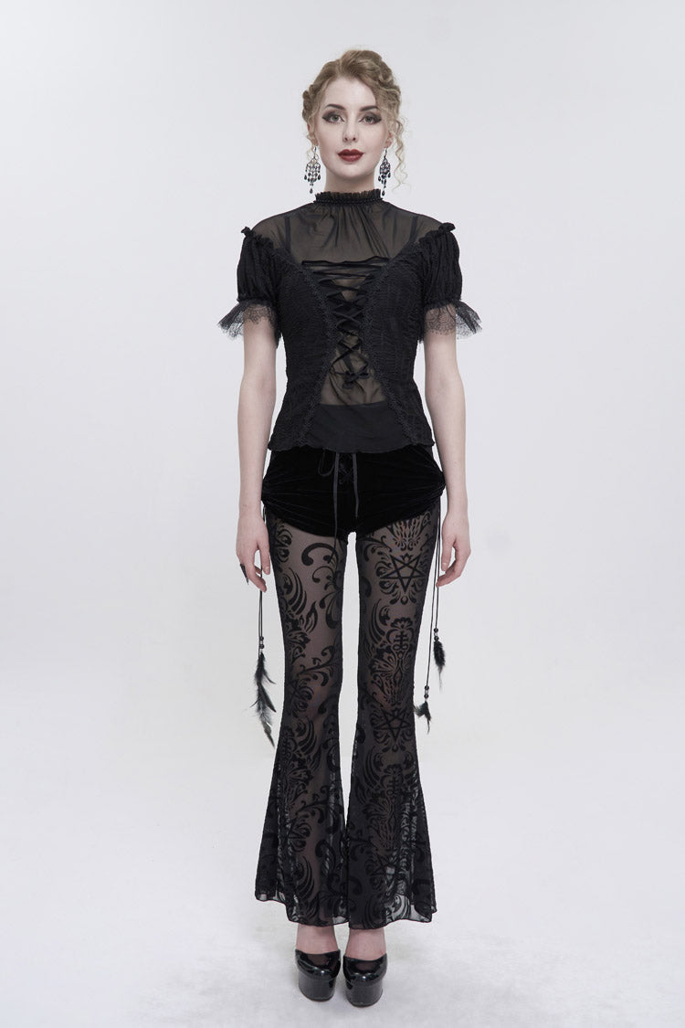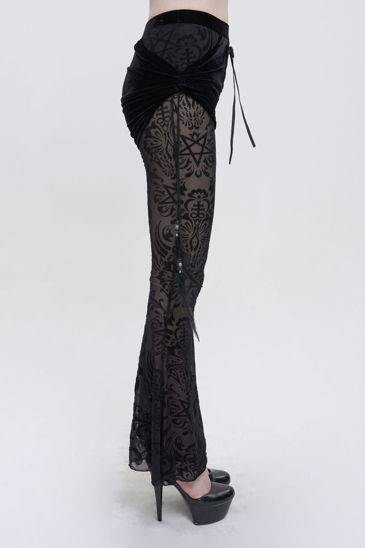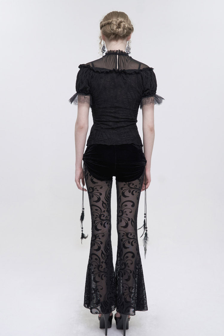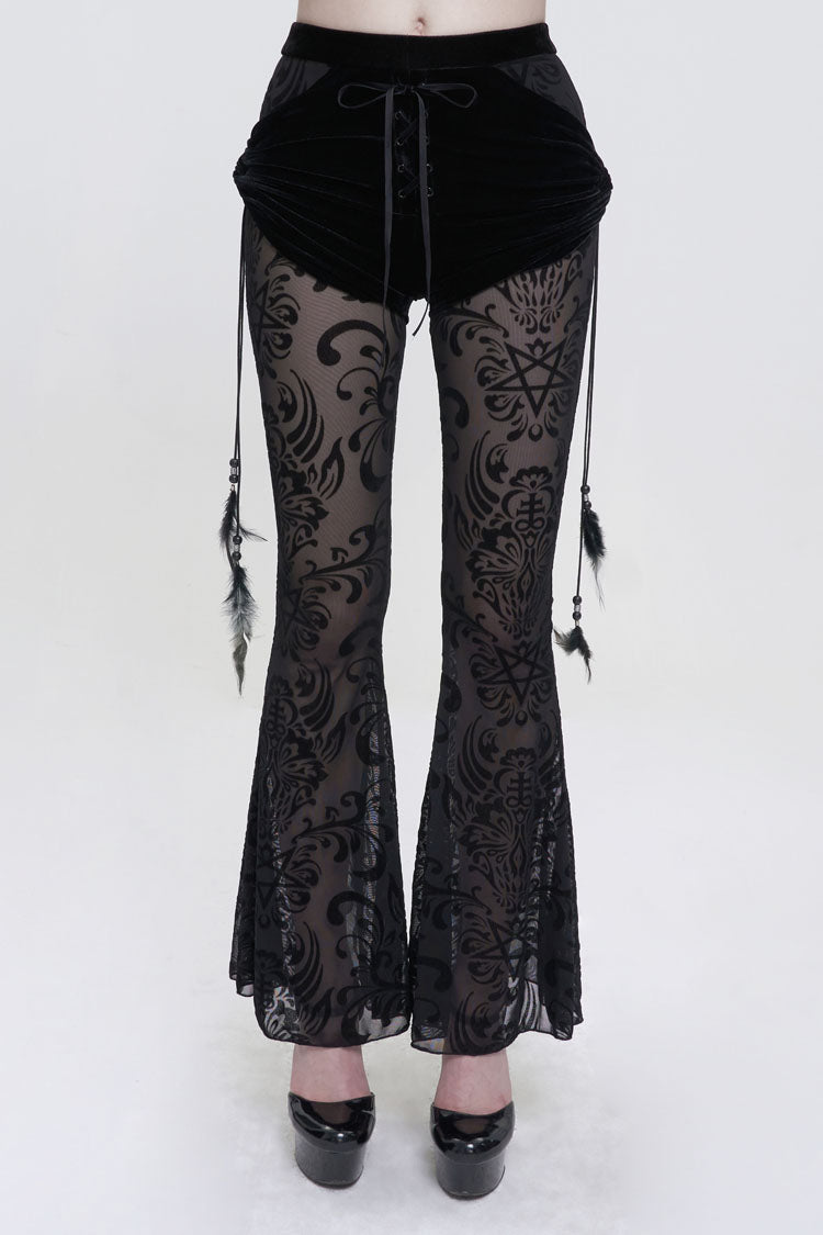 The high-grade dense velvet is twisted into the structure of shorts. The inside is made of flocked mesh to make long flared trousers, and feather pendants are hung at the side knots.