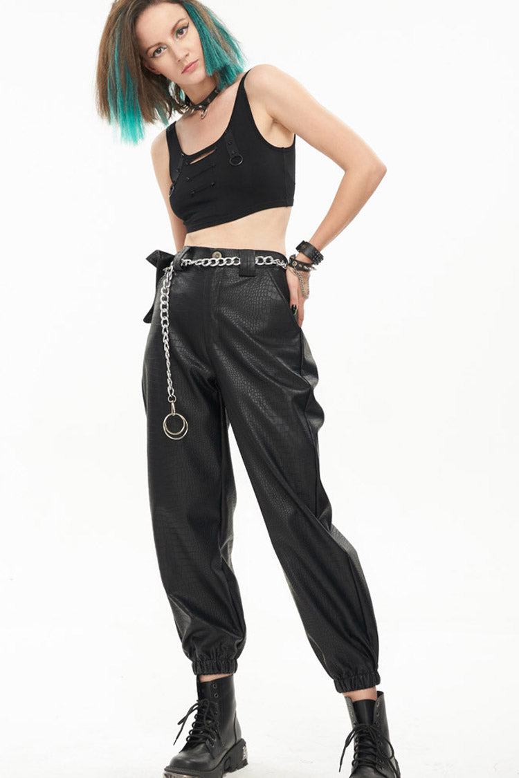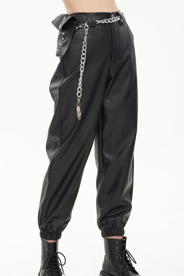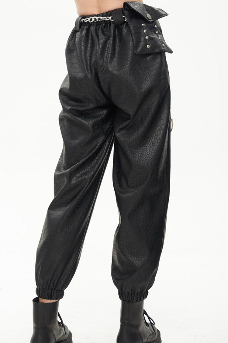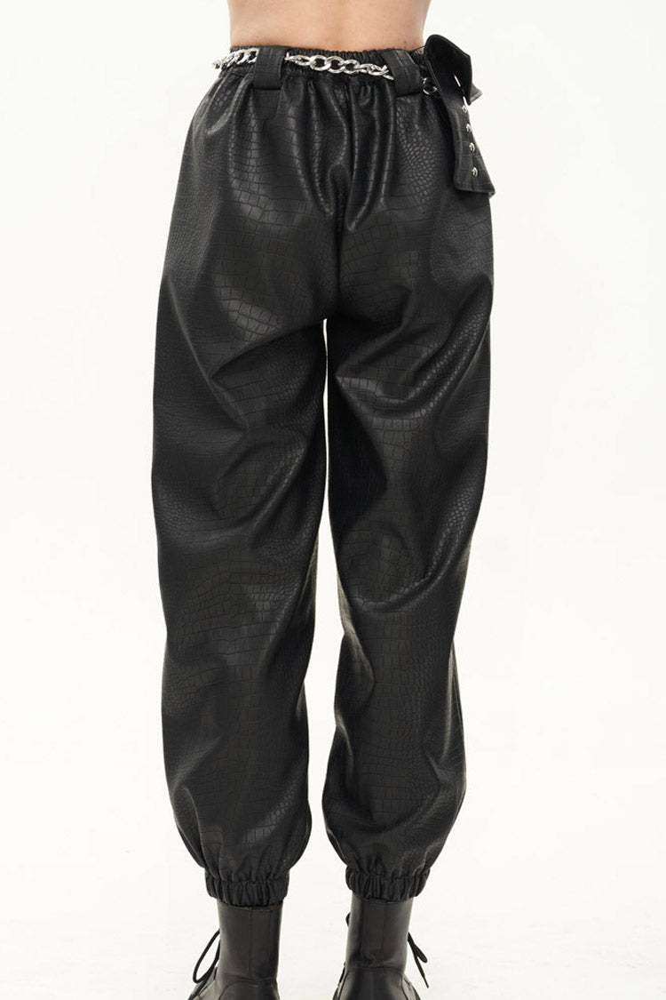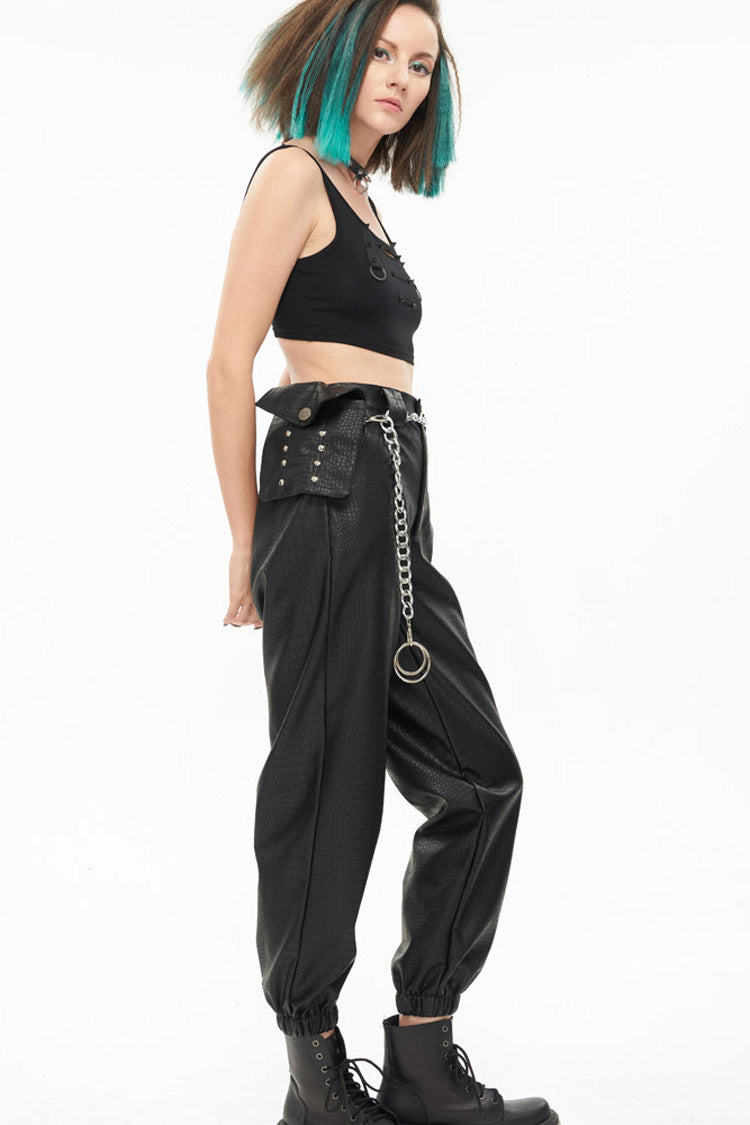 The whole piece is made of crocodile pattern leather, the elasticity of the waist can be adjusted, the waist is hung with a metal chain, the waist is hung with a small bag design, which can be disassembled, and the bag is designed with metal rivets.
