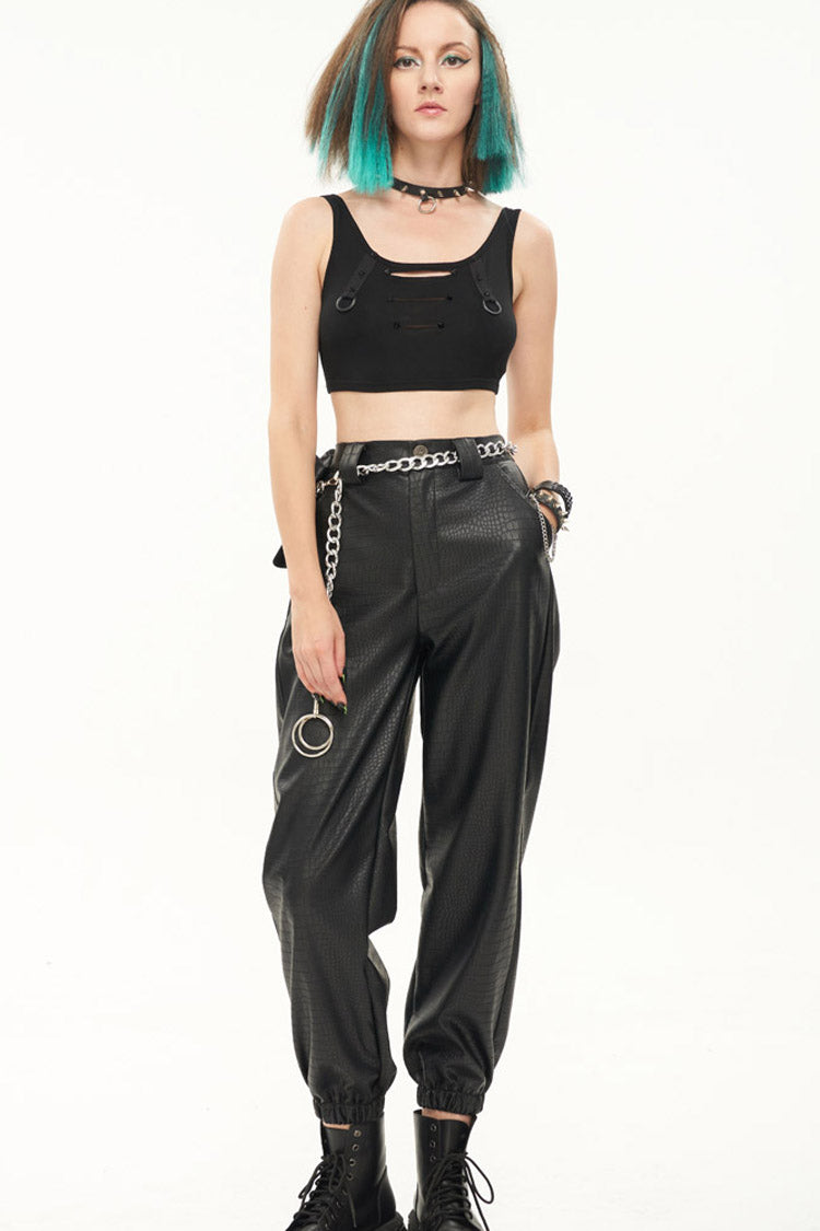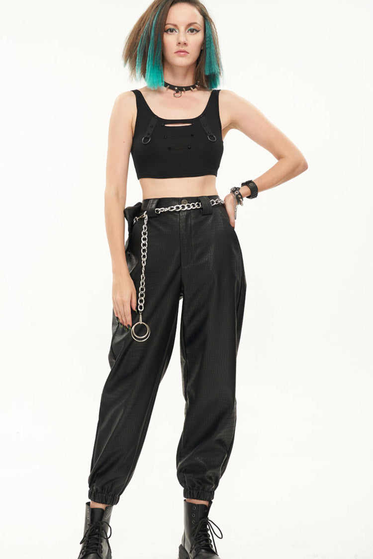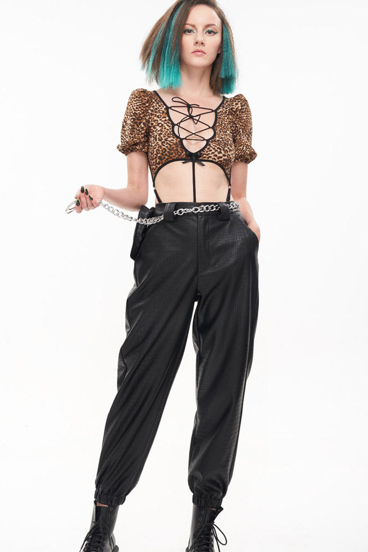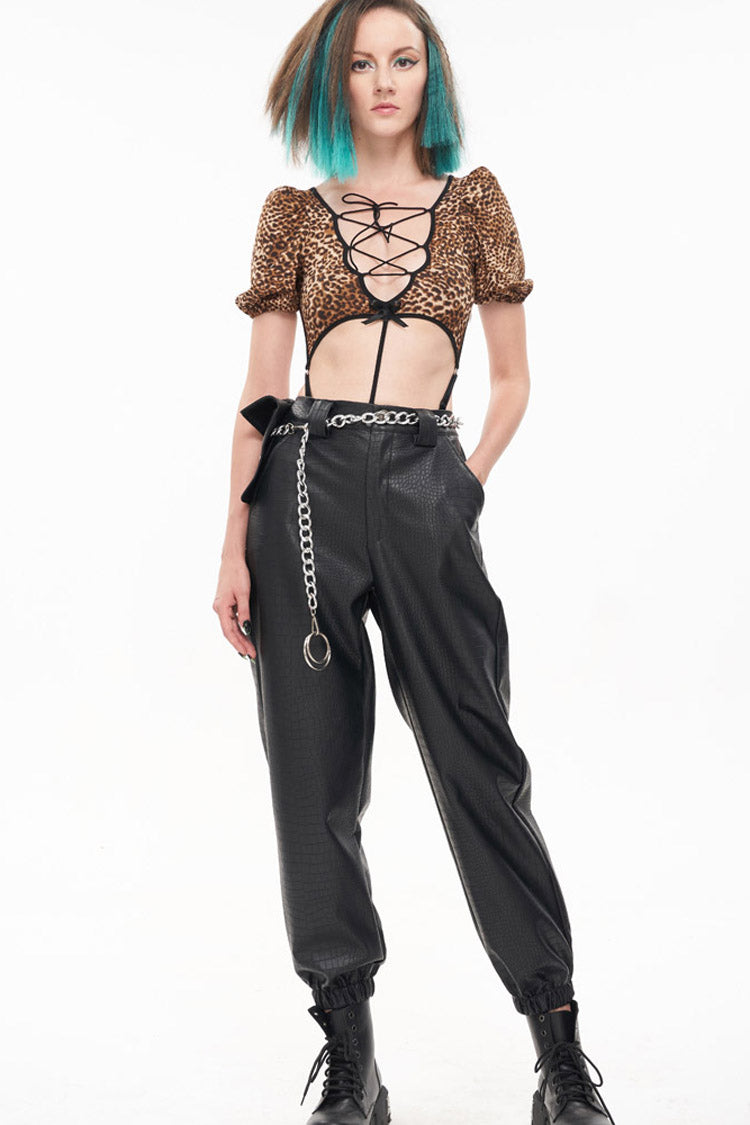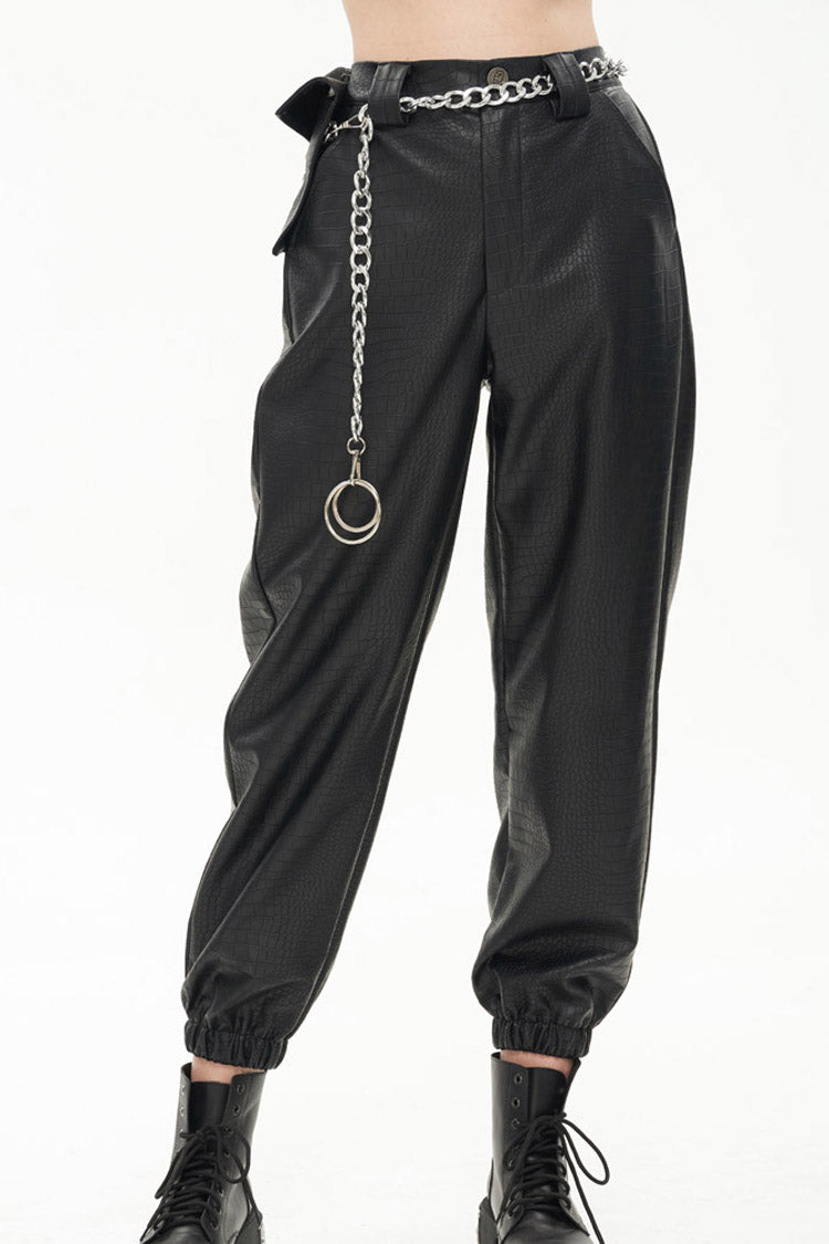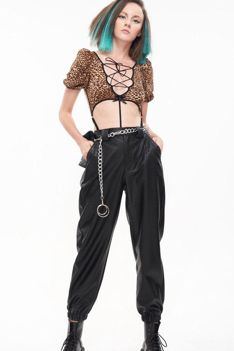 The whole piece is made of crocodile pattern leather, the elasticity of the waist can be adjusted, the waist is hung with a metal chain, the waist is hung with a small bag design, which can be disassembled, and the bag is designed with metal rivets.